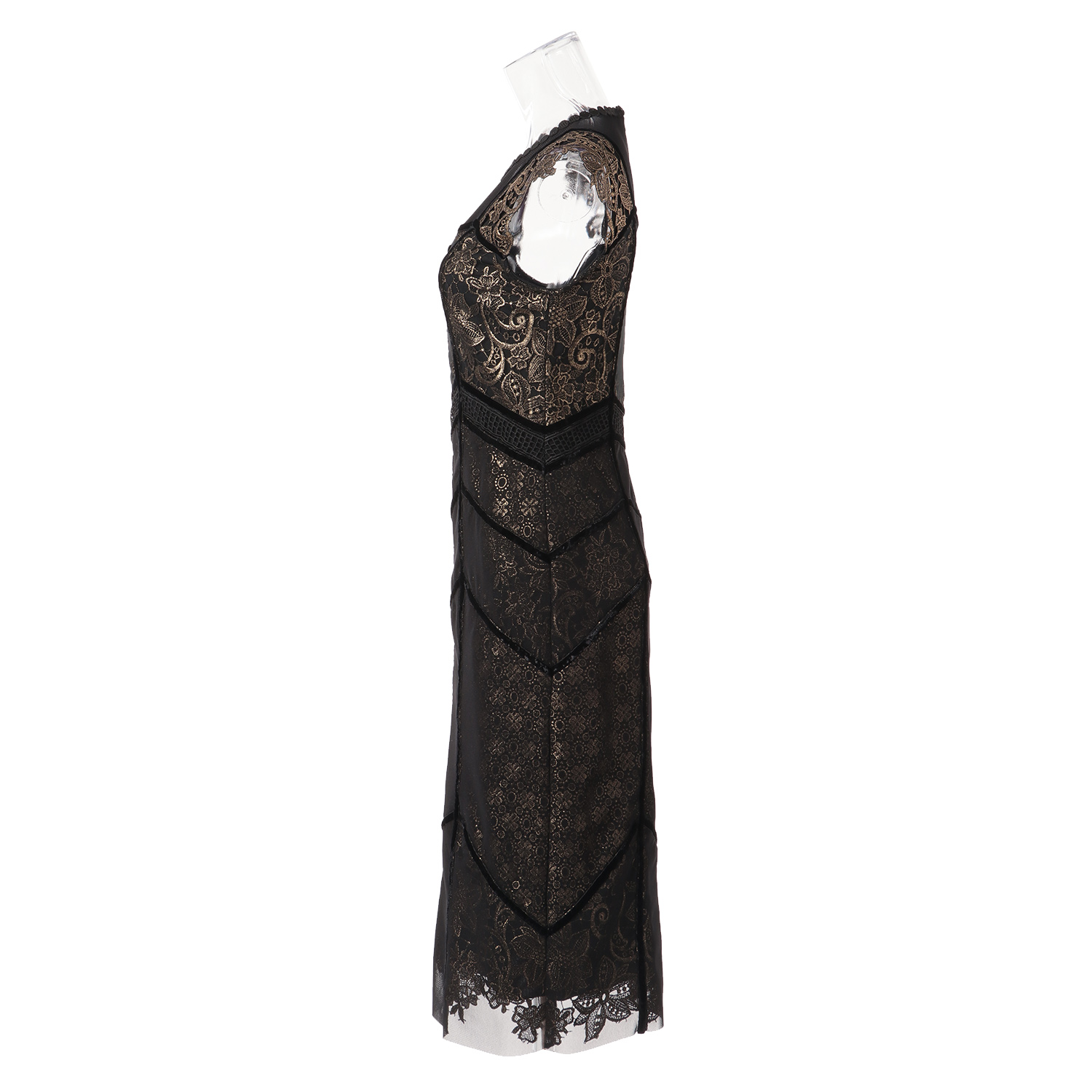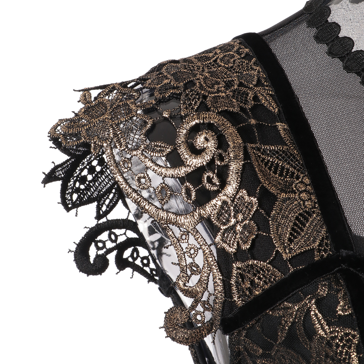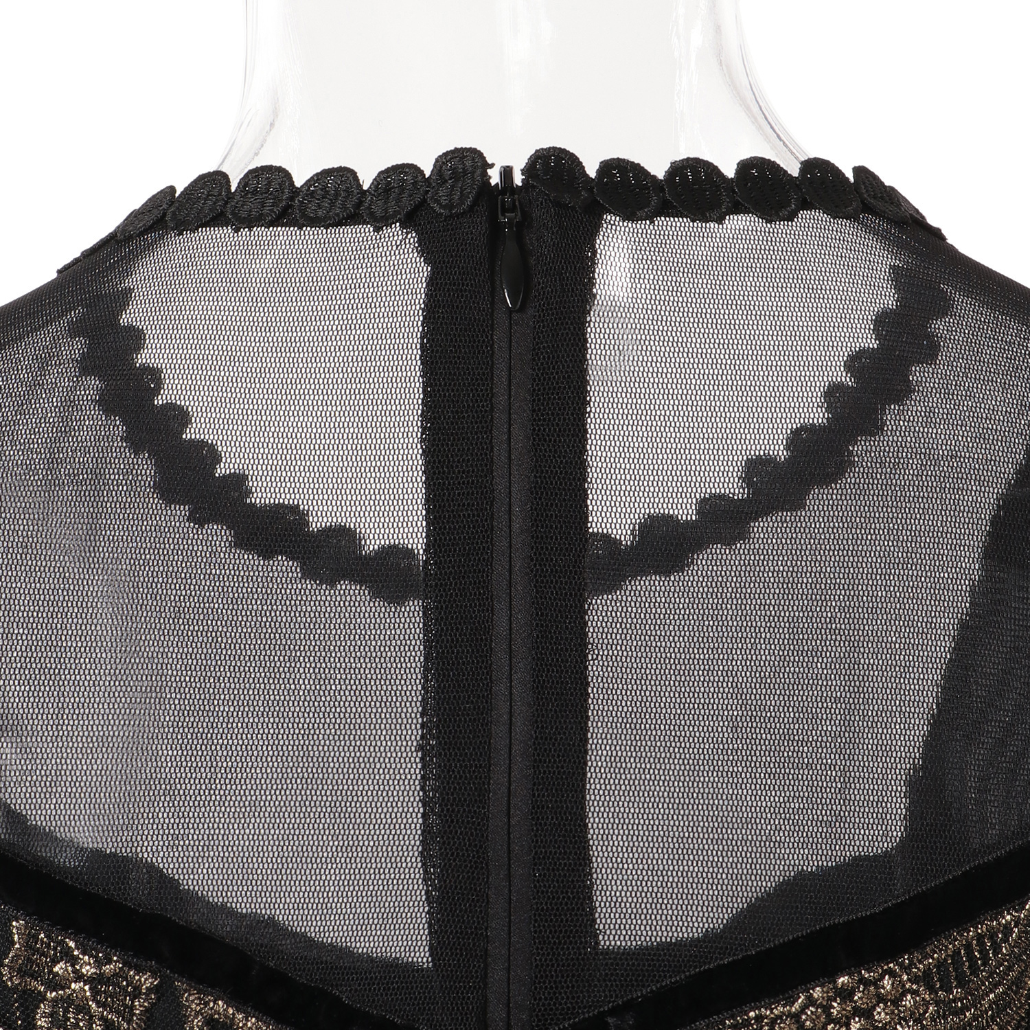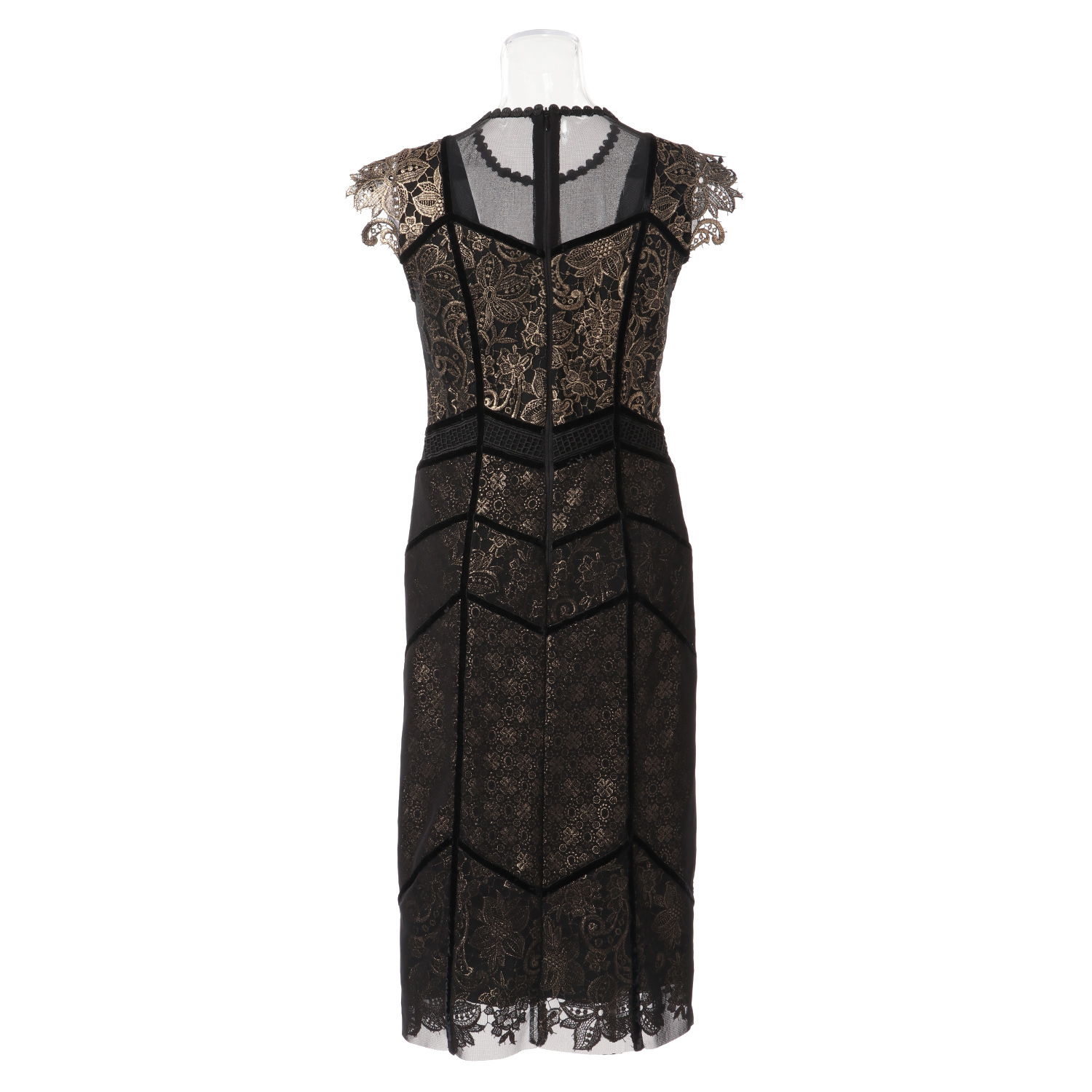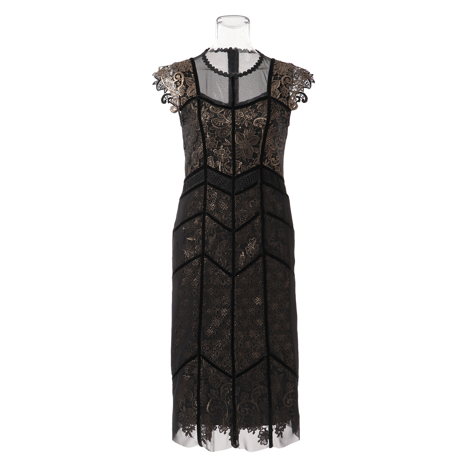 箔のレースを用いたノーブルな雰囲気漂うドレスです。細部にまで気品を感じられる繊細なディテールや、テープを配した個性的なルックスで圧倒的な存在感を放ちます。ジュエリーやレディライクなパンプスを取り入れた、華やかなパーティースタイルもおすすめです。