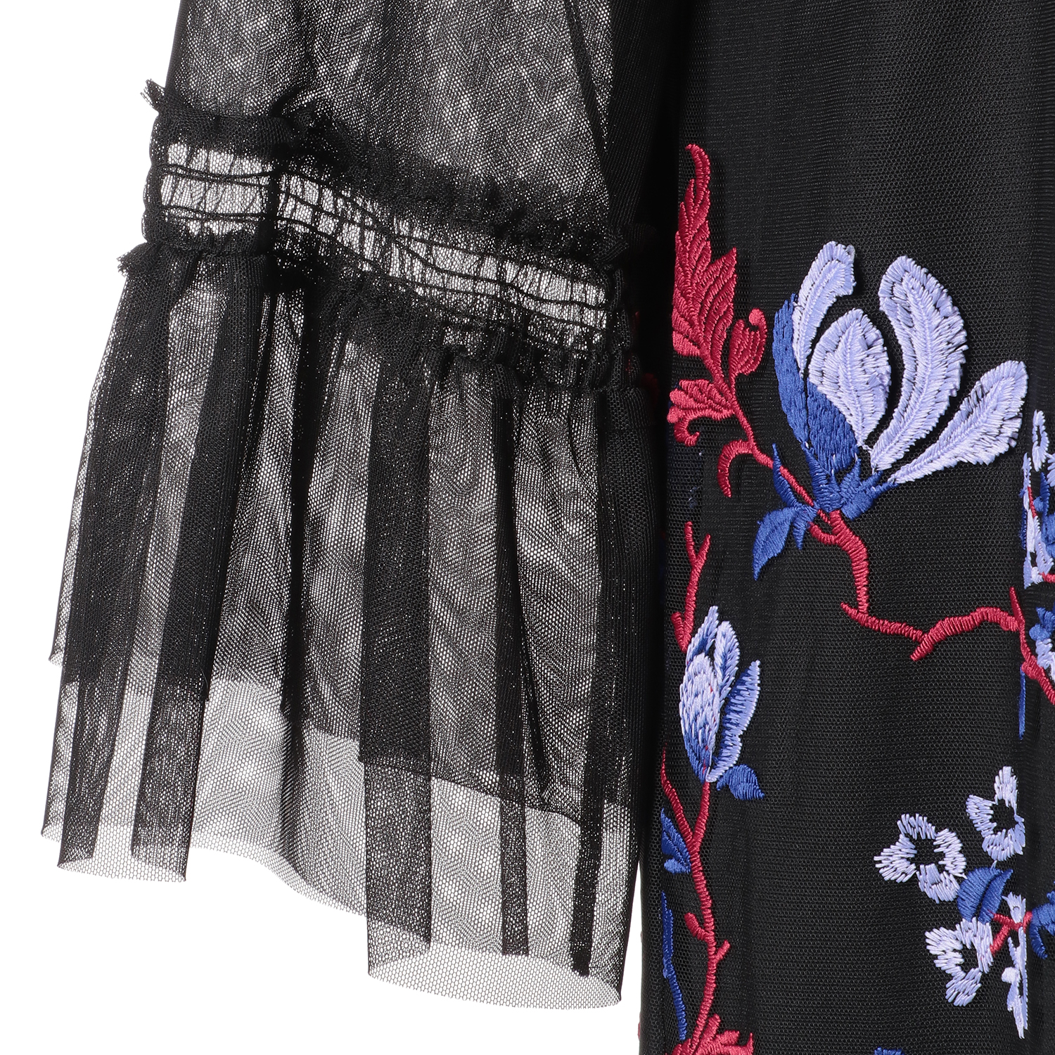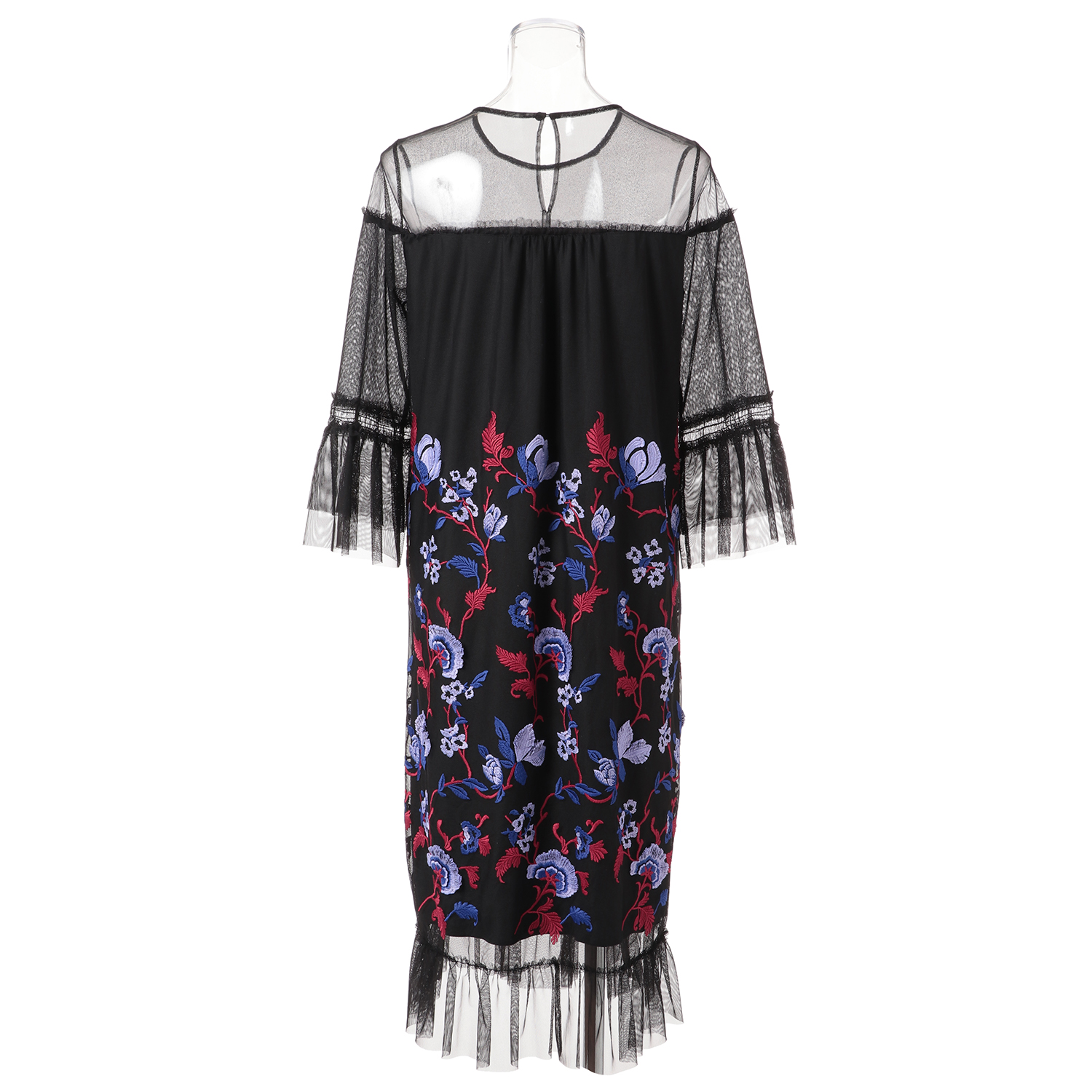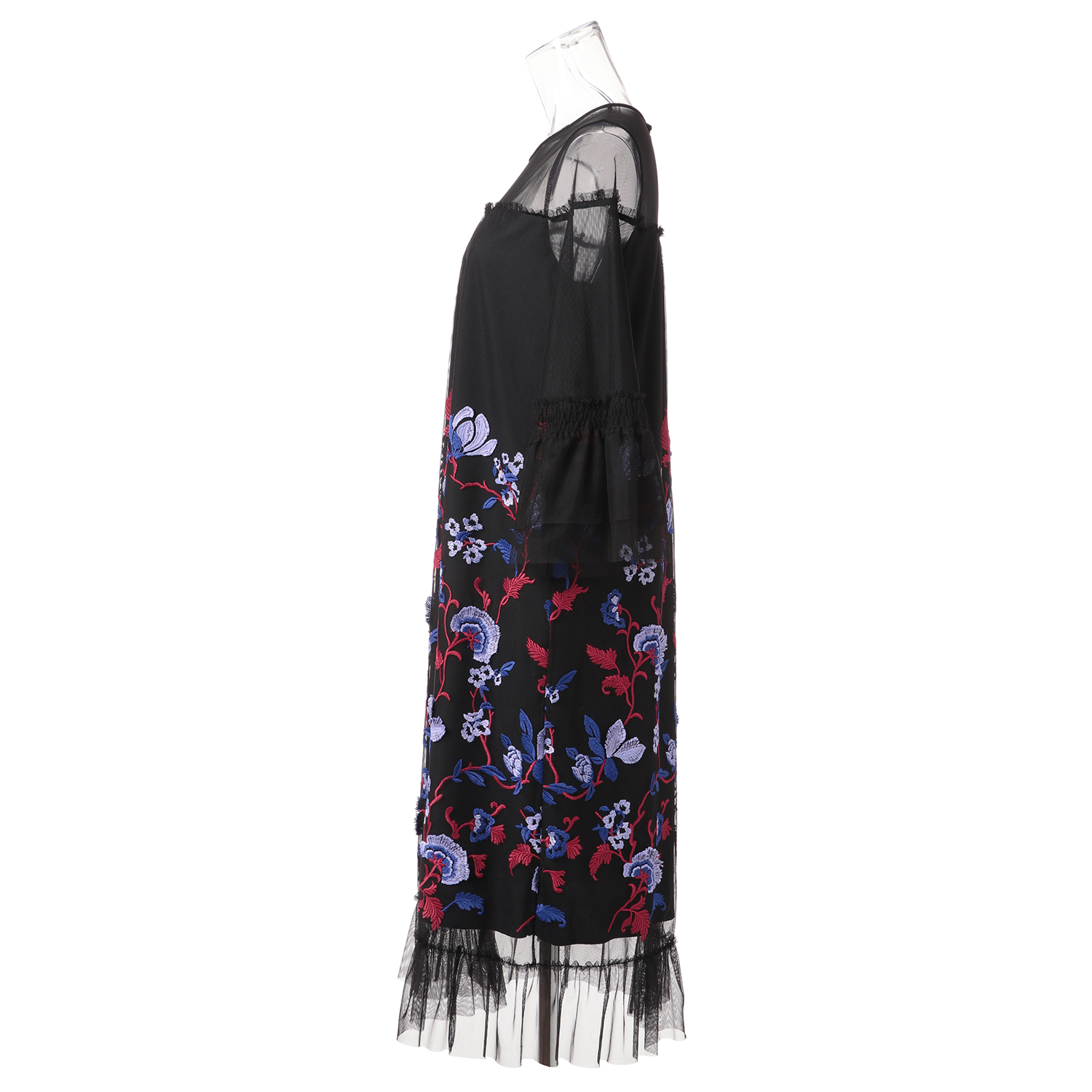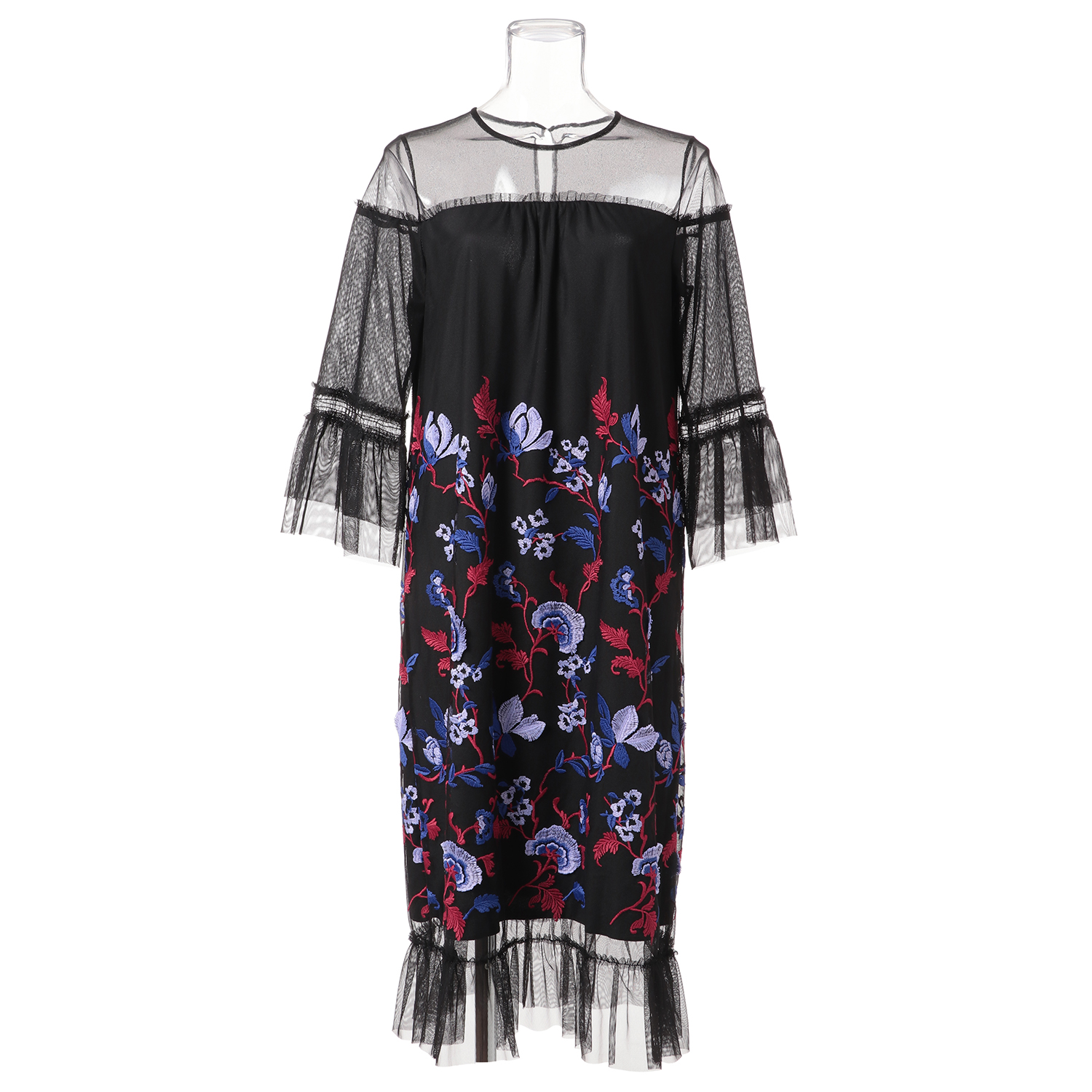 マグノリアとピオニーの花柄を立ち上がるように刺繍した、ストレッチチュールドレスです。コントラストの効いた配色使いが特徴的。首まわりや袖、裾の部分は素材ならではのシアー感を生かして、軽やかな印象に仕上げています。お食事やショッピングなどのおでかけにオススメのアイテム。