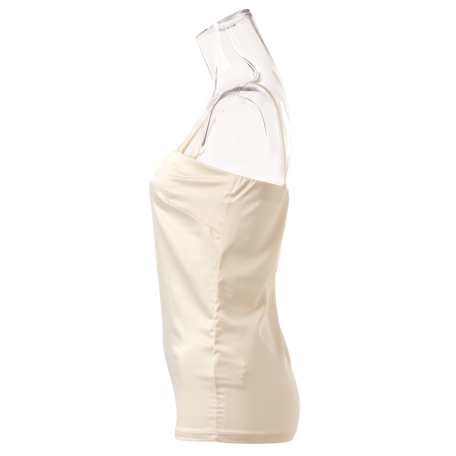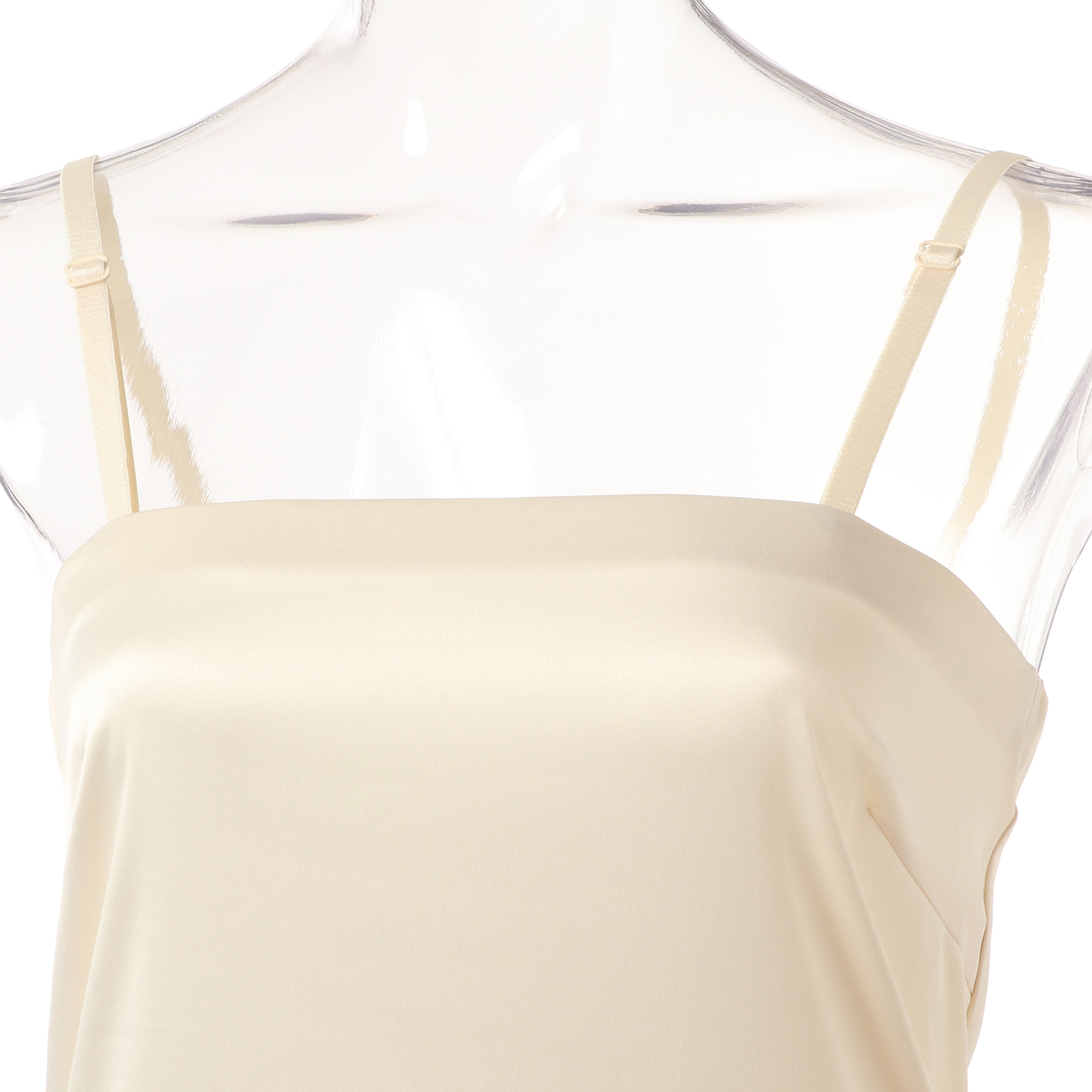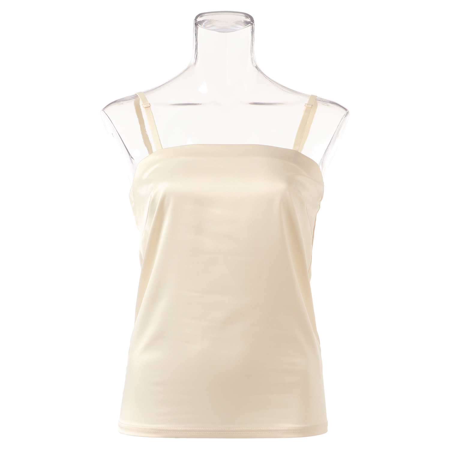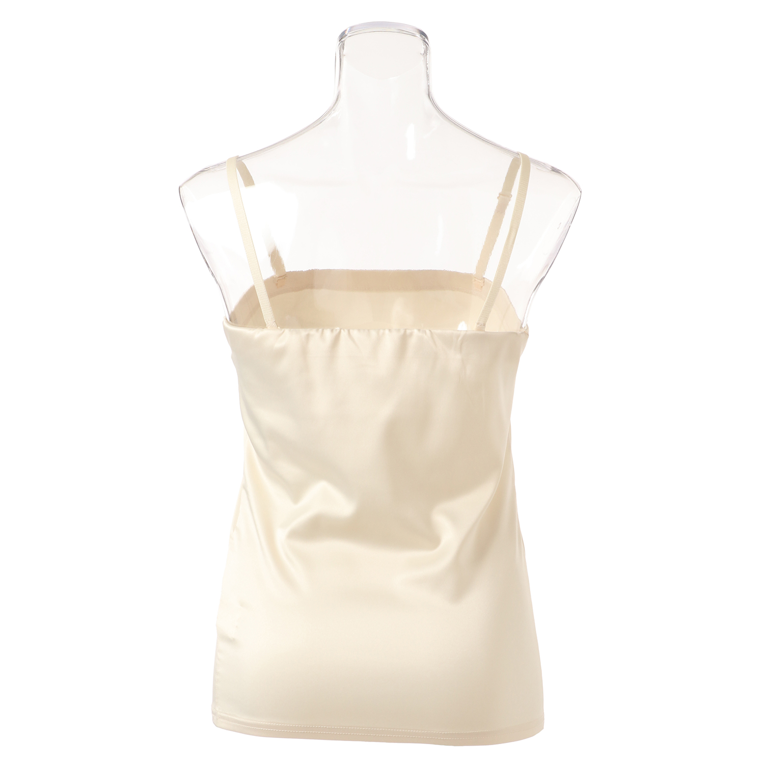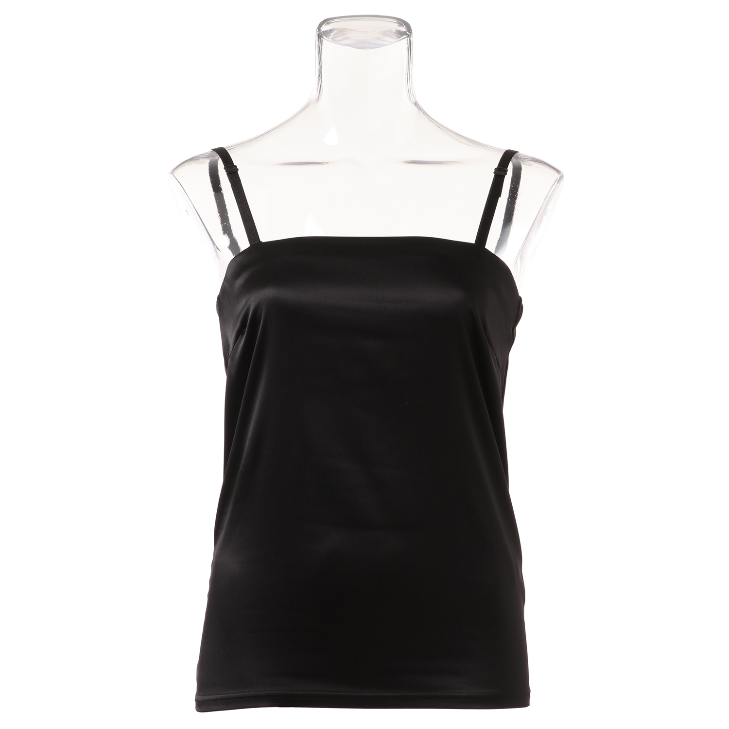 光沢の美しいサテン生地のキャミソールです。透け感のあるトップスやジャケットなどのインナー使いでもお洒落に決まる一枚。従来の着丈よりも少し長めにデザインしており、安心して着用できます。ストレッチ性にも優れていて、着心地も良好。
