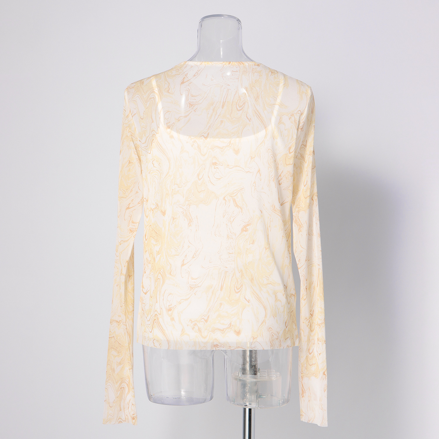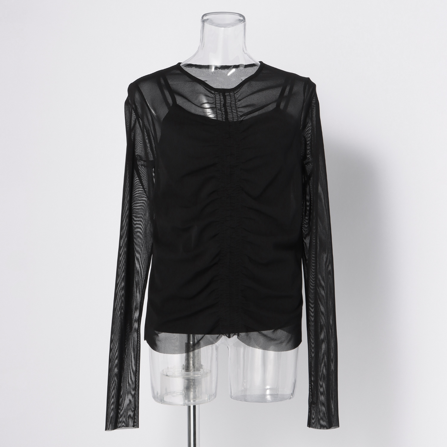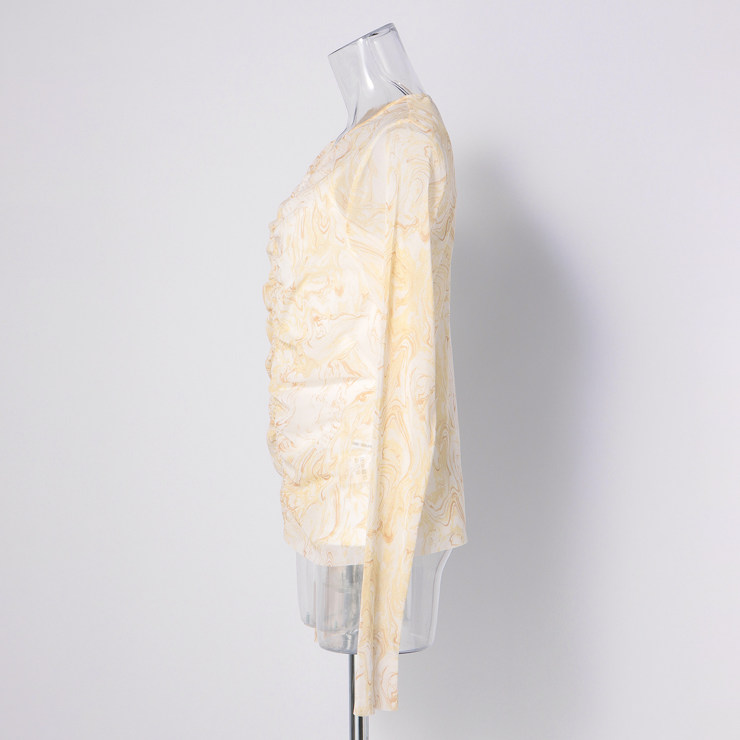 透け感のある1枚仕立てのネット素材で仕上げたブラウス。前立てにギャザーを寄せて気品あふれる雰囲気を演出しております。暑い時期には適度な肌見せをお楽しみいただき、寒くなってきたらインナーを魅せたレイヤードスタイルがオススメ。着合わせやすいブラックと個性が際立つマーブル柄の2パターン展開です。