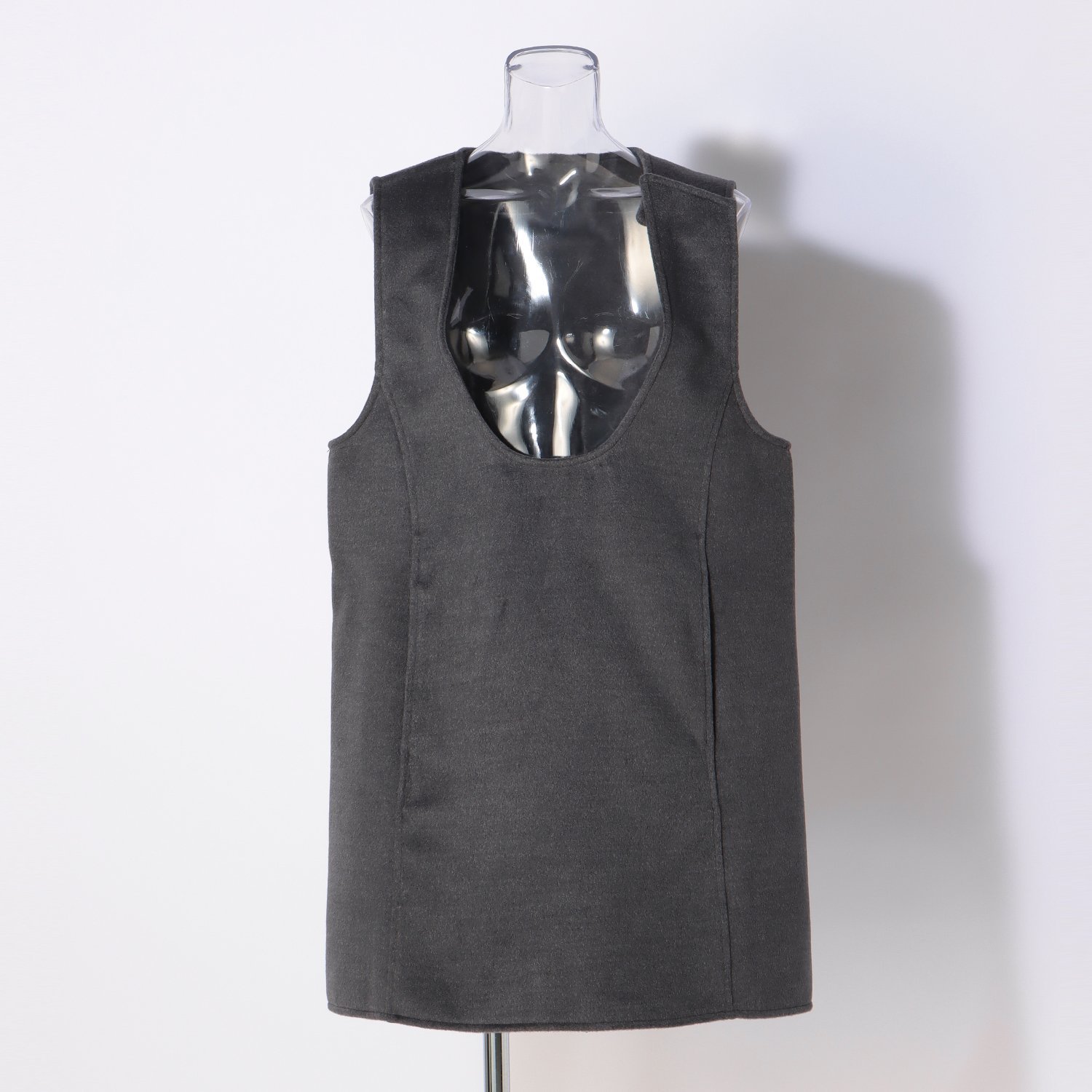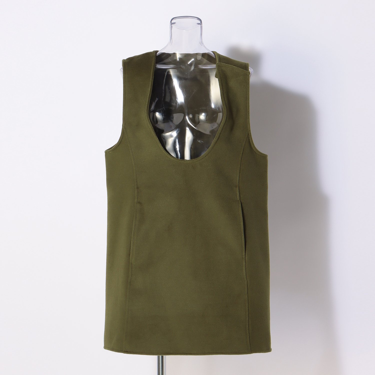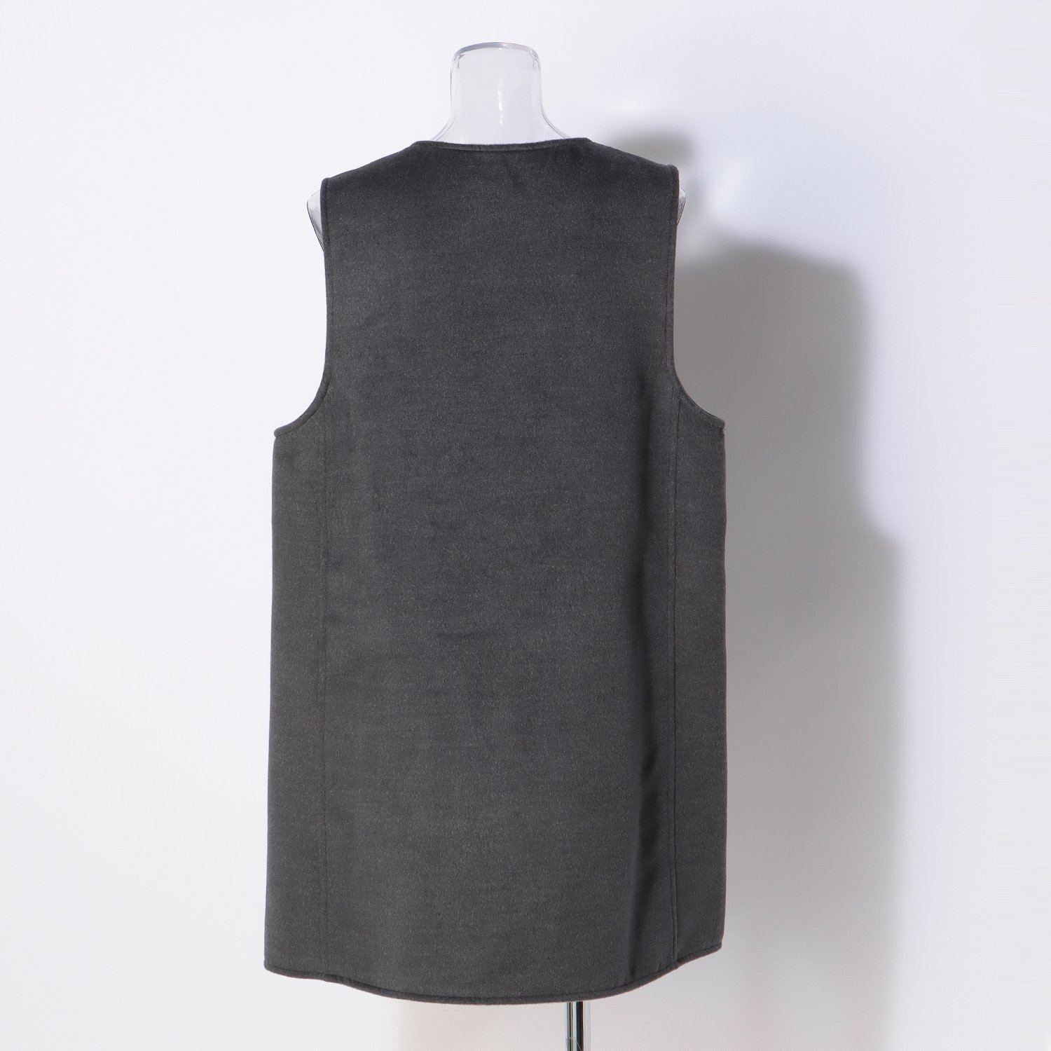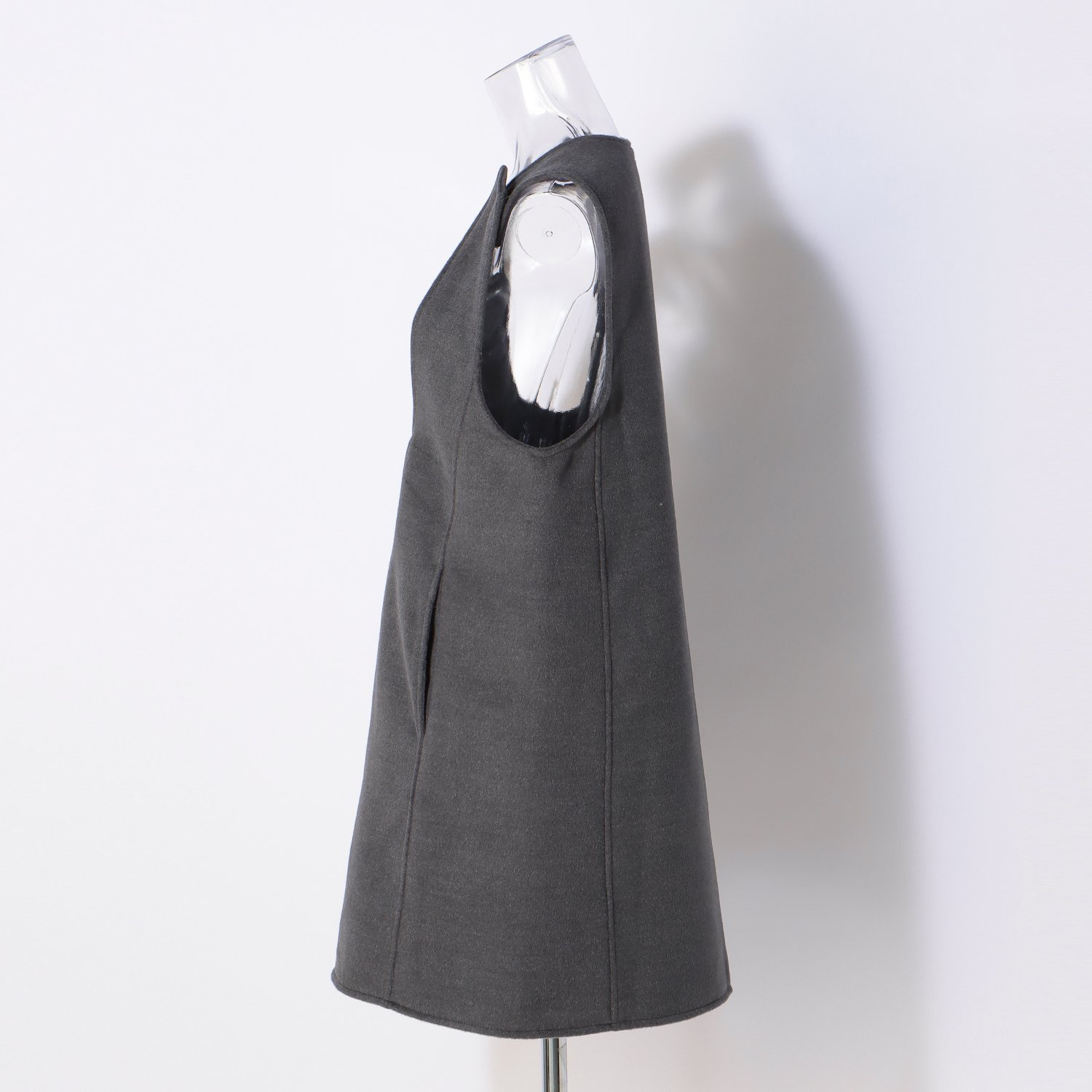 体型を拾わないゆったりとしたボクシーなシルエットのベスト。合わせるインナーを変えて多様な着こなしをお楽しみいただけます。肩部分がダブルスナップ仕様で簡単に着脱できるのが魅力。フロントの両サイドには便利なスラッシュポケットを備えました。