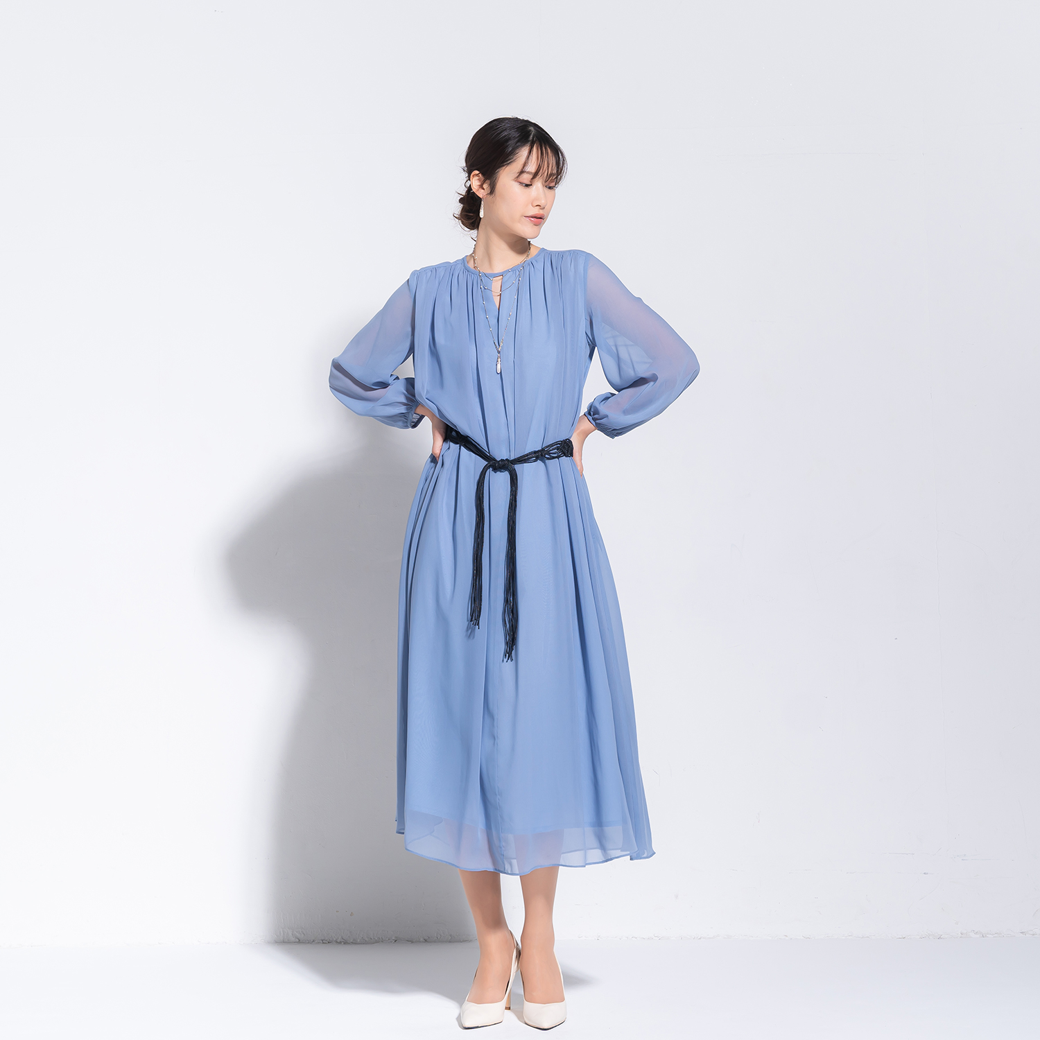 シーンを問わずに着用できるシフォンギャザーのロングドレス。アジアンノットの黒いベルトがセットになっており、付け外しでシルエットの変化が楽しめる1着です。パウダリータッチで薄いシフォンの繊細なギャザーが華奢見えを叶え、上品な印象を後押し。身体のラインを拾わないストレスフリーのAラインシルエットは、ベルトをしてウエストにポイントを付けることでスタイルアップ効果のあるシルエットに変わります。アクセサリーや小物の映えるすっきり美しいデザインで、デイリーはもちろん、華やかなシーンやフォーマルシーンにもおすすめのアイテムです。