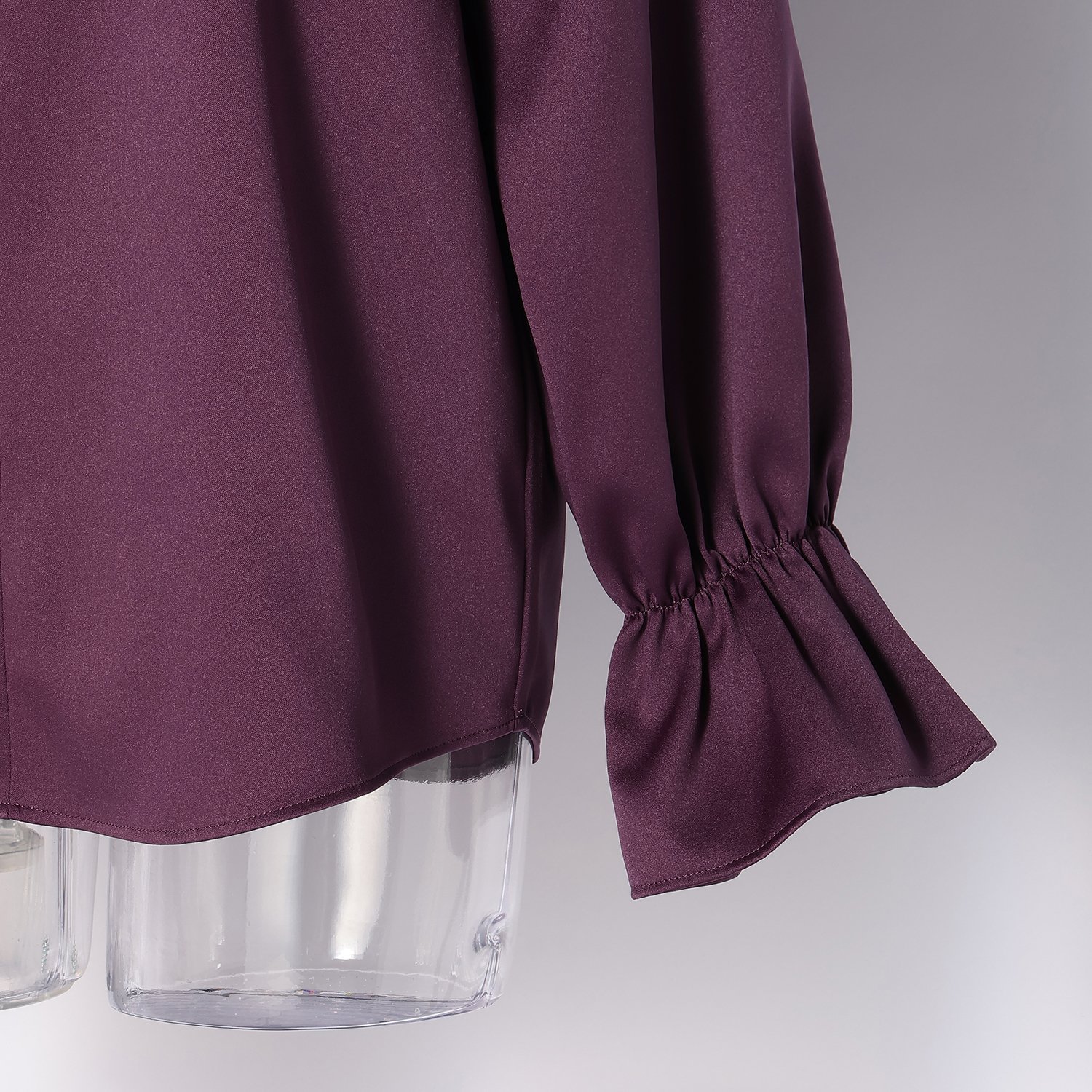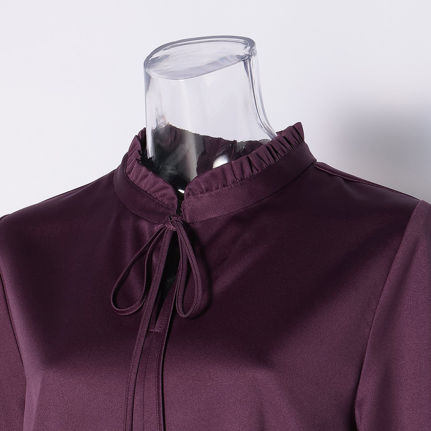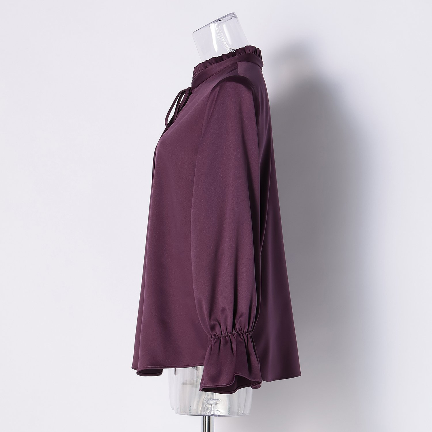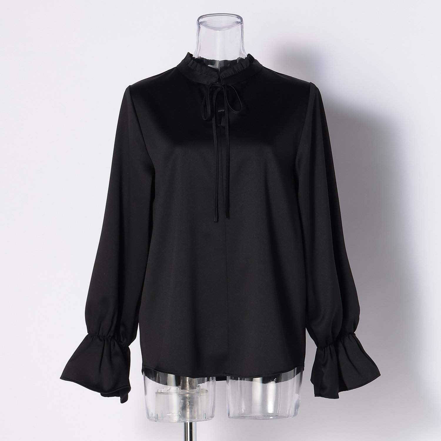 前後でスタイリングをお楽しみいただける、2WAY仕様のブラウス。さりげない襟のフリルや細めのリボン、ひらりとしたスリーブデザインなど、ディテールにもこだわりが詰まった1着です。華やかな光沢感と、ストレッチ性の快適な着心地を両立したストレッチサテン生地を使用しました。しわになりにくい特徴を持つので、お出かけからオフィスシーンまで、デイリーな活躍が期待できます。