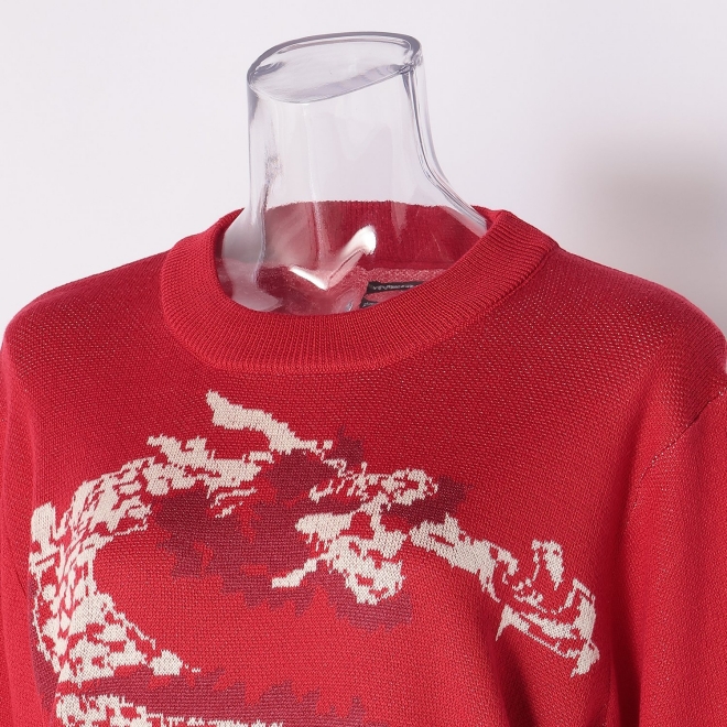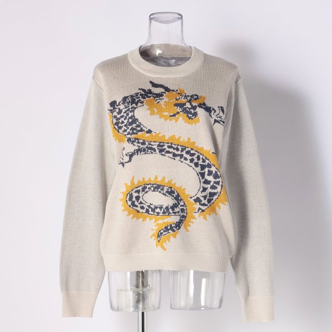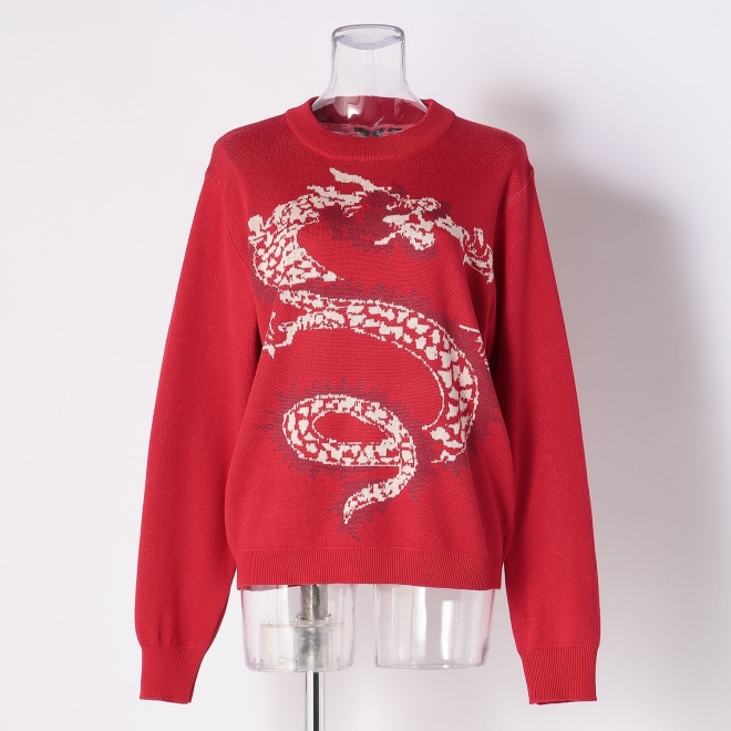 VIVIENNE TAMを象徴するドラゴンモチーフをジャカードで大胆に表現したニット。カラーによってドラゴンの配色が異なっており、気分や好みに合わせてお選びいただけます。様々なアイテムに合わせやすい、ベーシックなクルーネックデザインを採用しました。柔らかい肌触りで着心地も良く、ワードローブにおすすめです。