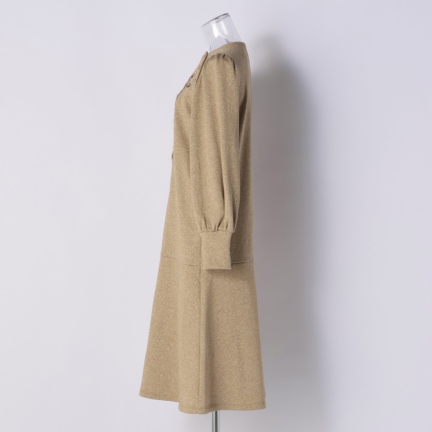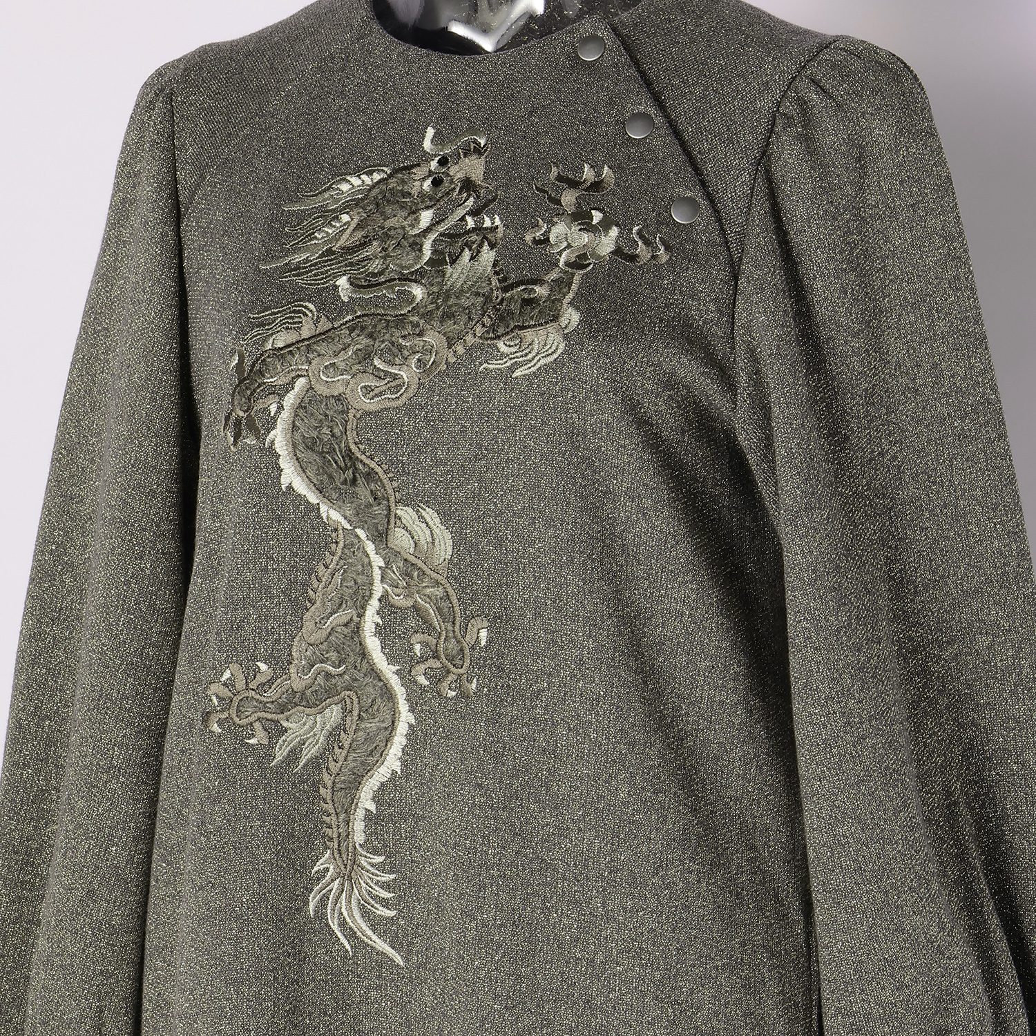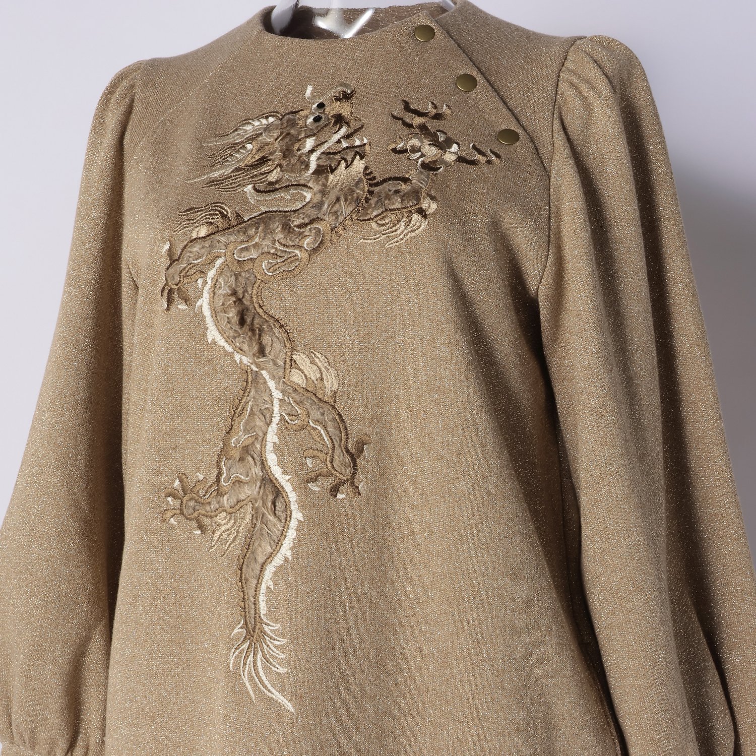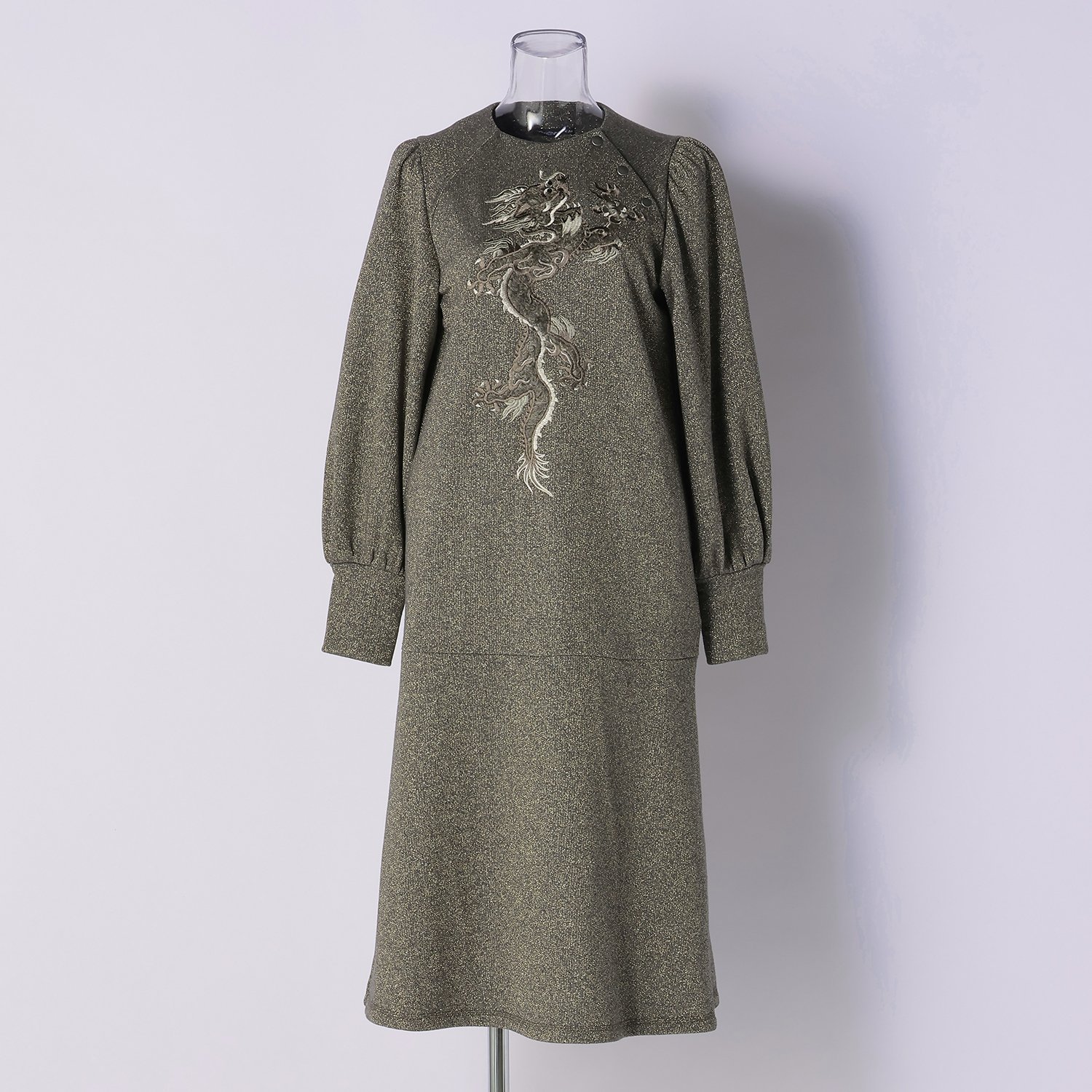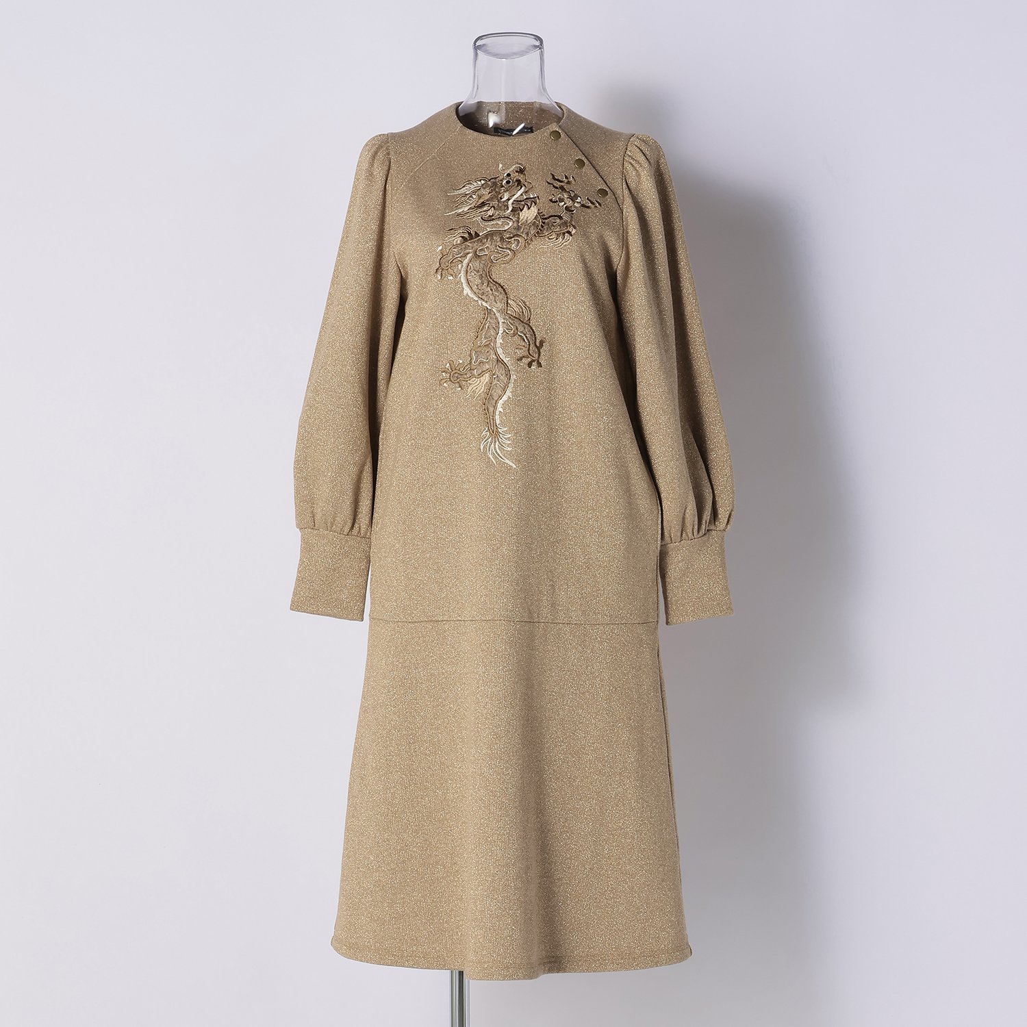 フロントにファーと刺繍を組み合わせた立体的なドラゴンモチーフをあしらったワンピース。低めの位置で切り替えを施し、ゆったりとしたシルエットに仕上げました。肩付近に配したボタンや、程よくボリュームのあるスリーブデザインもポイントです。さらっと1枚で着用するだけで、洗練されたスタイリングが完成します。