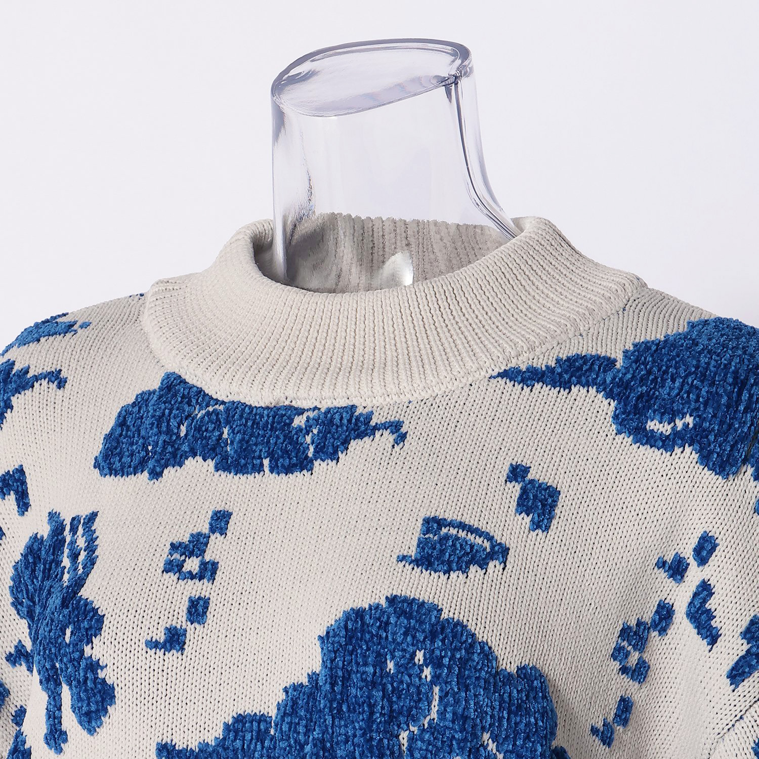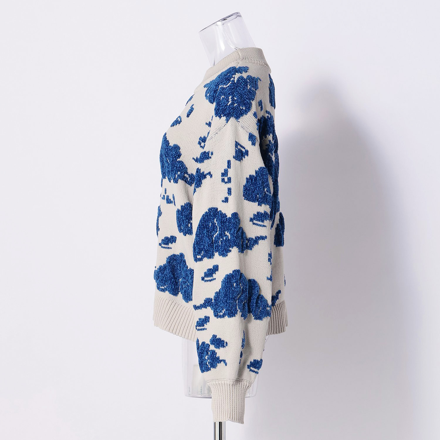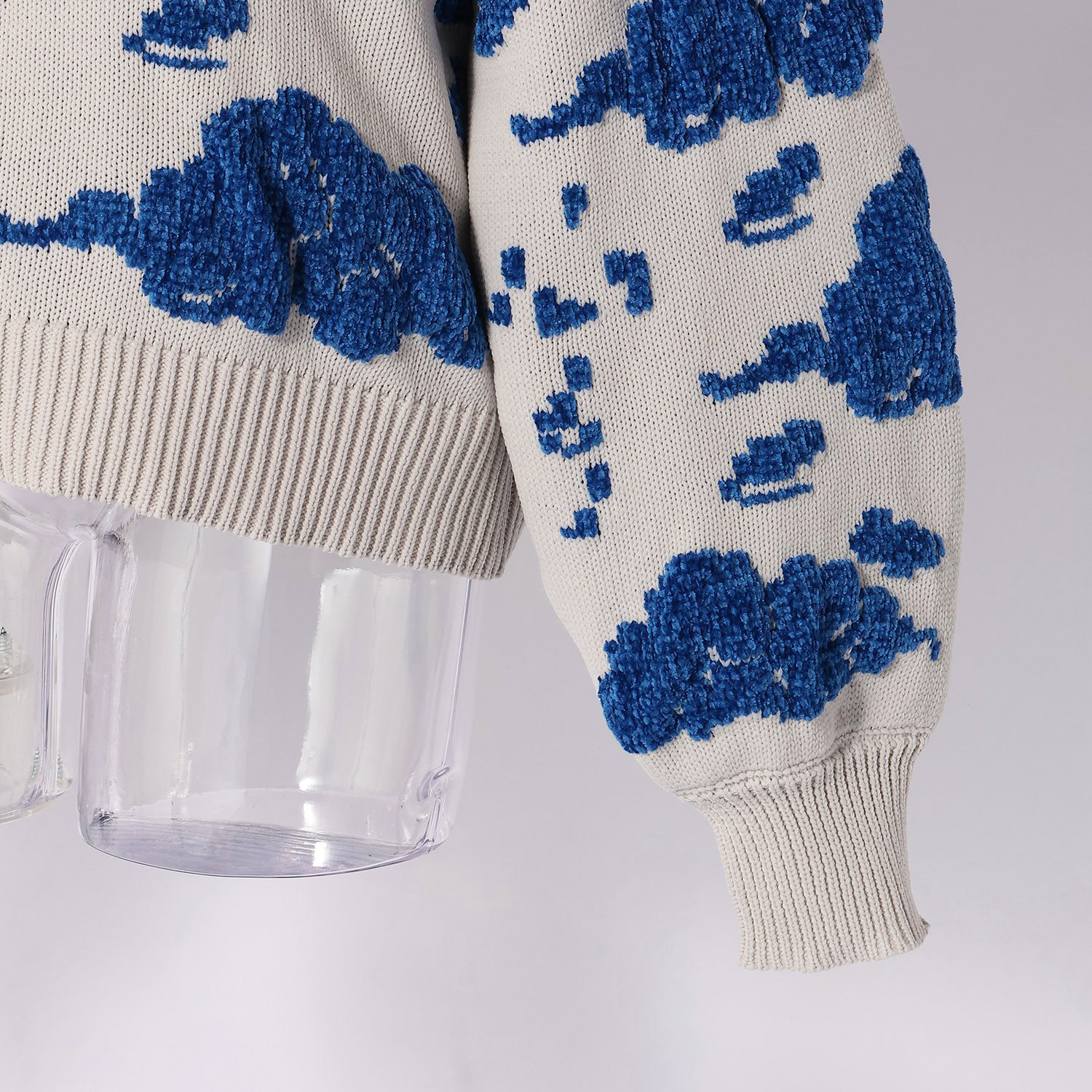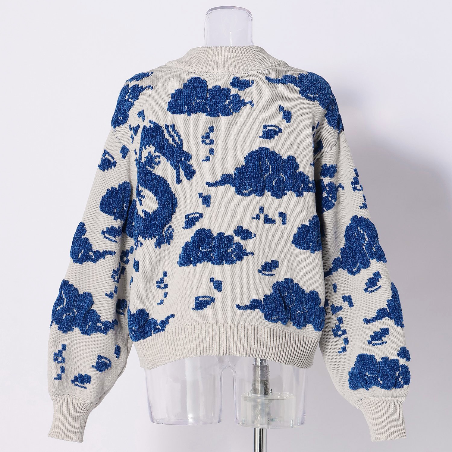 弾力性のあるニット生地を使用し、モール糸でドラゴンと雲を表現したプルオーバーニット。柄部分はジャガード編みならではのふくらみが特徴で、立体的なデザインが存在感を放ちます。襟や裾周りなどはリブ編みでシルエットを引き締め、リラックスしながらもクリーンな印象に。シンプルなスカートやボトムスに合わせて、スタイリングの主役として着こなすのがおすすめです。