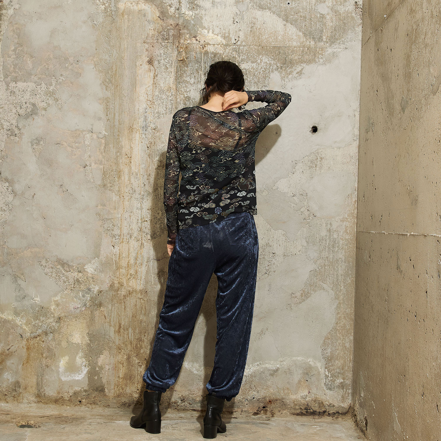 皇帝の衣装からインスピレーションを受けたブラウス。胸元を駆けるドラゴンのモチーフが視線を集める、アーティスティックなデザインに仕上げました。すっきりとご着用いただける長めの着丈で、こなれたスタイリングができるのも魅力的なポイントです。季節を問わずに着こなせるネット素材で、1枚でコーディネートの主役になるアイテムです。