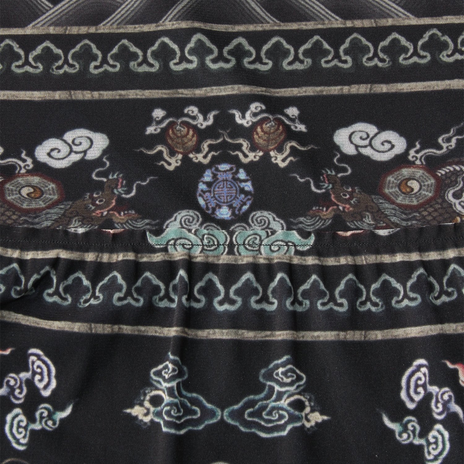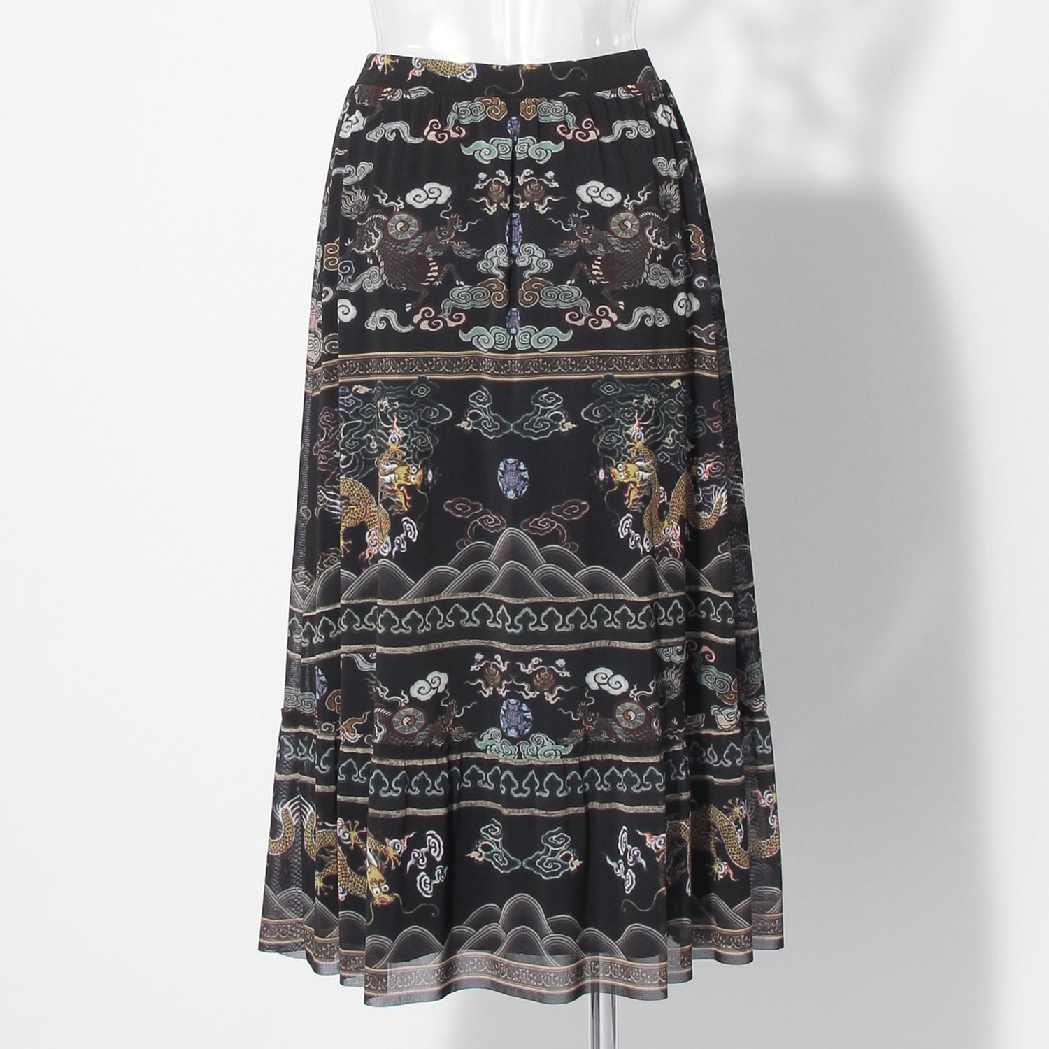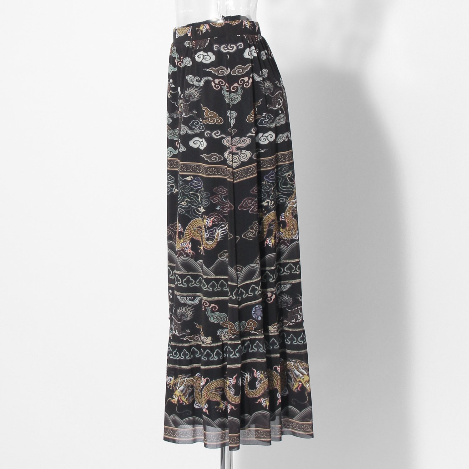 視線を奪う、唯一無二のモチーフスカート。皇帝の衣装からインスピレーションを受け、悠々と泳ぐドラゴンをプリントで表現しました。極力ハギを入れずにすっきりと仕上げることで、柄が活きる華やかなデザインに。同シリーズのブラウスと合わせて、セットアップで着こなすのもおすすめです。
