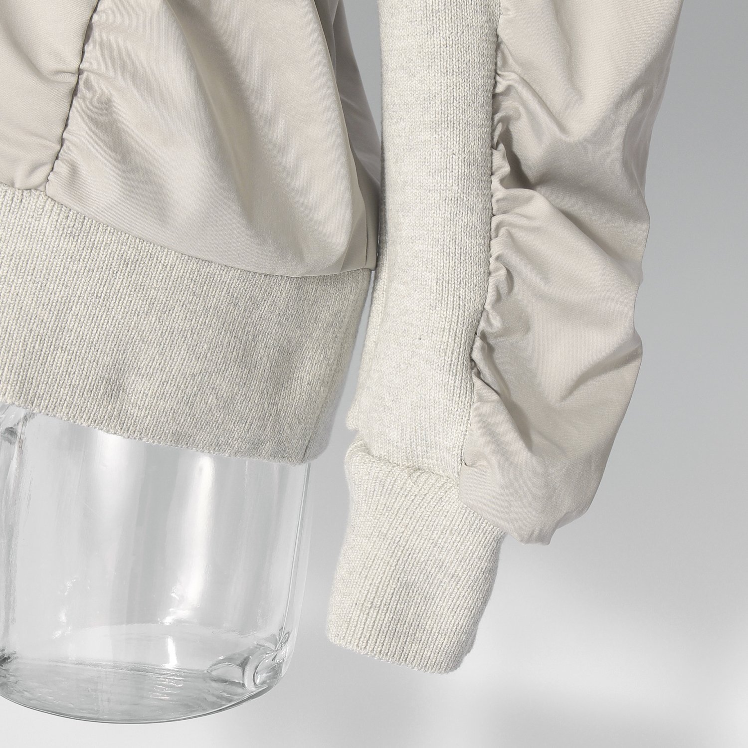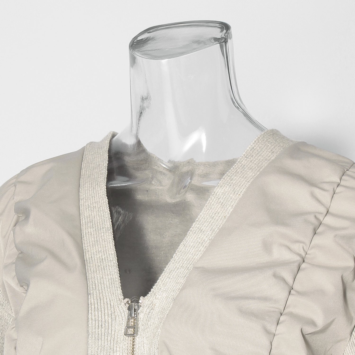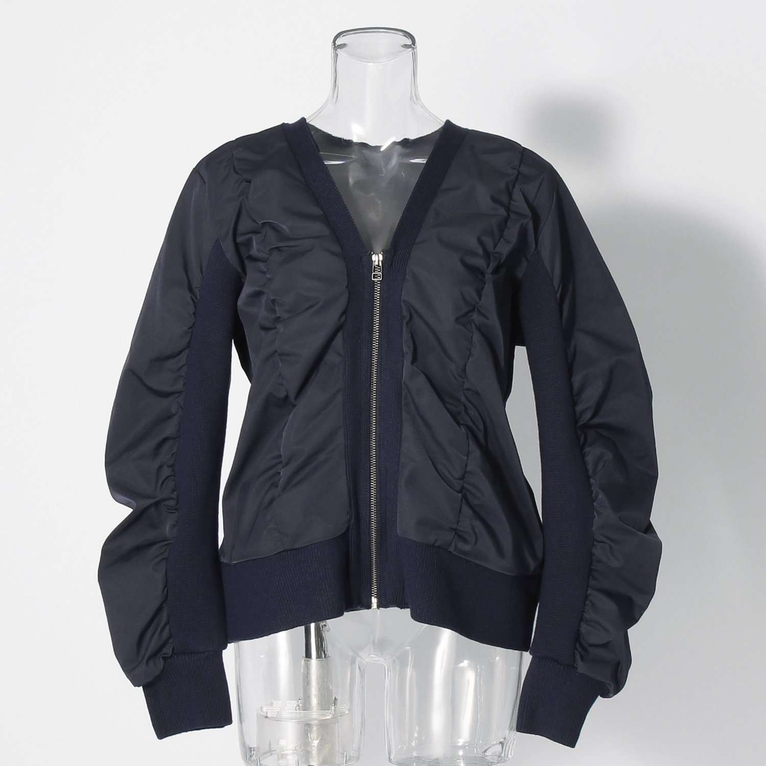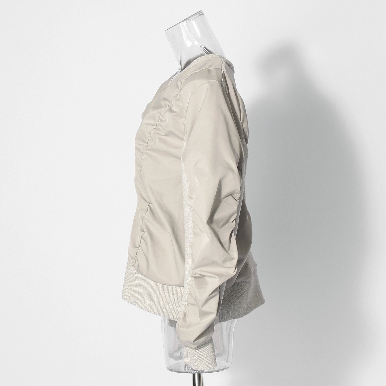 ハリのあるポリエステル素材とミラノリブニット生地をドッキングしたブルゾン。フロントのギャザーがアクセントになりながらも、柔らかな肌当たりが嬉しい1着です。袖にもディテールを入れて立体感をプラスし、奥行きのあるスタイリングを叶えてくれます。