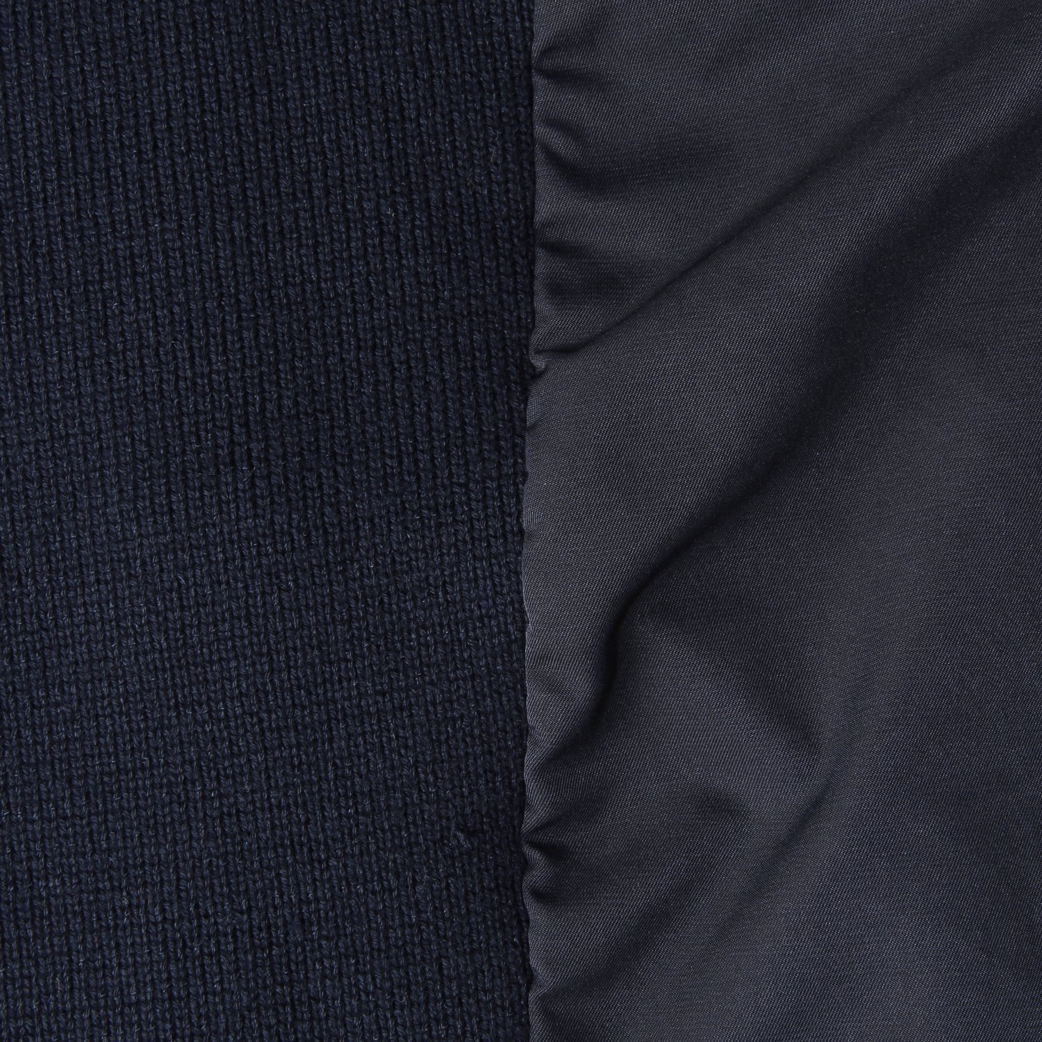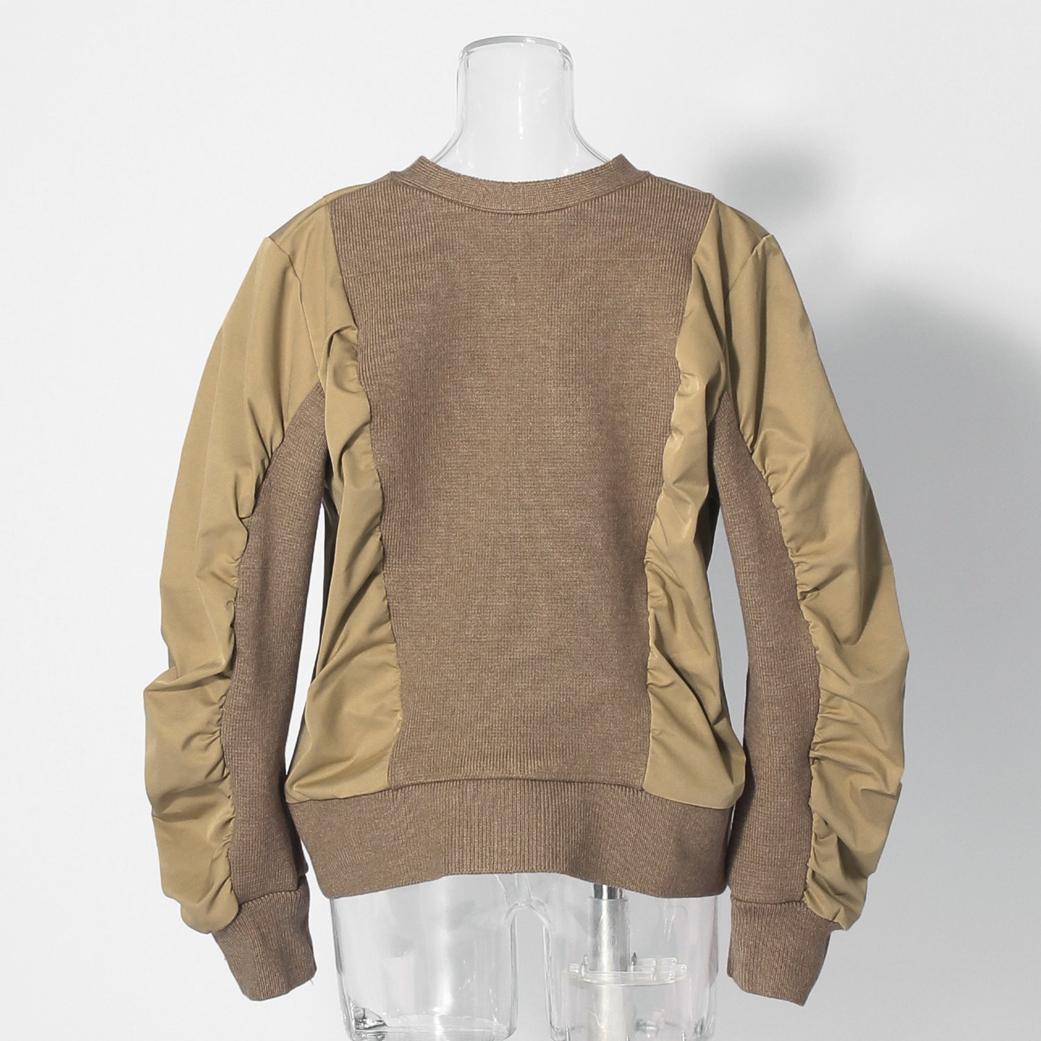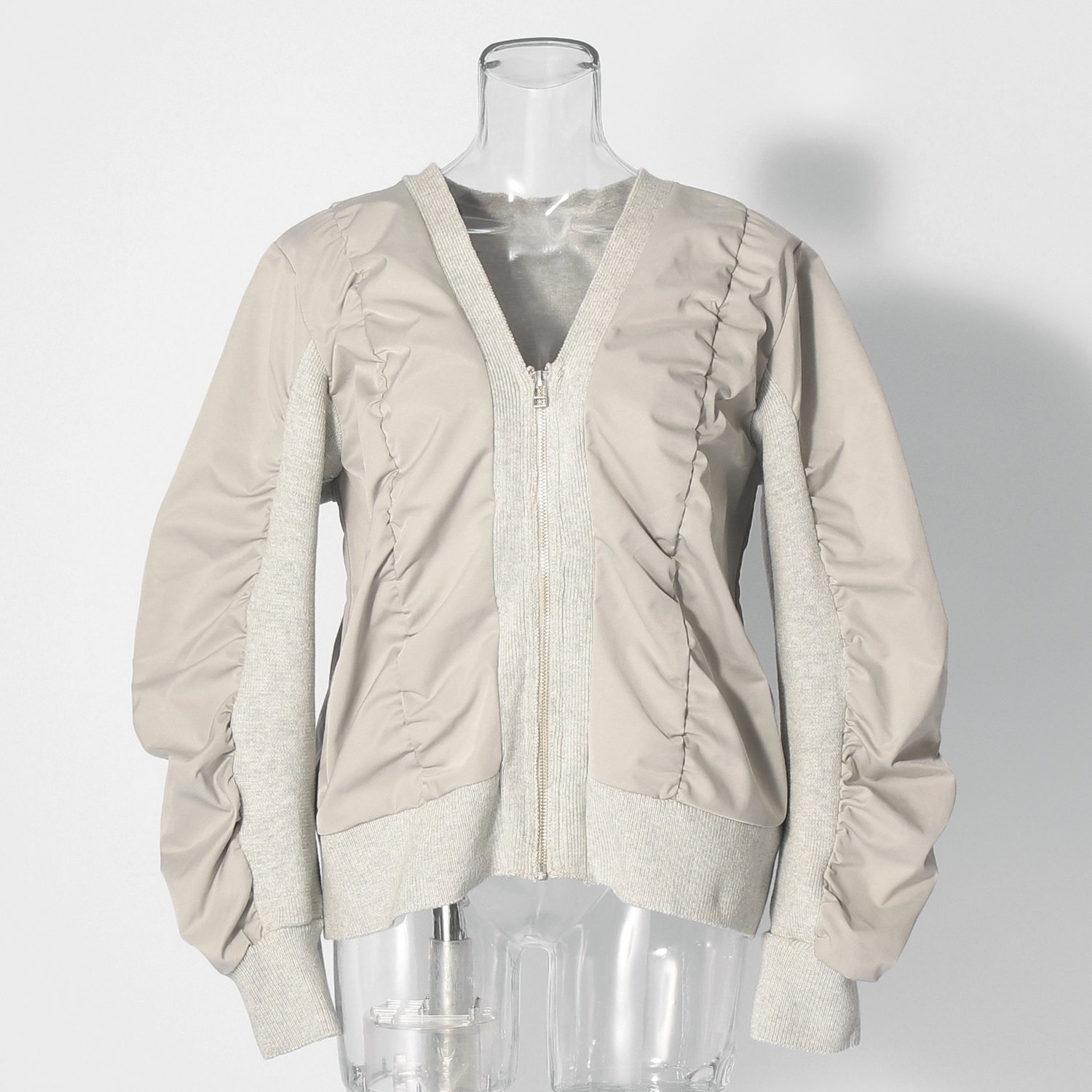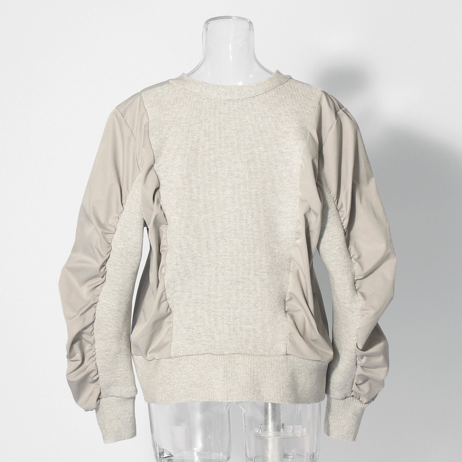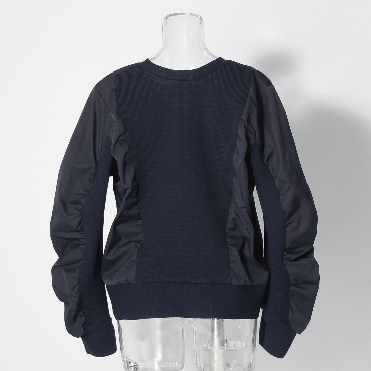 ハリのあるポリエステル素材とミラノリブニット生地をドッキングしたブルゾン。フロントのギャザーがアクセントになりながらも、柔らかな肌当たりが嬉しい1着です。袖にもディテールを入れて立体感をプラスし、奥行きのあるスタイリングを叶えてくれます。
