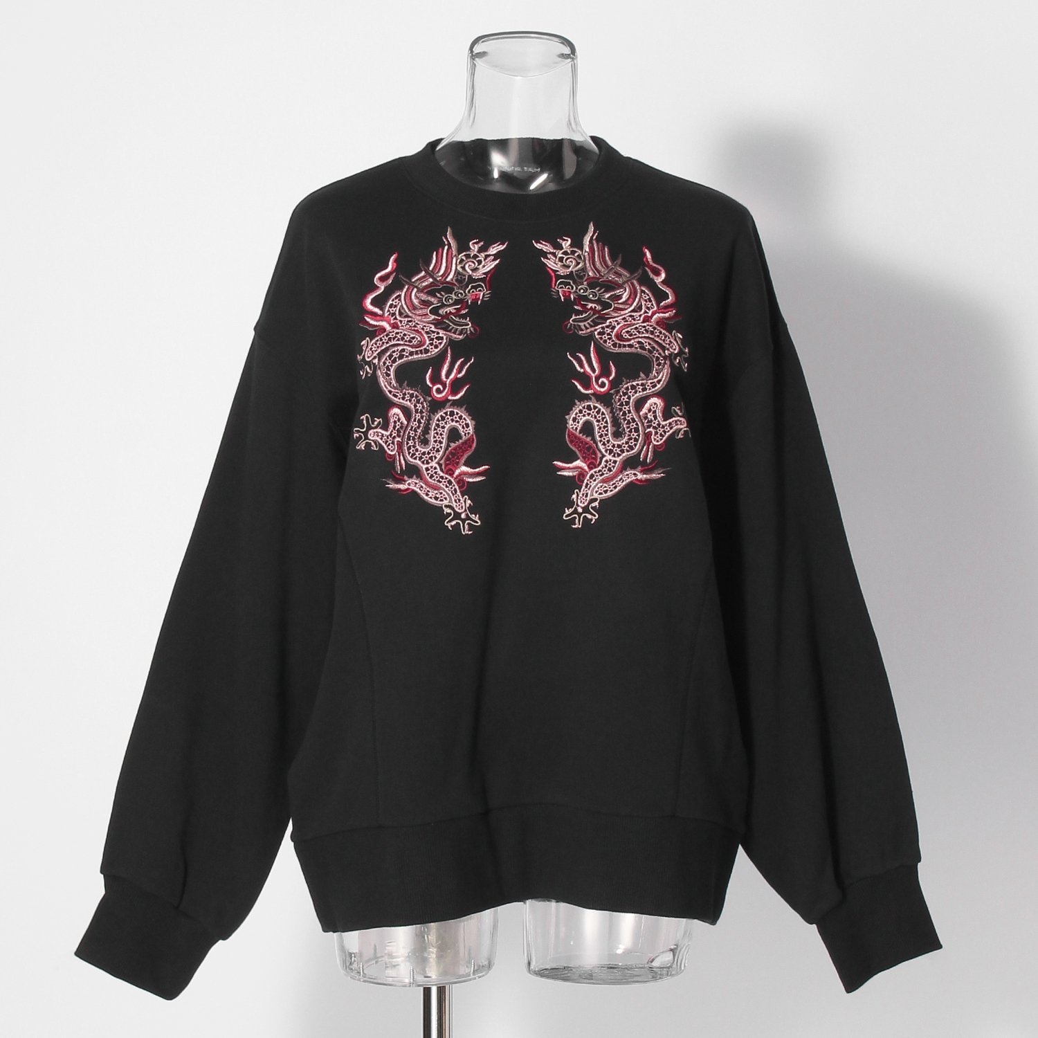 ドラゴンの刺繍を前面に入れて、襟、アームホール、前身頃の切替にダブルステッチを効かせたトレーナートップス。ラメ糸を使用した刺繍をあしらい、動くたびにさりげないきらめきを放ちます。オーバーサイズの設計でリラクシーに着こなせるのもポイントです。