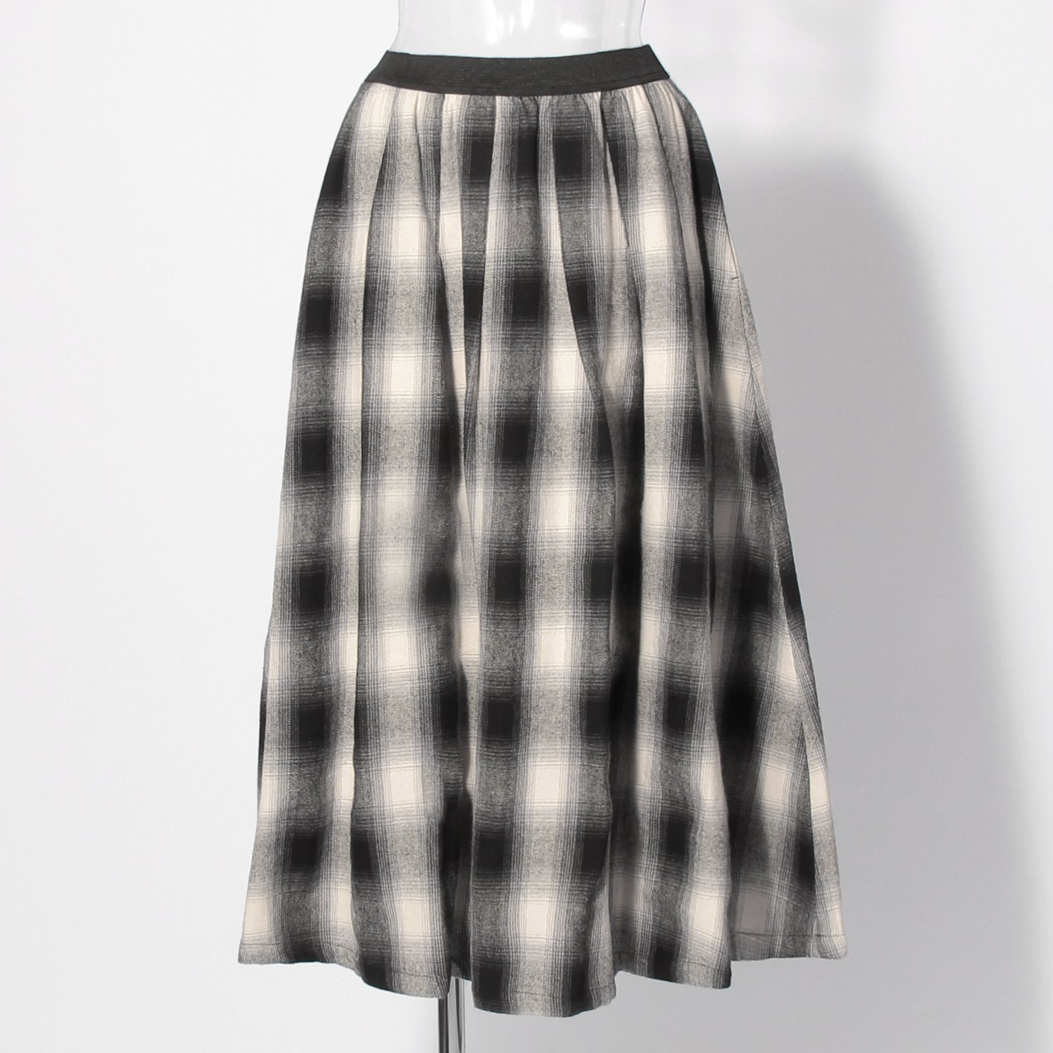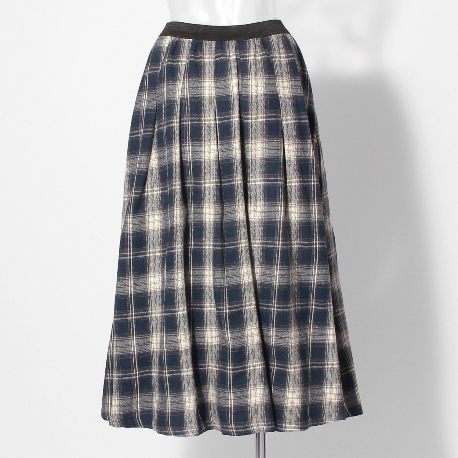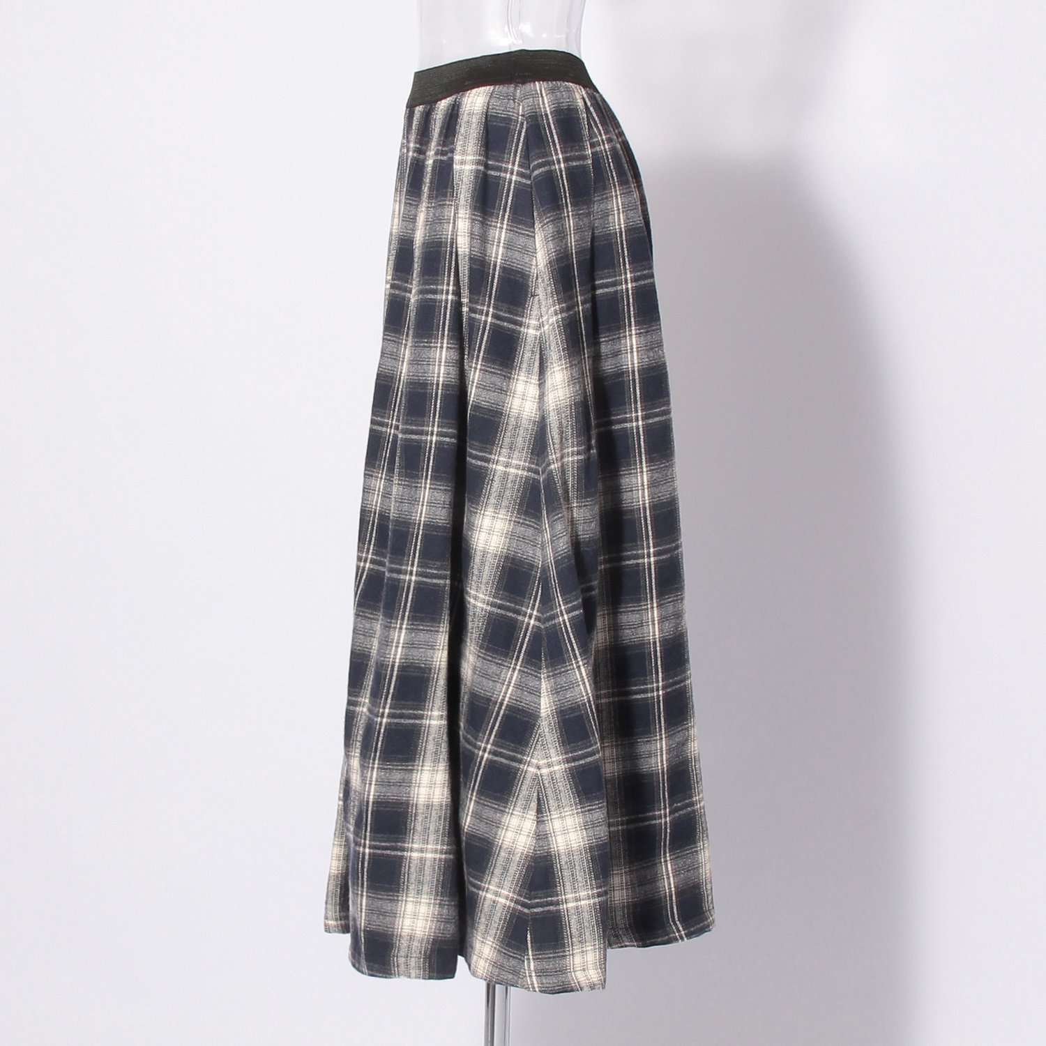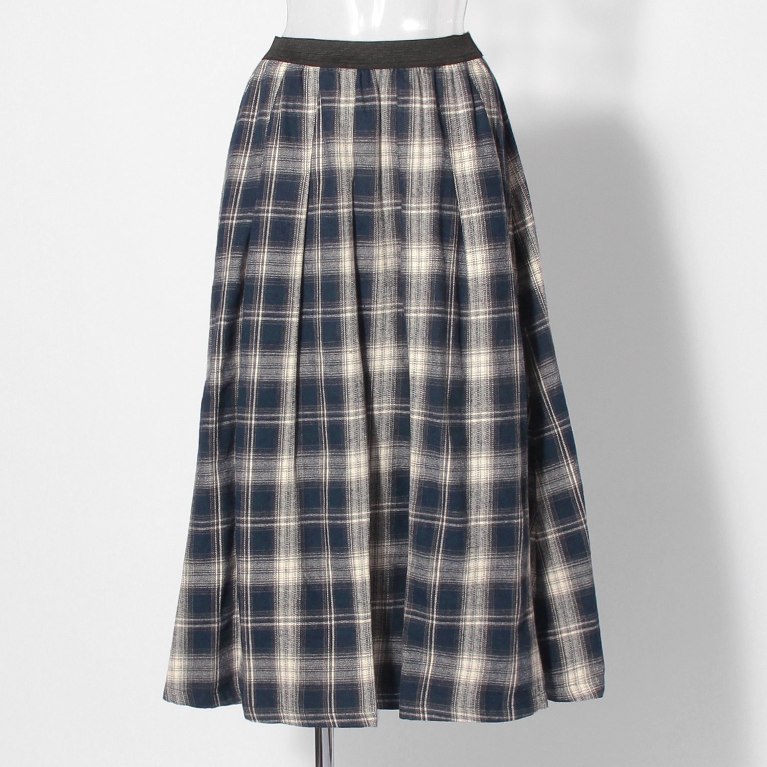 シーズンムードを高めるチェック柄のタックスカート。程良いフレアラインで動くたびに女性らしい揺れ感が演出できるのが魅力的なポイントです。ウエストはゴム仕様を採用し、締め付けも少ないリラクシーなはき心地を実現します。