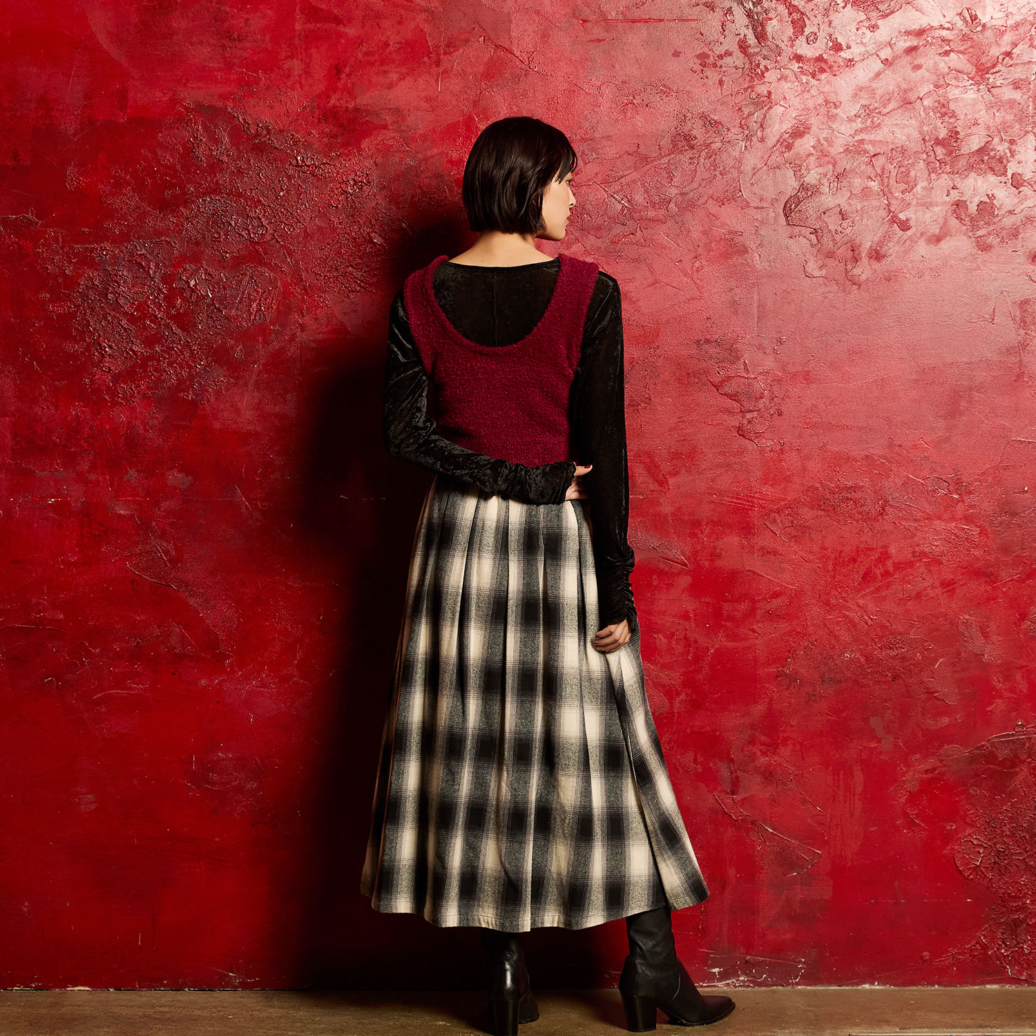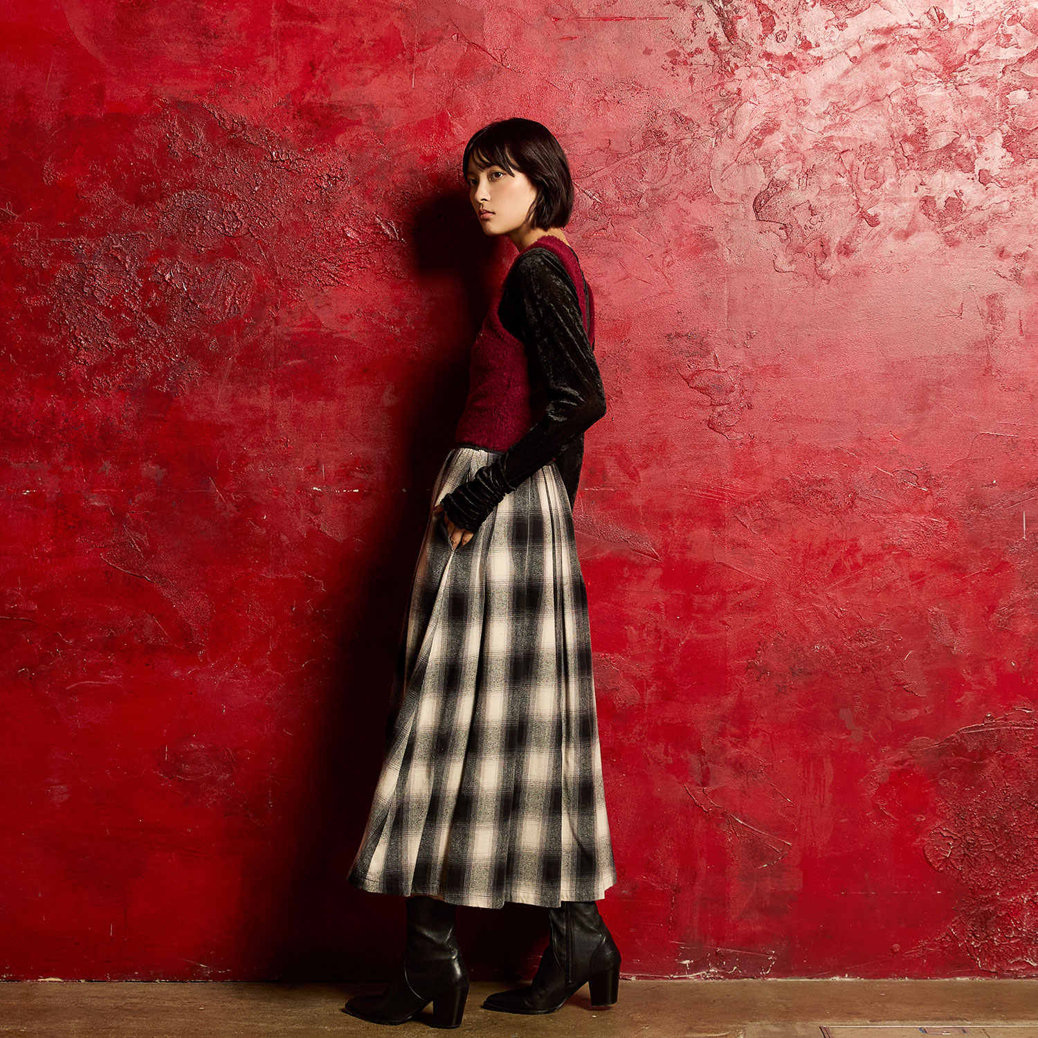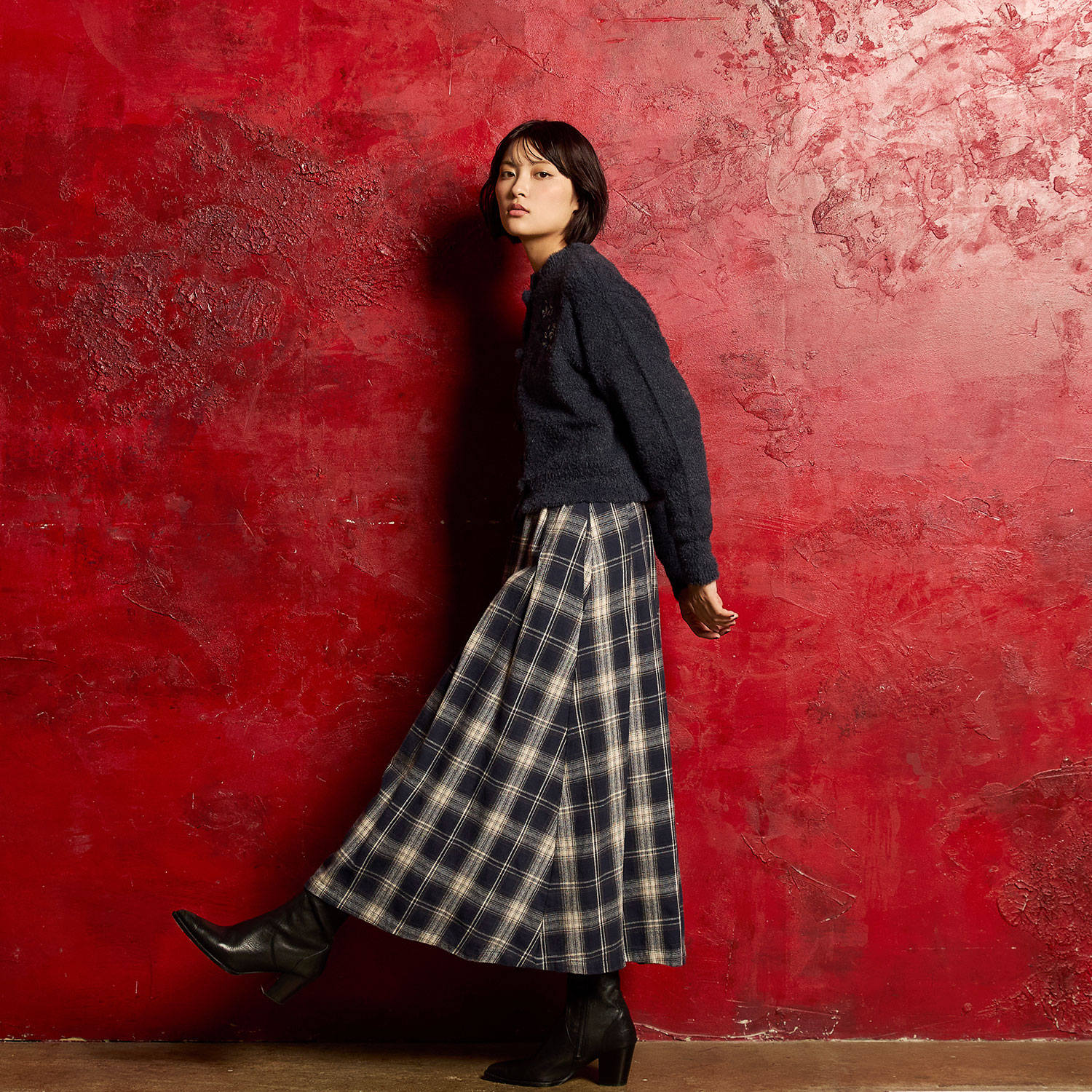 シーズンムードを高めるチェック柄のタックスカート。程良いフレアラインで動くたびに女性らしい揺れ感が演出できるのが魅力的なポイントです。ウエストはゴム仕様を採用し、締め付けも少ないリラクシーなはき心地を実現します。