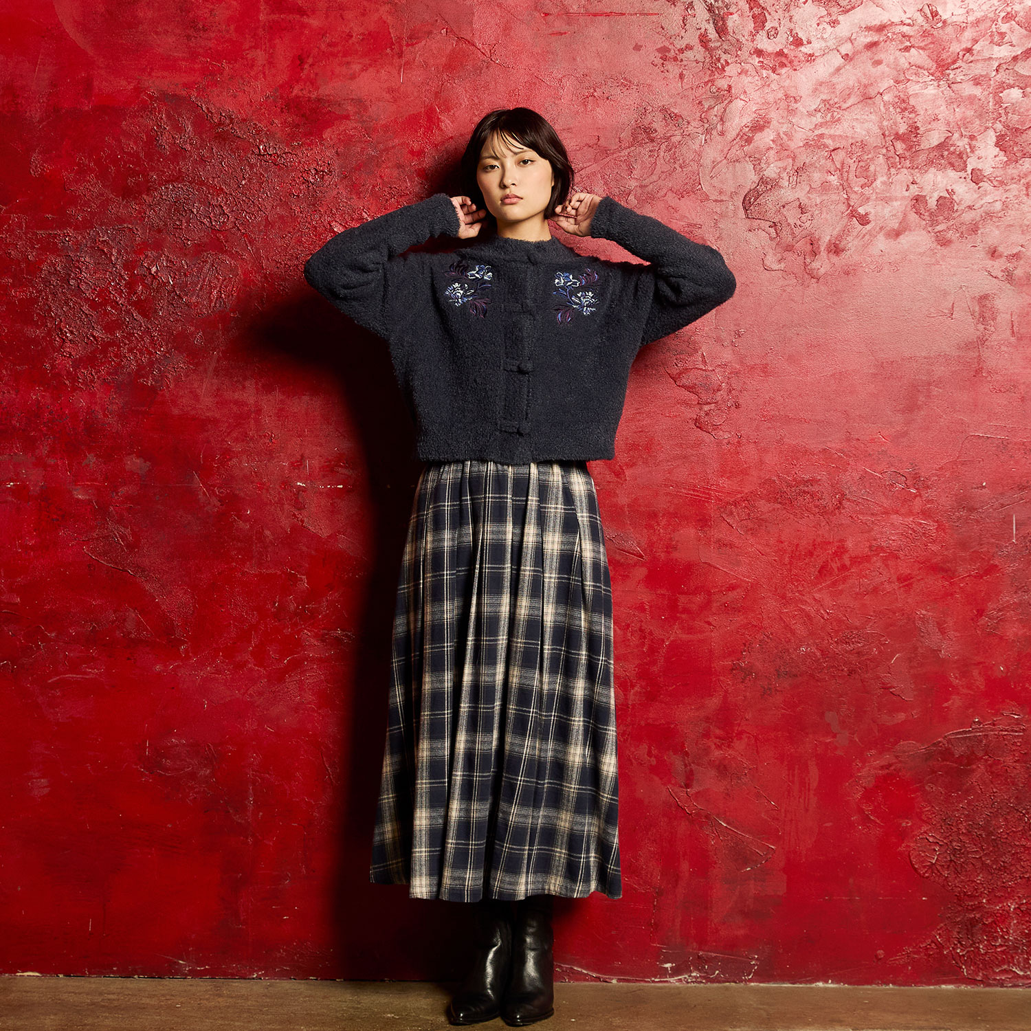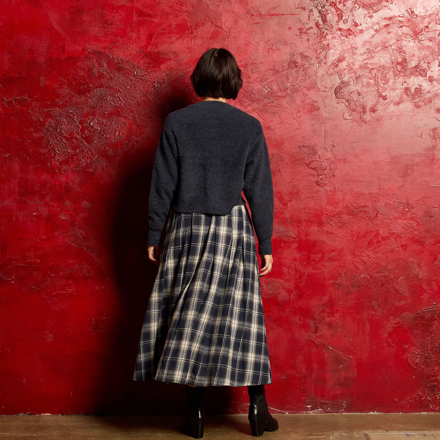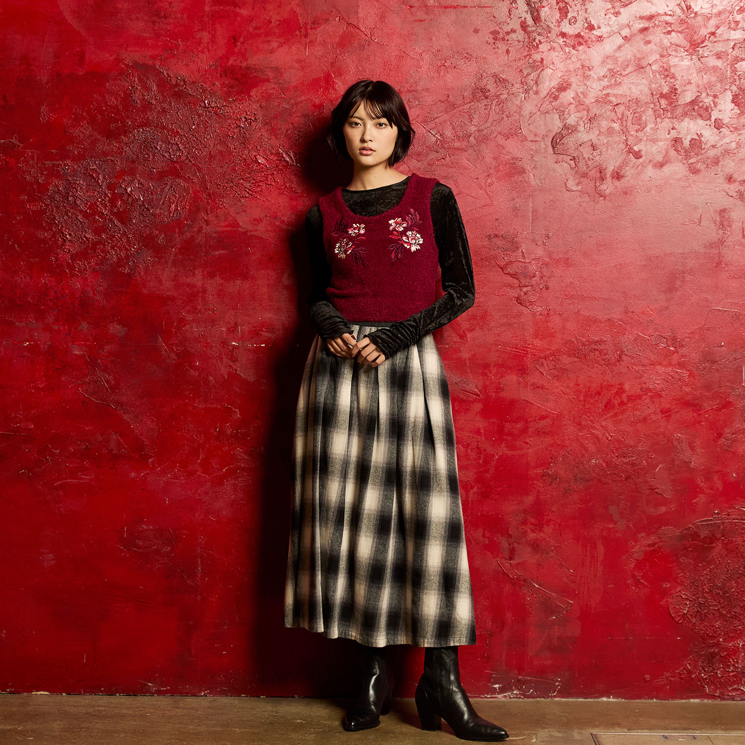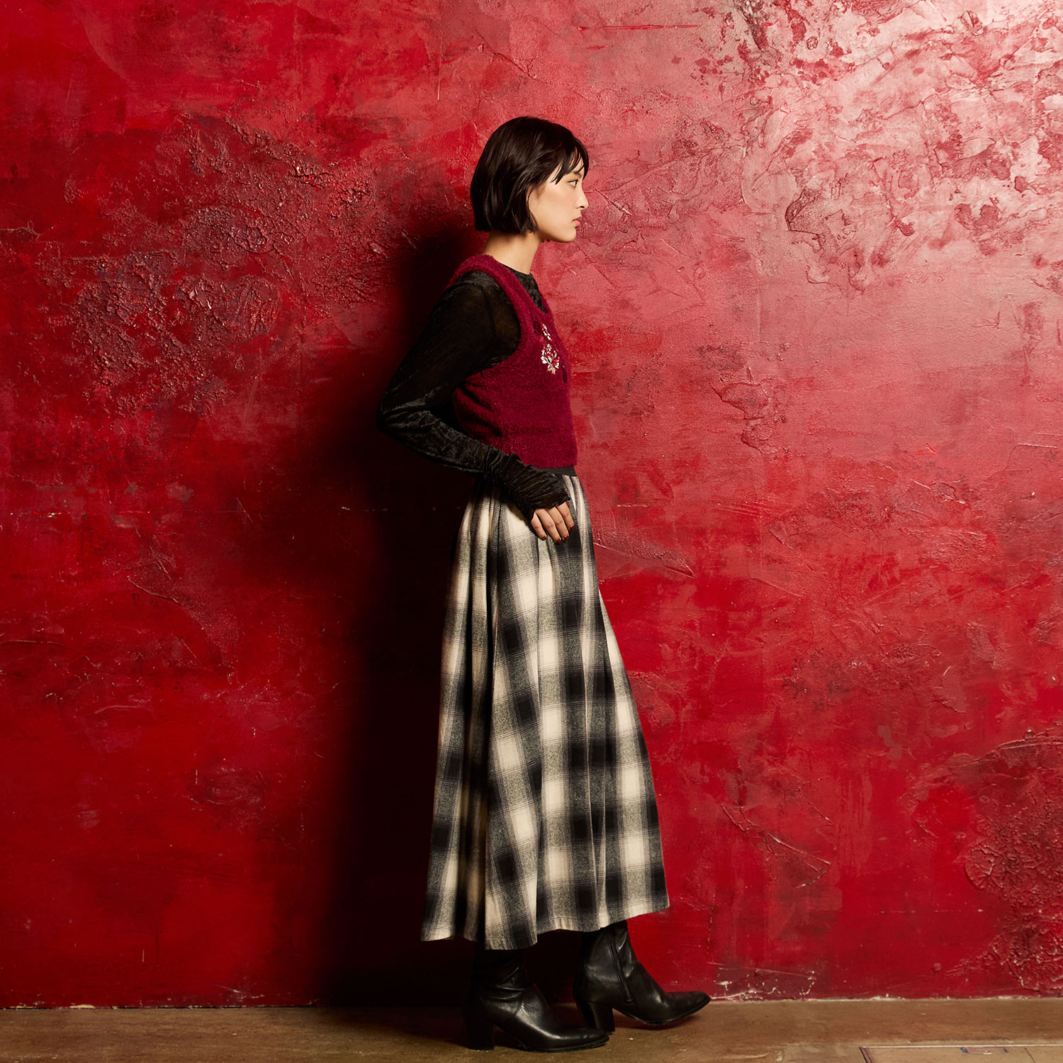 シーズンムードを高めるチェック柄のタックスカート。程良いフレアラインで動くたびに女性らしい揺れ感が演出できるのが魅力的なポイントです。ウエストはゴム仕様を採用し、締め付けも少ないリラクシーなはき心地を実現します。