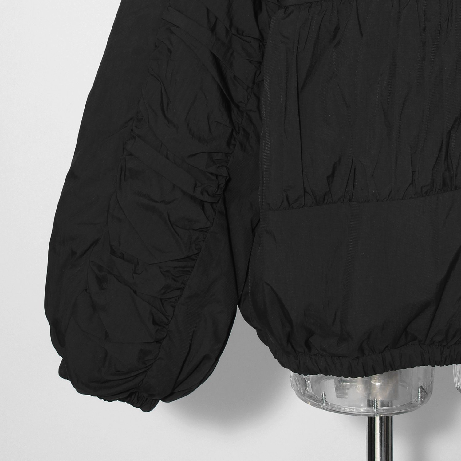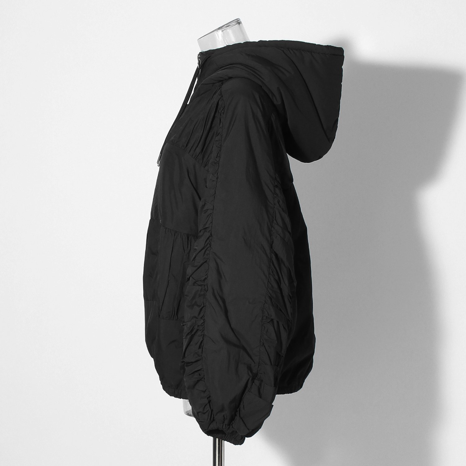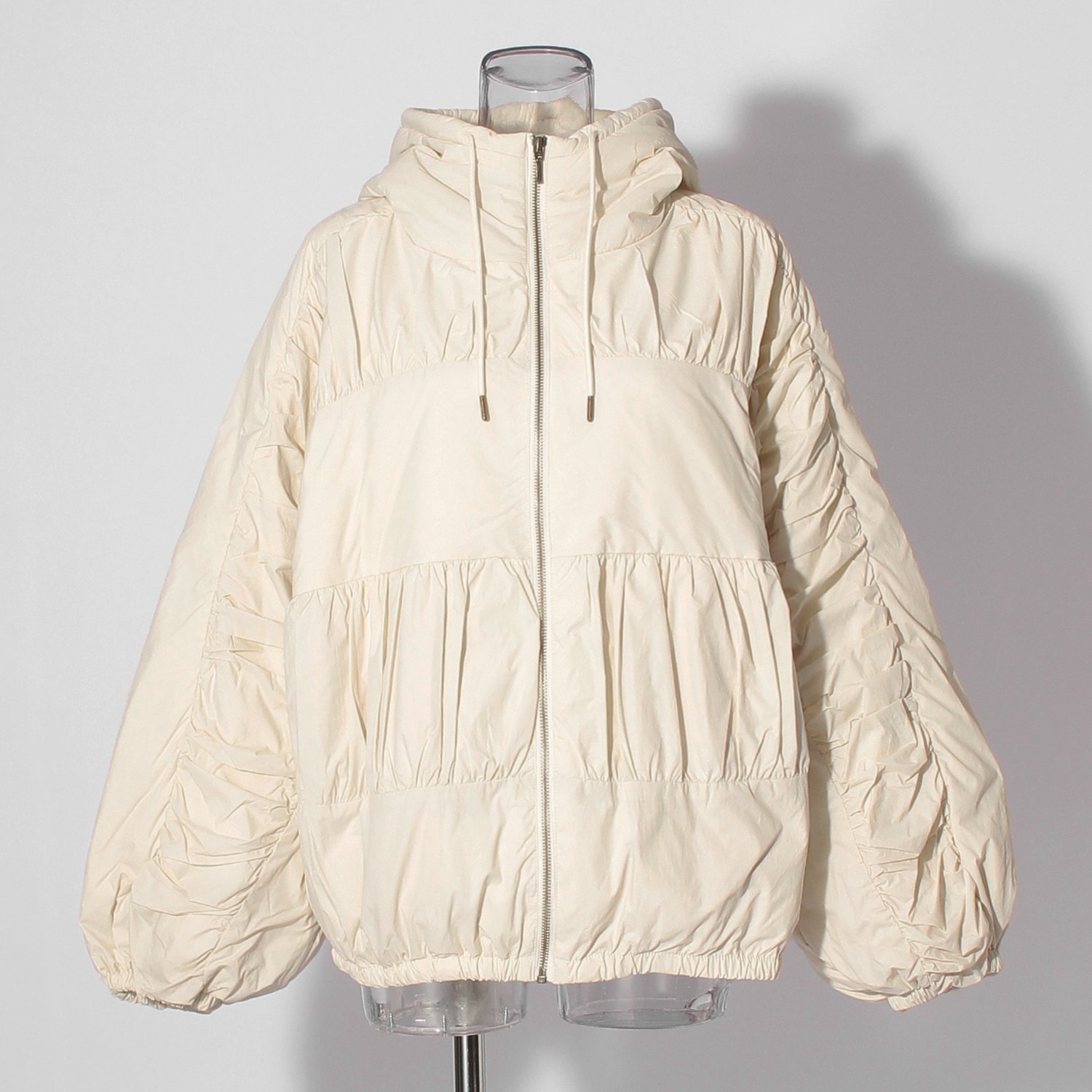 繊細なギャザーが特徴的なエアリーピュアダウンジャケット。メリハリのついたティアードライクな切り替えもアクセントを添えています。中綿には上質なホワイトダックダウンを使用し、保温性をしっかりと確保。表面は強度に優れながらもしなやかな質感のナイロン素材で、機能面にも抜かりなく追求した1着です。