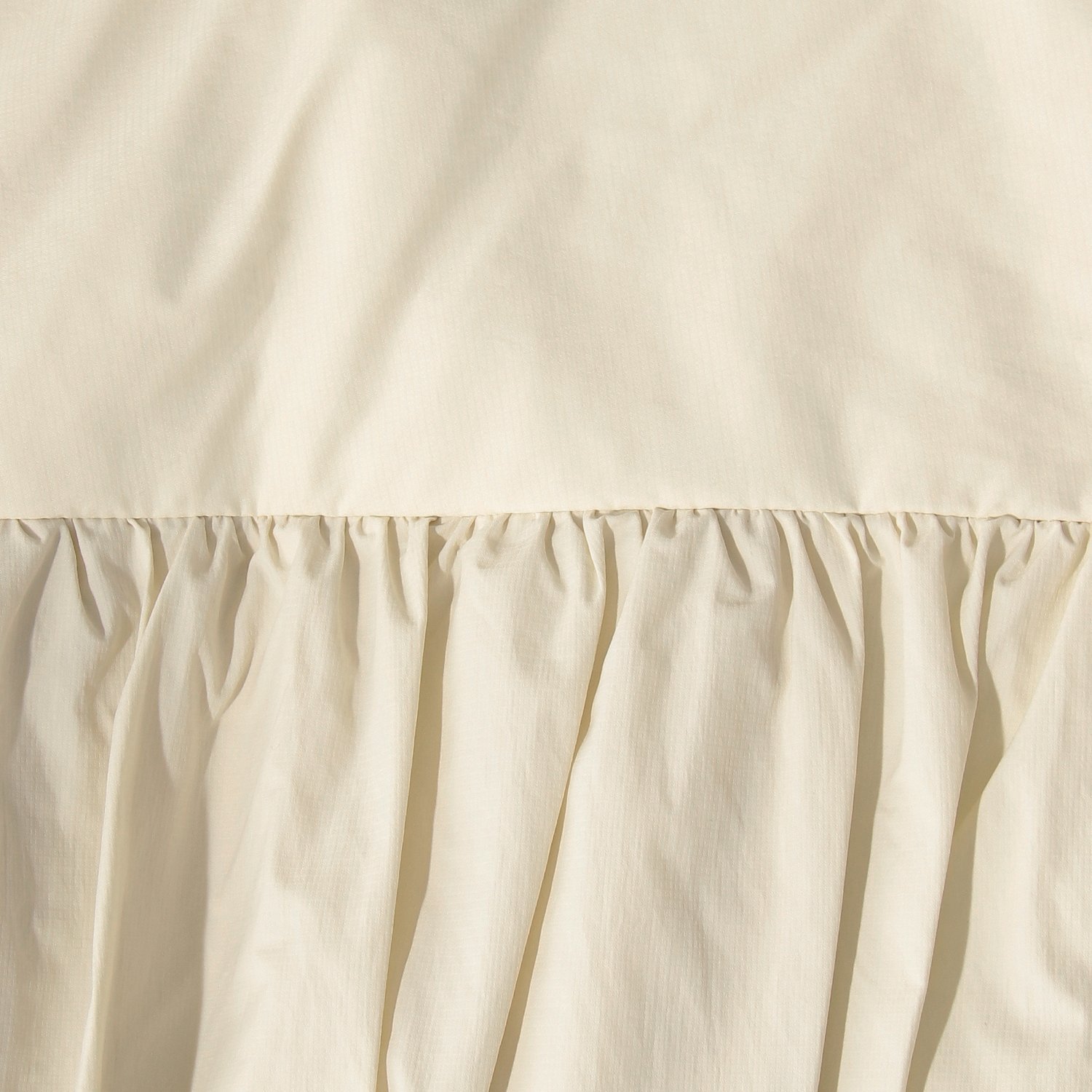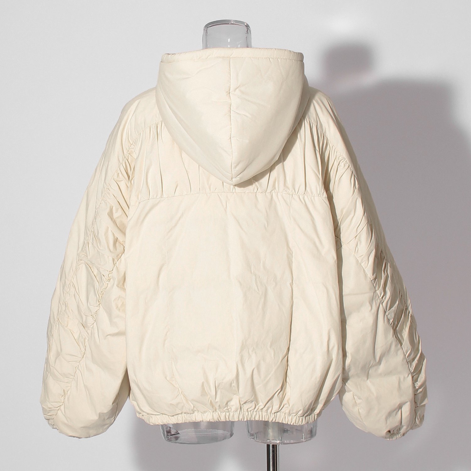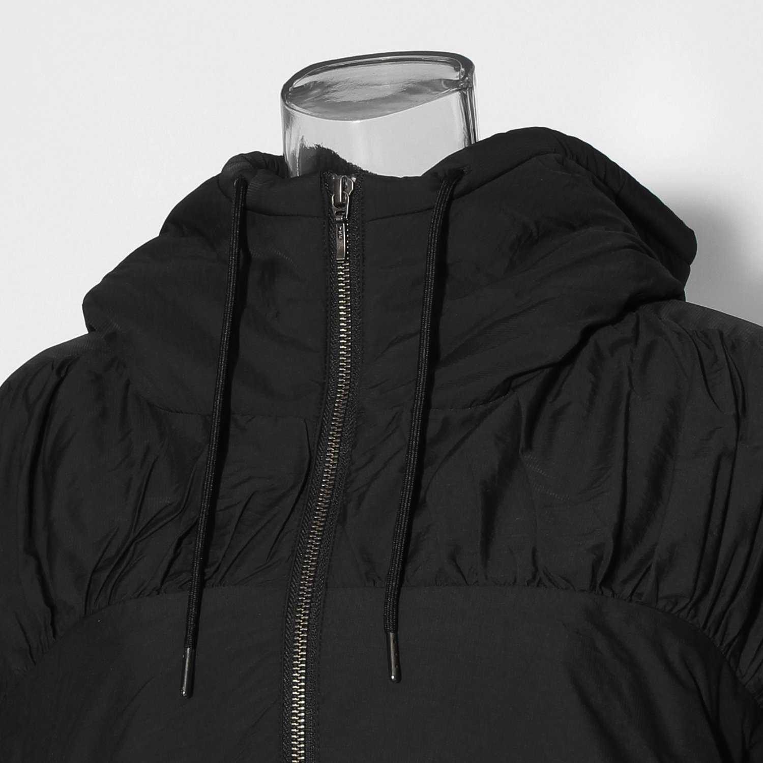 繊細なギャザーが特徴的なエアリーピュアダウンジャケット。メリハリのついたティアードライクな切り替えもアクセントを添えています。中綿には上質なホワイトダックダウンを使用し、保温性をしっかりと確保。表面は強度に優れながらもしなやかな質感のナイロン素材で、機能面にも抜かりなく追求した1着です。