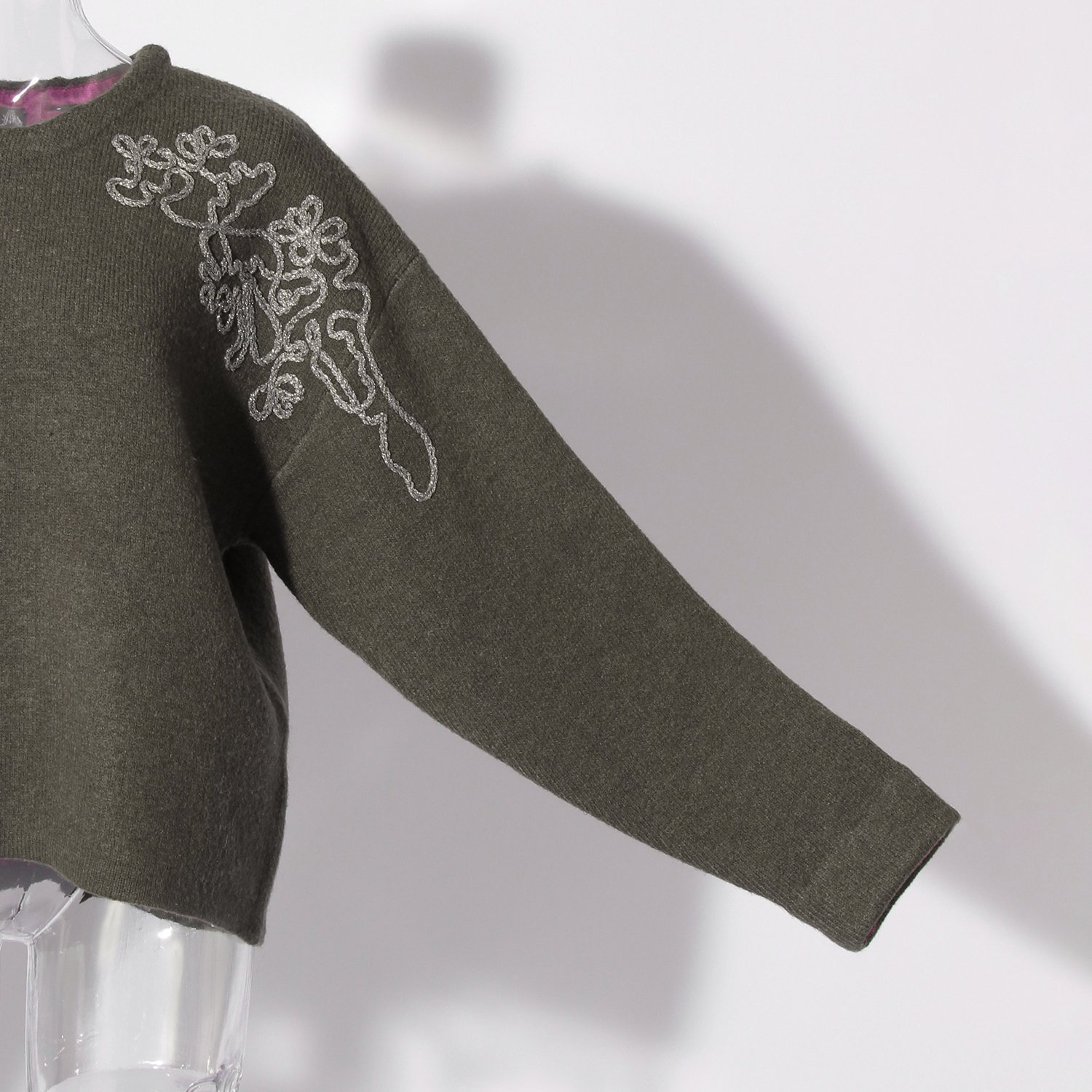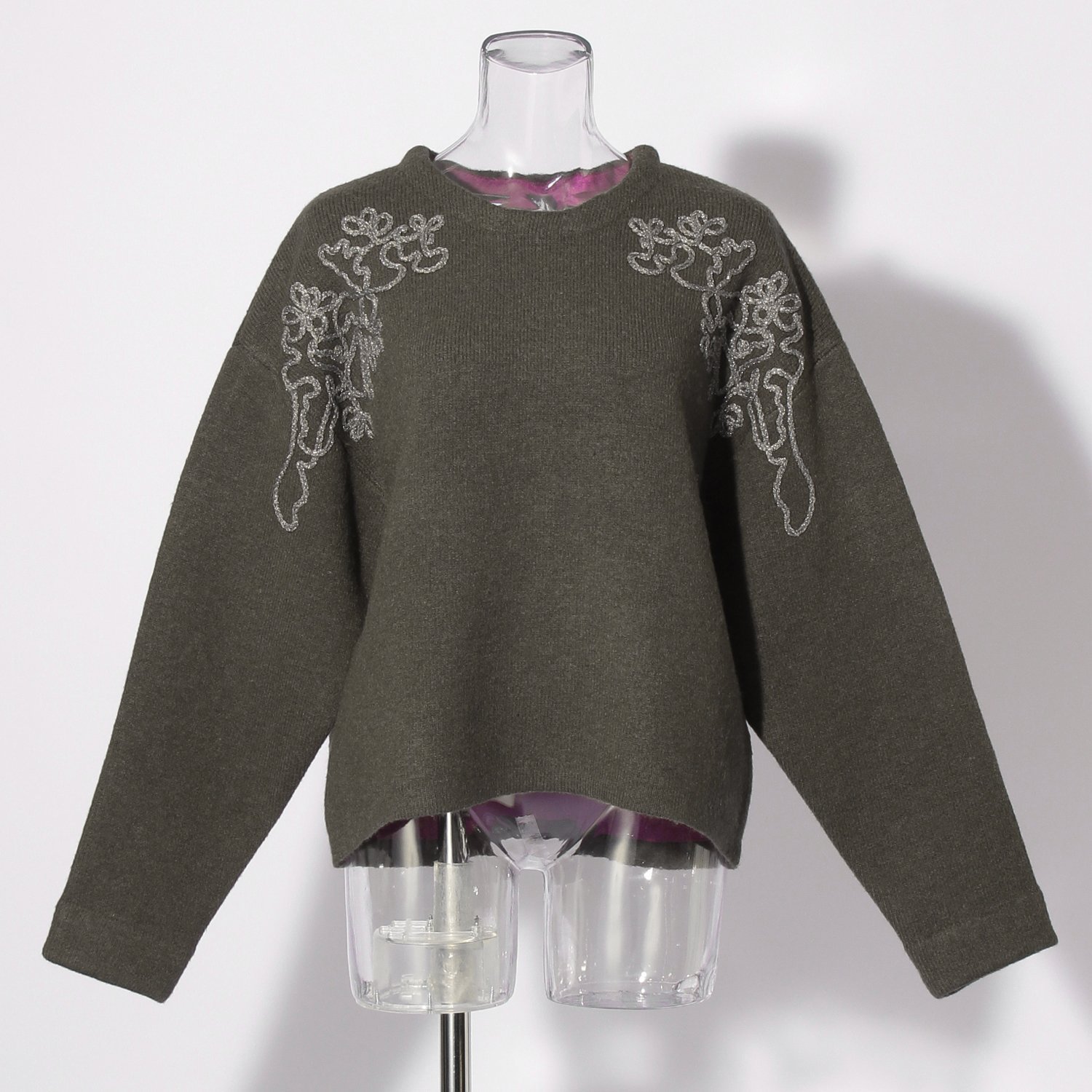 肩から袖にかけて大胆に入ったコード刺繍がアクセントのニットトップス。表面にはウール混で微かな起毛感がある糸を使用し、裏面にはポリエステル糸を接結することで着用時にチクチクしない製法を採用しております。接結することにより型崩れも防ぎ、長期間美しいシルエットをキープしてくれる1着です。