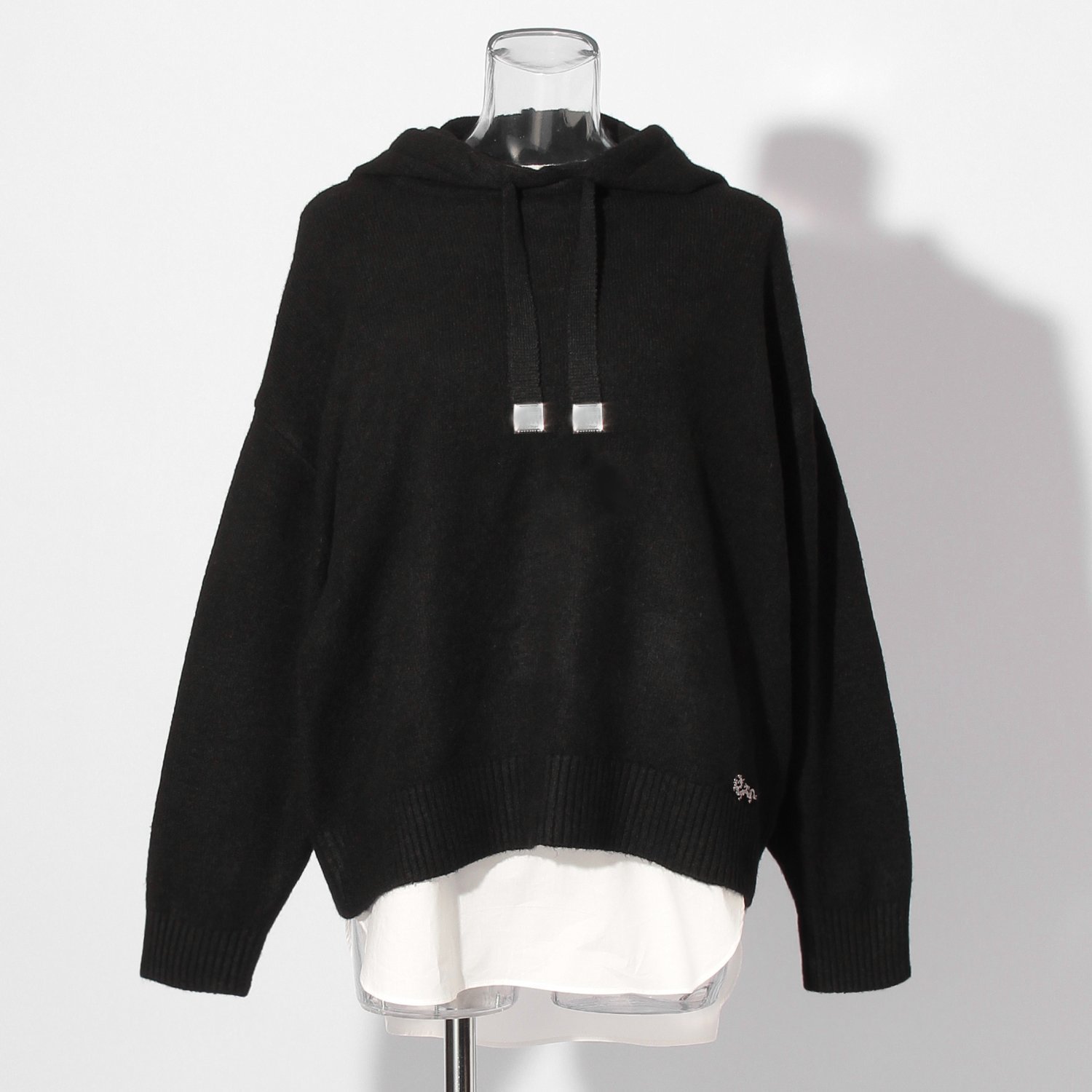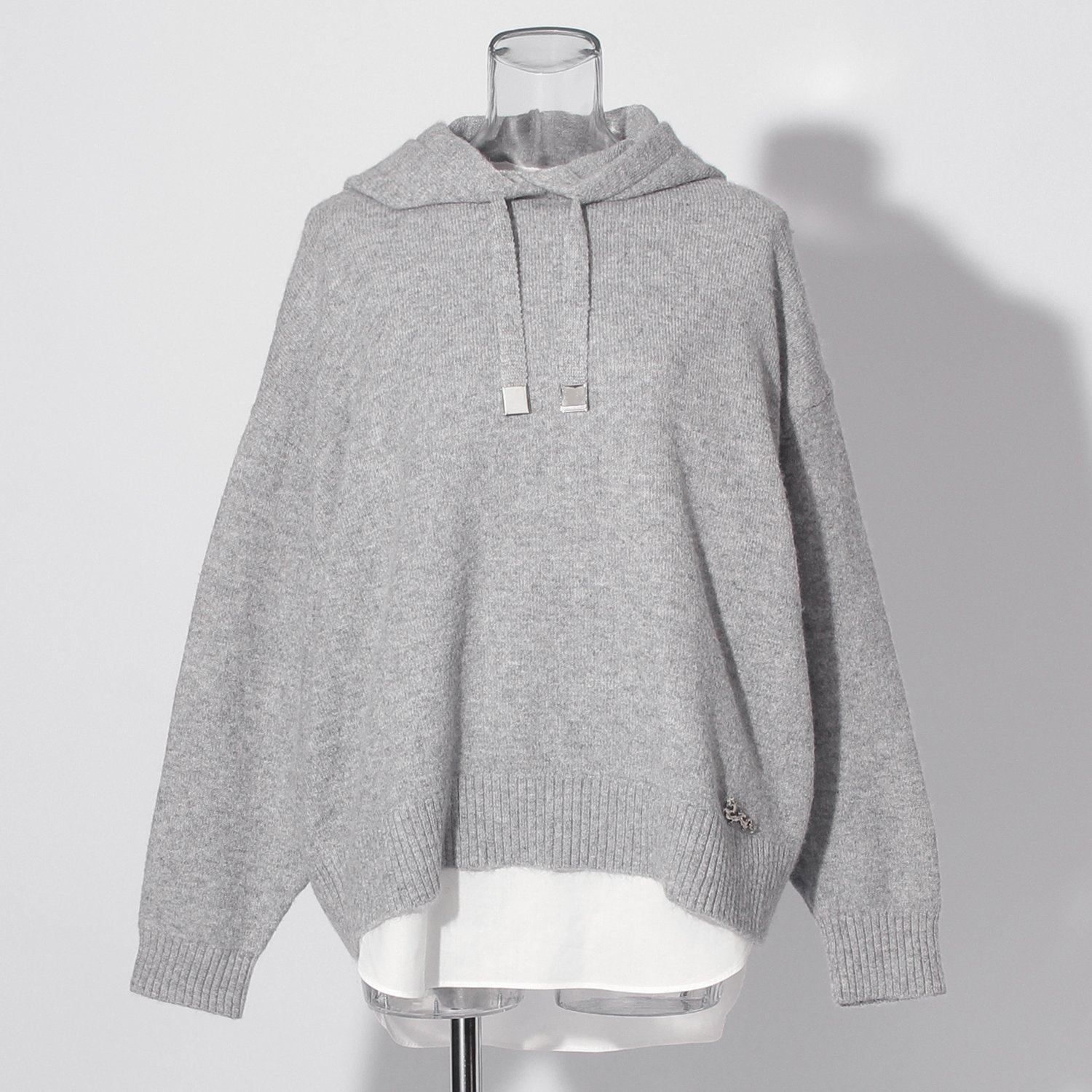 シャツインナー付きフードニットトップス。シンプルながらも裾のホワイトインナーがアクセントになり、こなれた雰囲気が漂います。ほど良い厚みの生地で着心地も良く、肌寒い時期にも重宝。単品でおしゃれなレイヤードスタイルが完成するので、スタイリングに迷わないのも魅力のひとつです。裾にオリジナルのミニドラゴンプレート付き。
