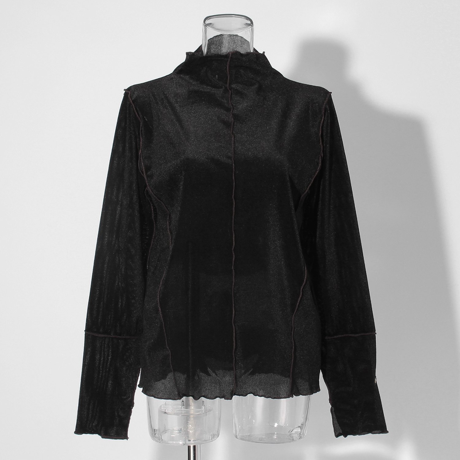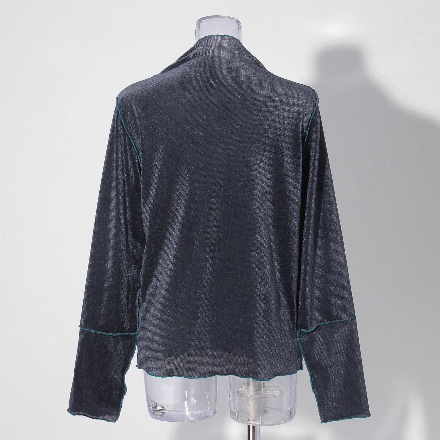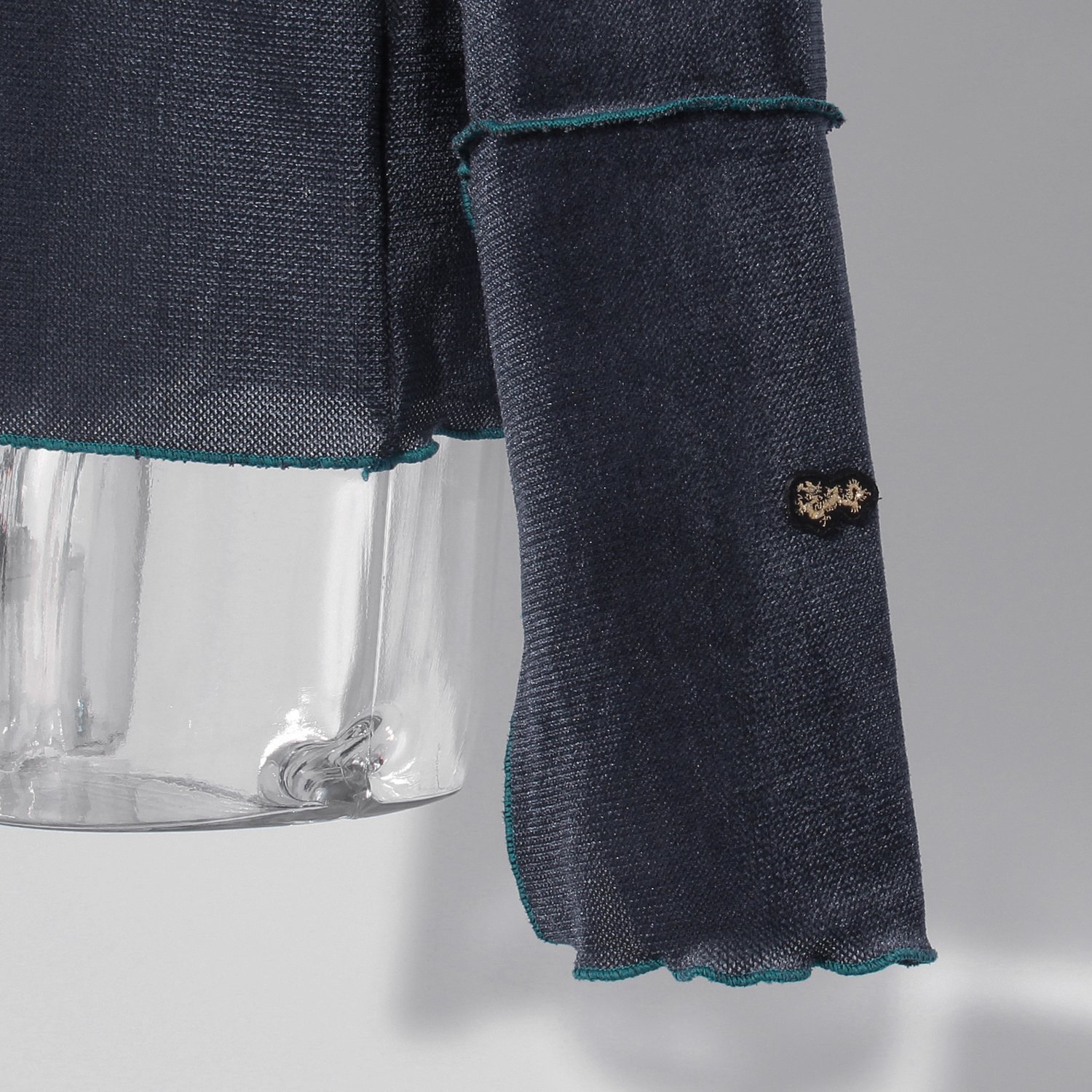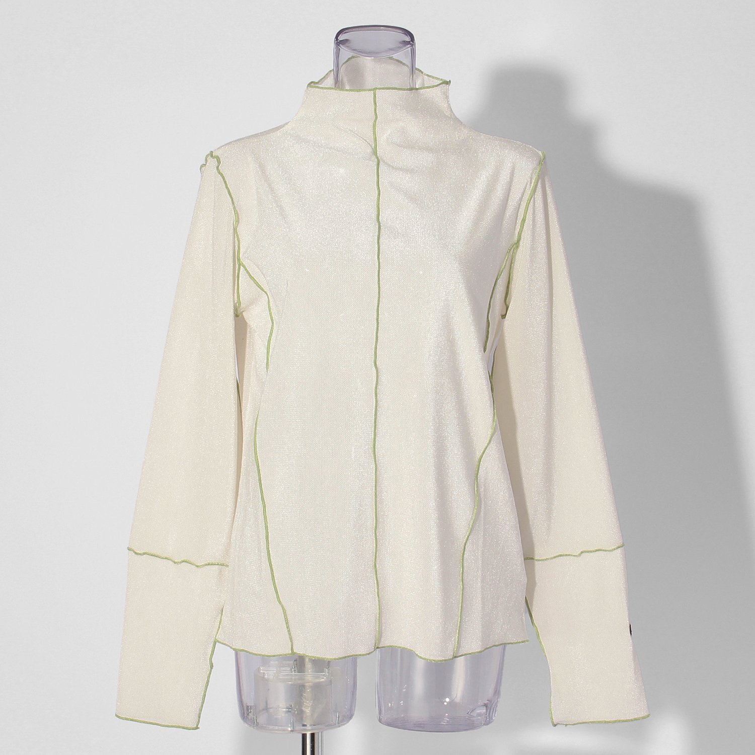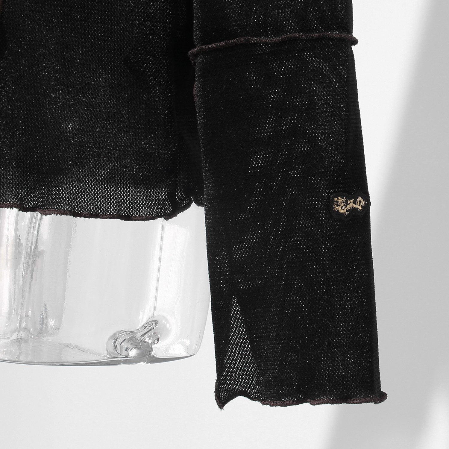 ほど良く軽やかなメッシュ素材で、シアーな表情に仕立てたトップス。上品なベロア生地にラインディテールをあしらい、1枚で印象的に着こなせます。浅めのスタンドネック仕様のため、シャツやジャケット、ニットなどのインナーとしてもロングシーズン活躍してくれるアイテムです。左袖にオリジナルのミニドラゴンワッペン付き。