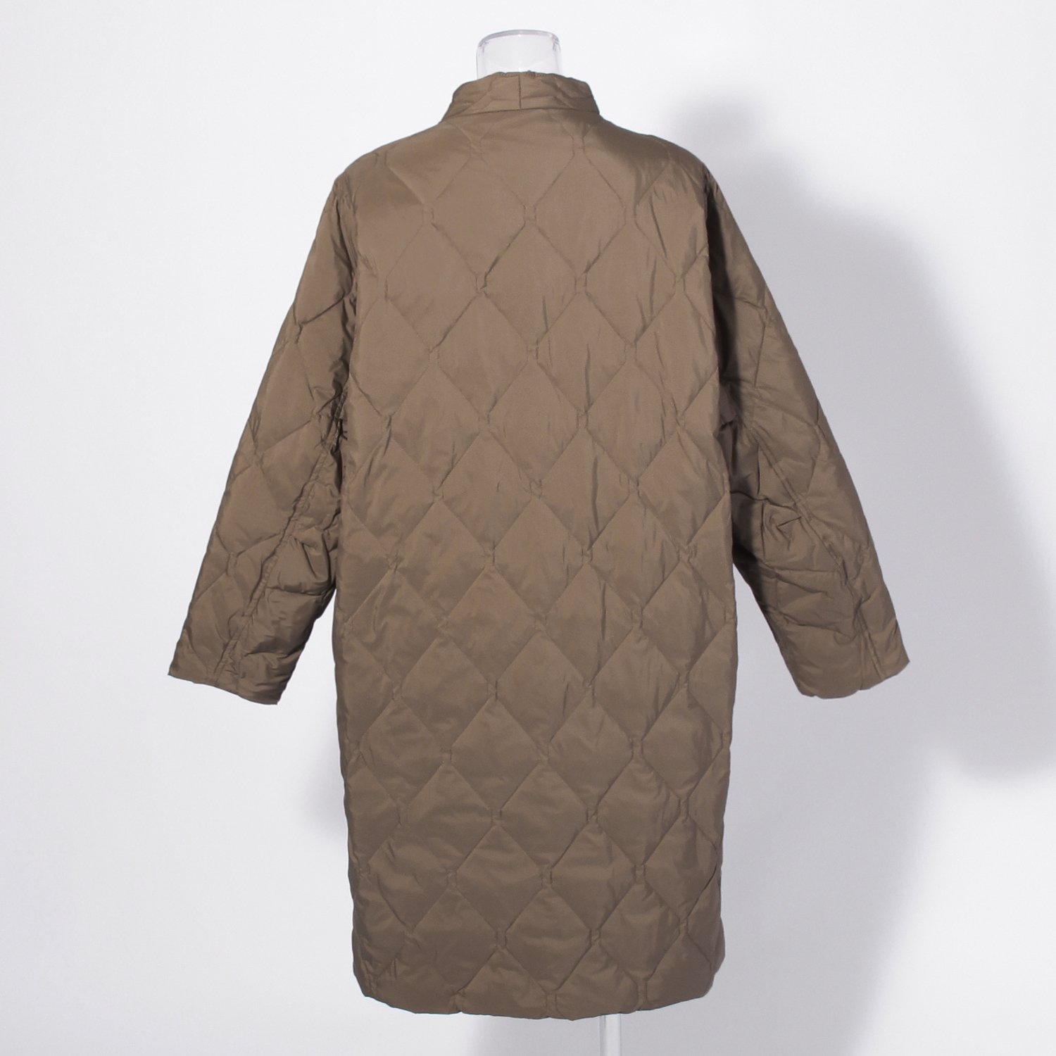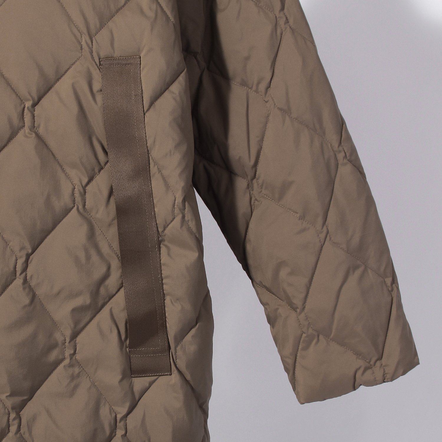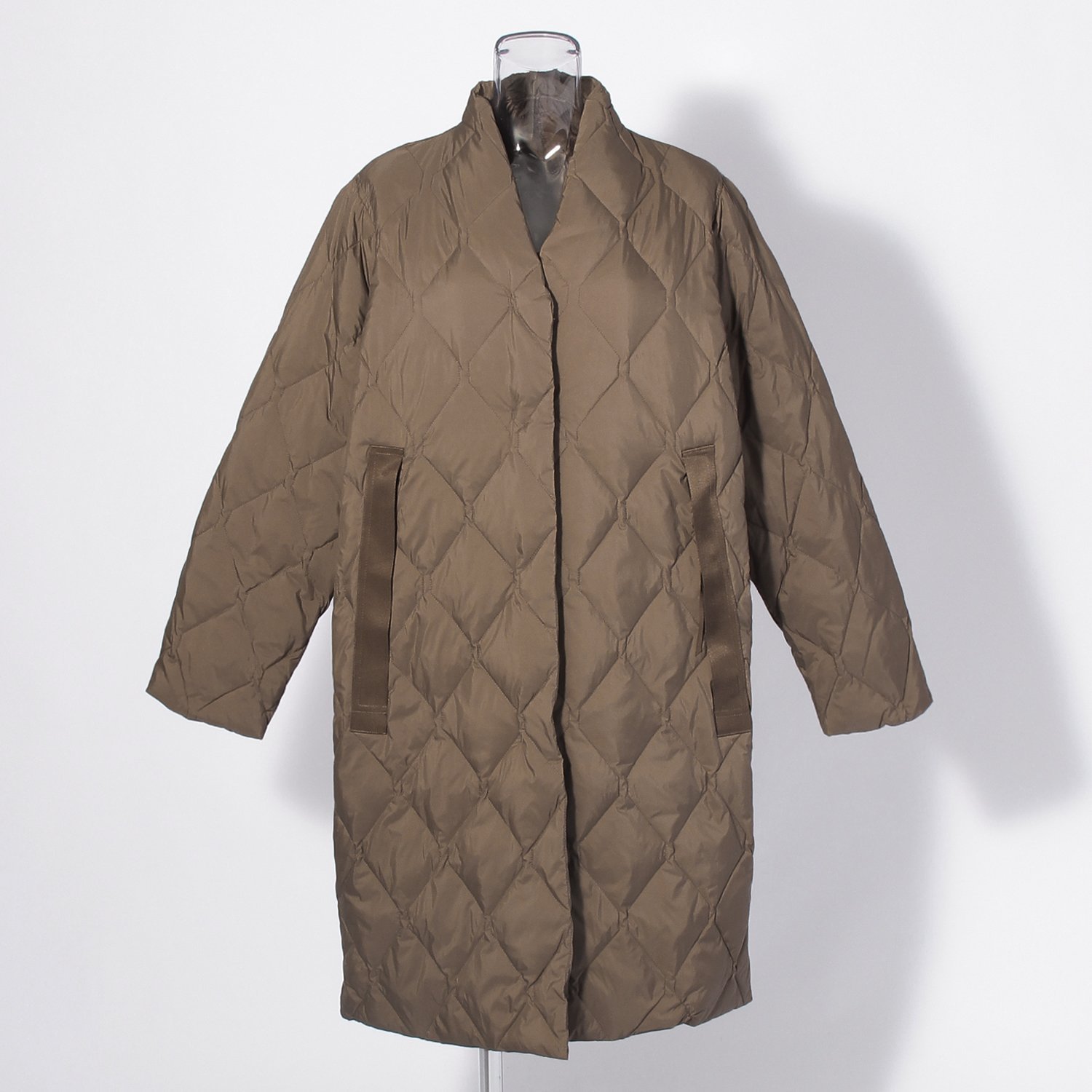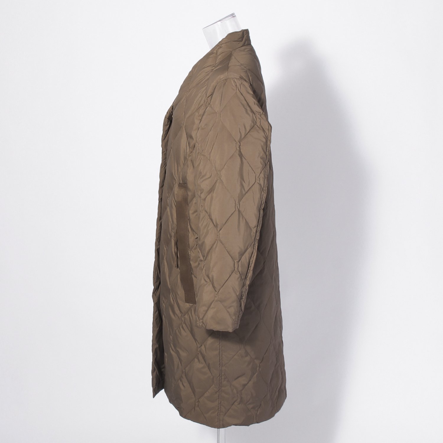 上品な光沢感のあるナイロン素材に、ダイヤキルトを施したコート。着用時に首周りへ寄り添う、カルマネックのデザインが特徴です。ポケット口にはグログランテープでアクセントを添え、装いにさりげない個性をプラスしてくれます。