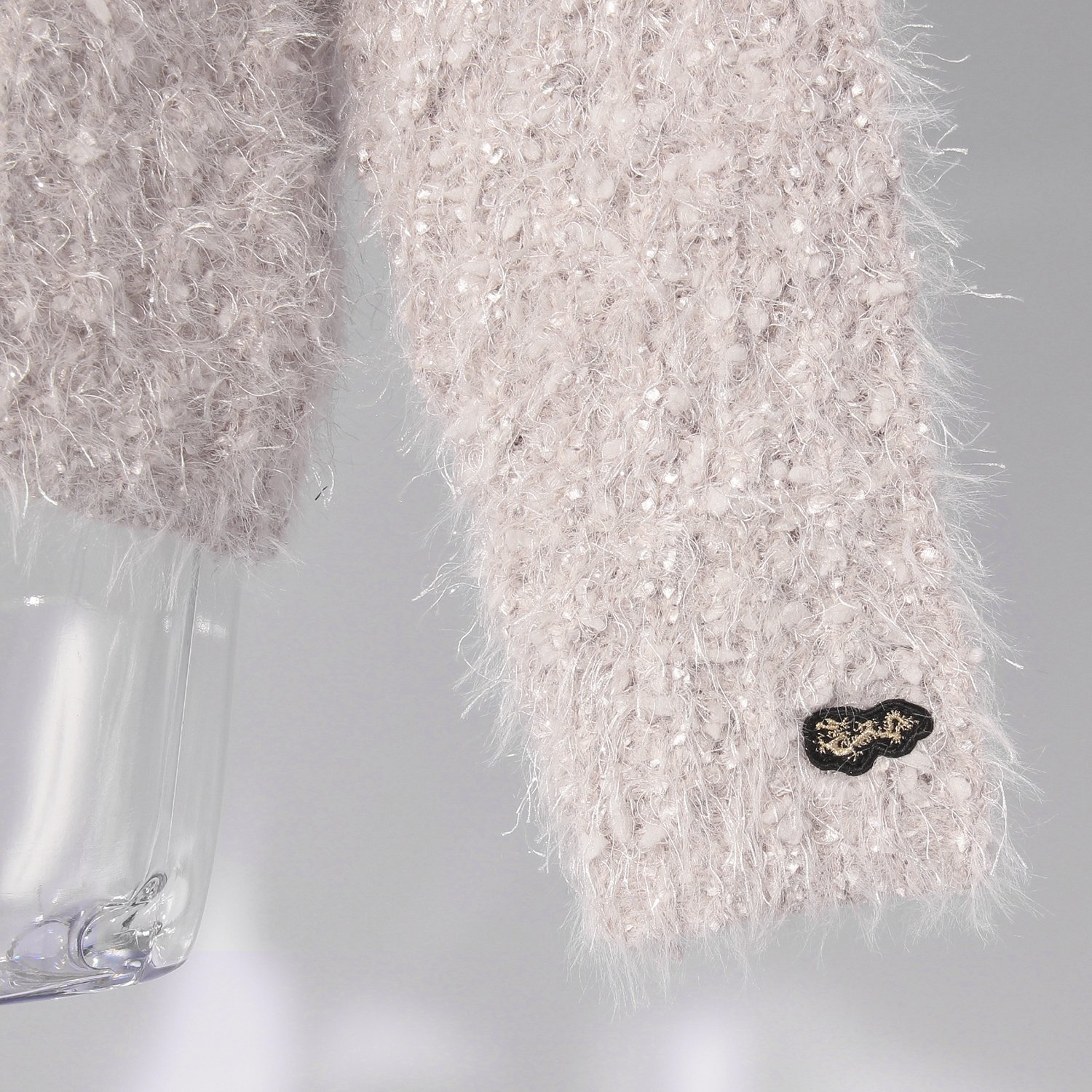 繊細なディテールで、贅沢感たっぷりのニットプルオーバー。フェザーとラメ糸を散りばめることにより、動くたびにきらめく美しいデザインになりました。生地はぬくもりを感じる手触りのモールヤーンをフラワーの形に編み上げ、奥行きのある表情に。1枚で着映えするデザインなので、シンプルなボトムスと合わせても印象的に仕上がります。左袖にオリジナルのミニドラゴンワッペン付き。