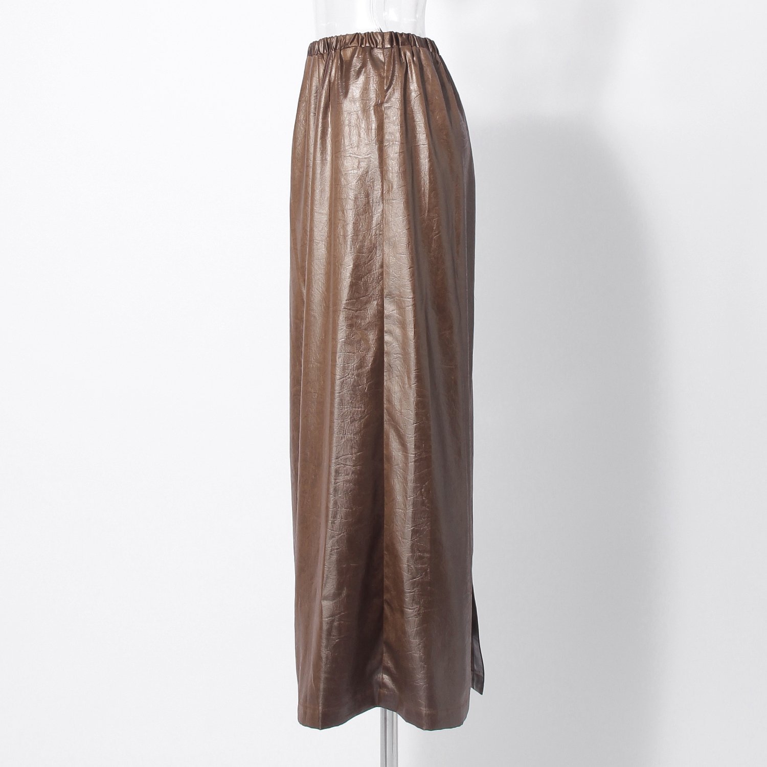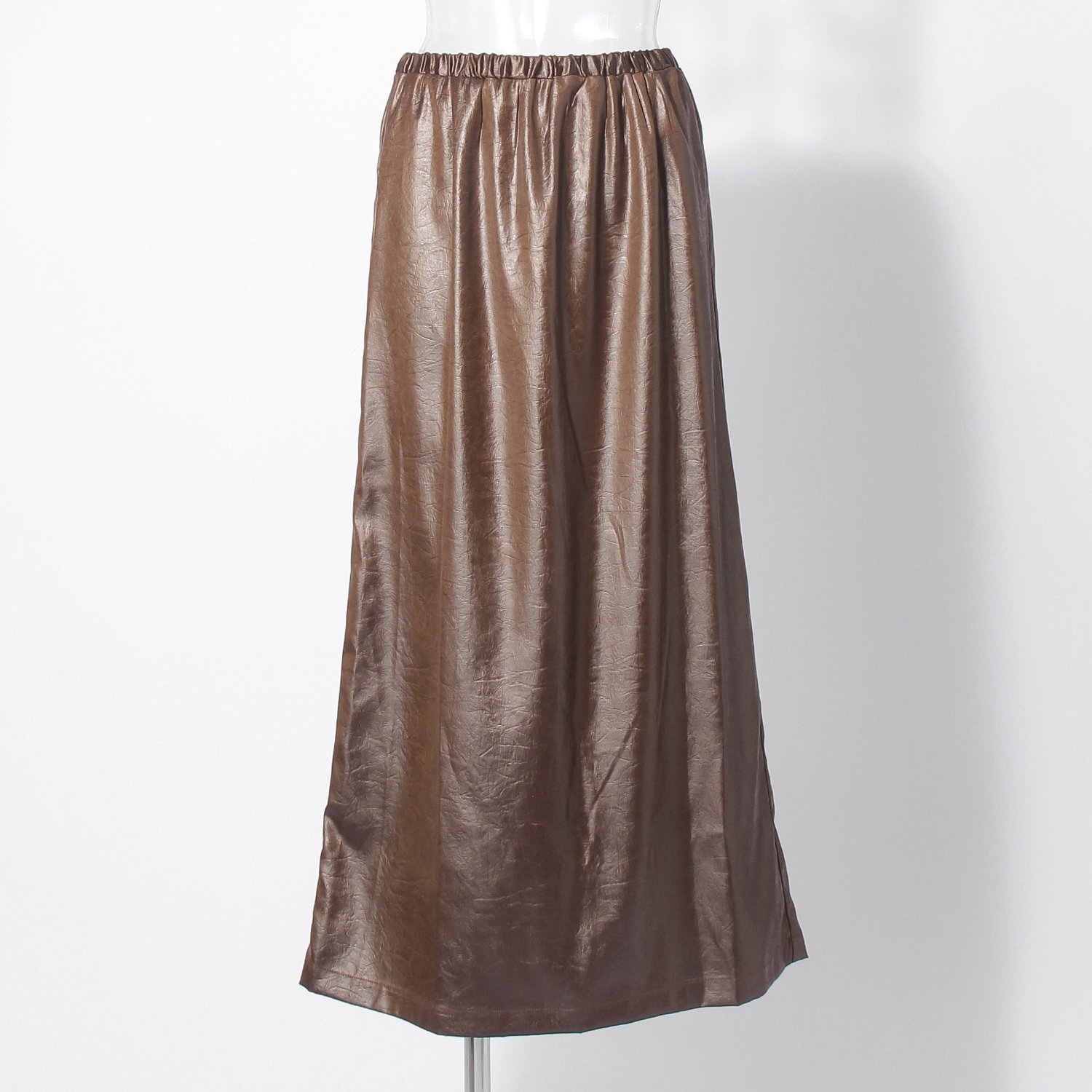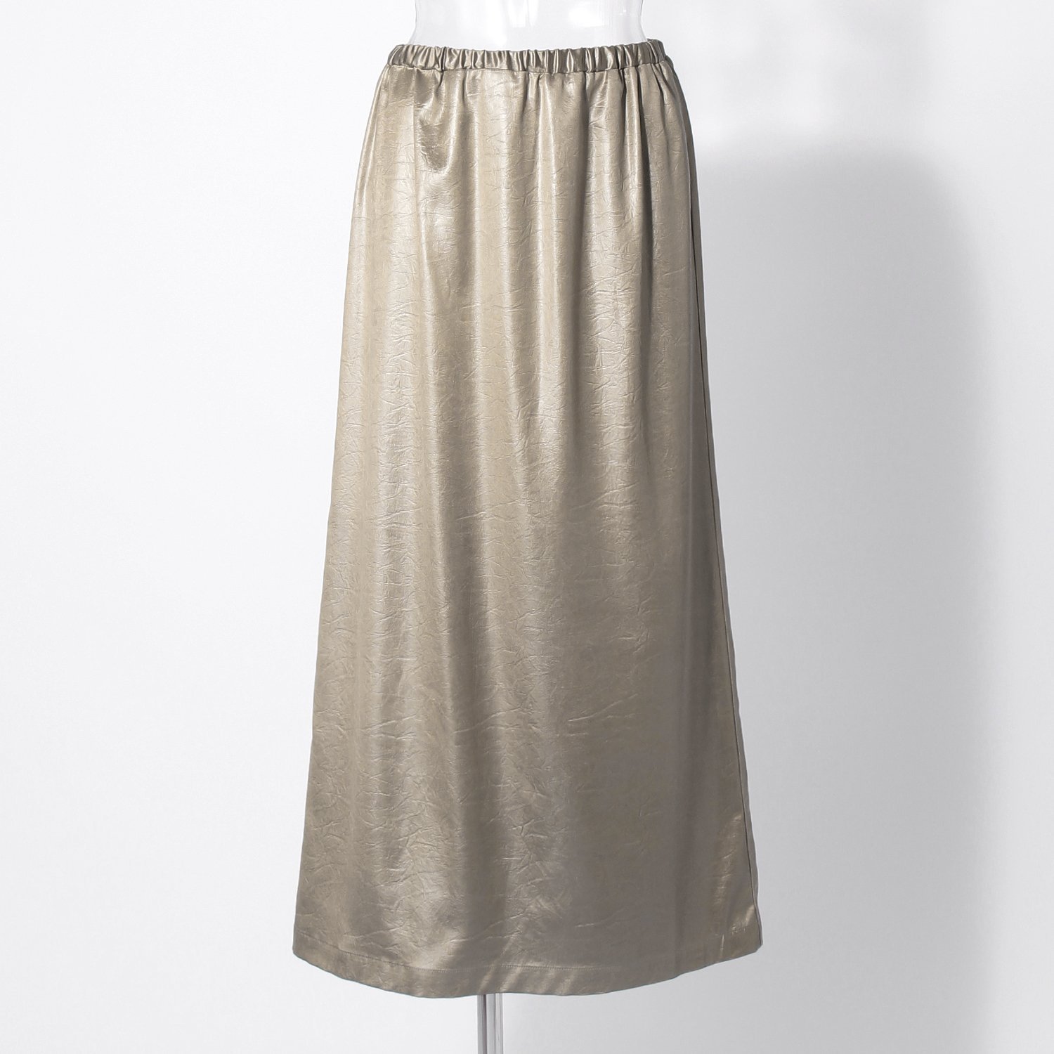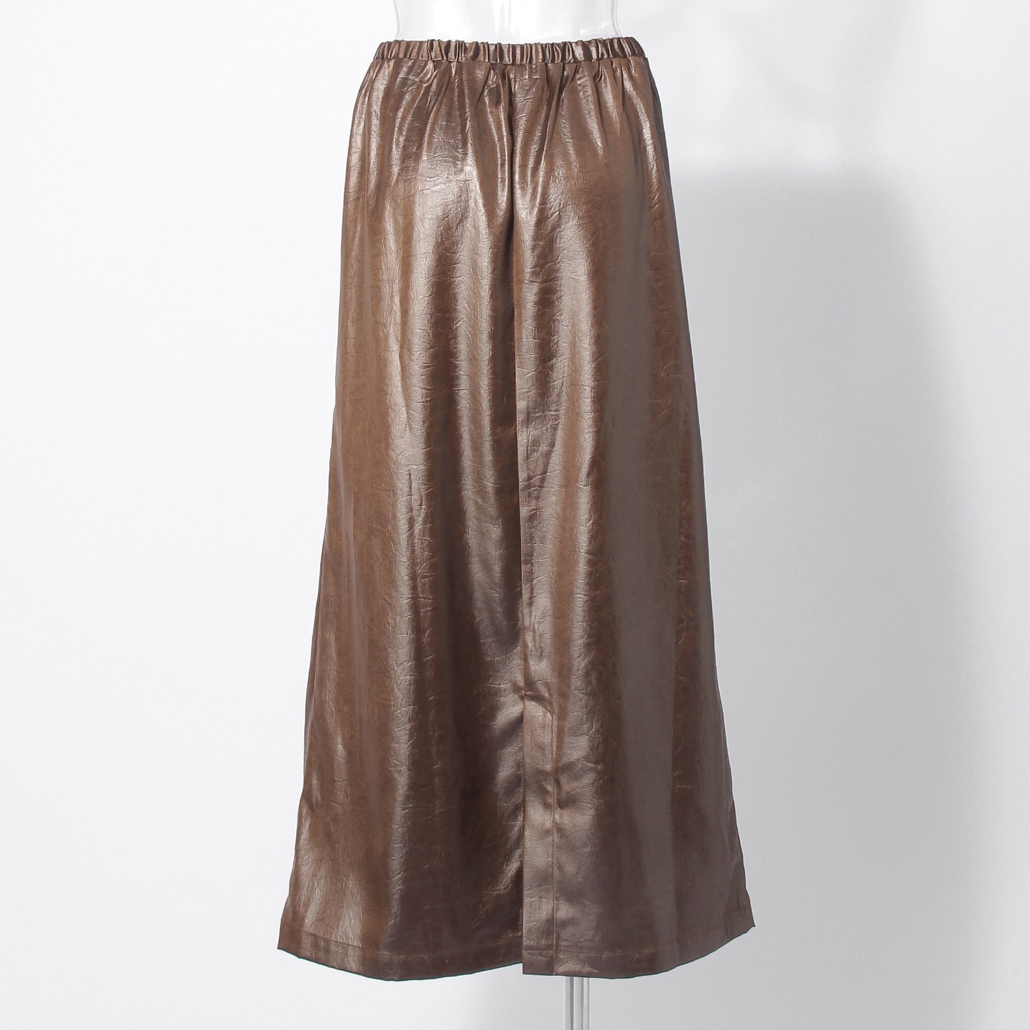 光沢のある美しい表情が特徴のスカート。レザーのような生地の風合いに視線を奪われる1枚です。裾にかけて広がり過ぎないナローシルエットで、上品さも忘れないのが嬉しいところ。清涼感のある素材との相性も良く、異素材ミックスのコーディネートにもおすすめです。