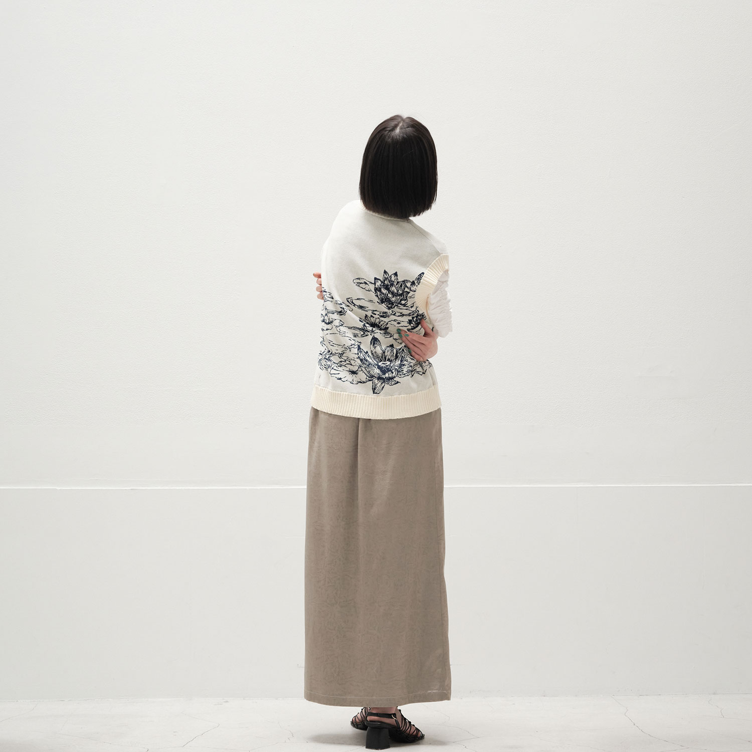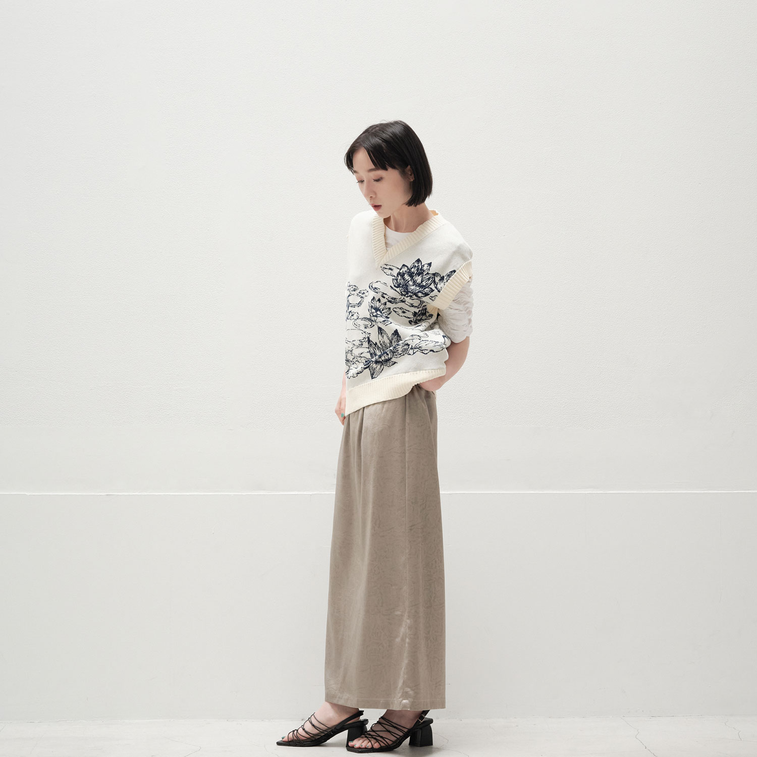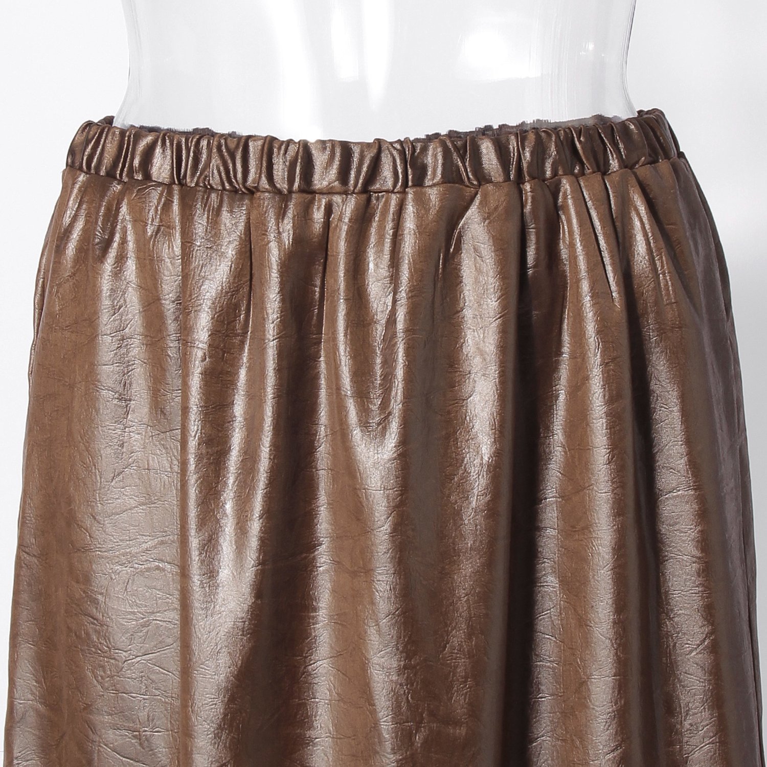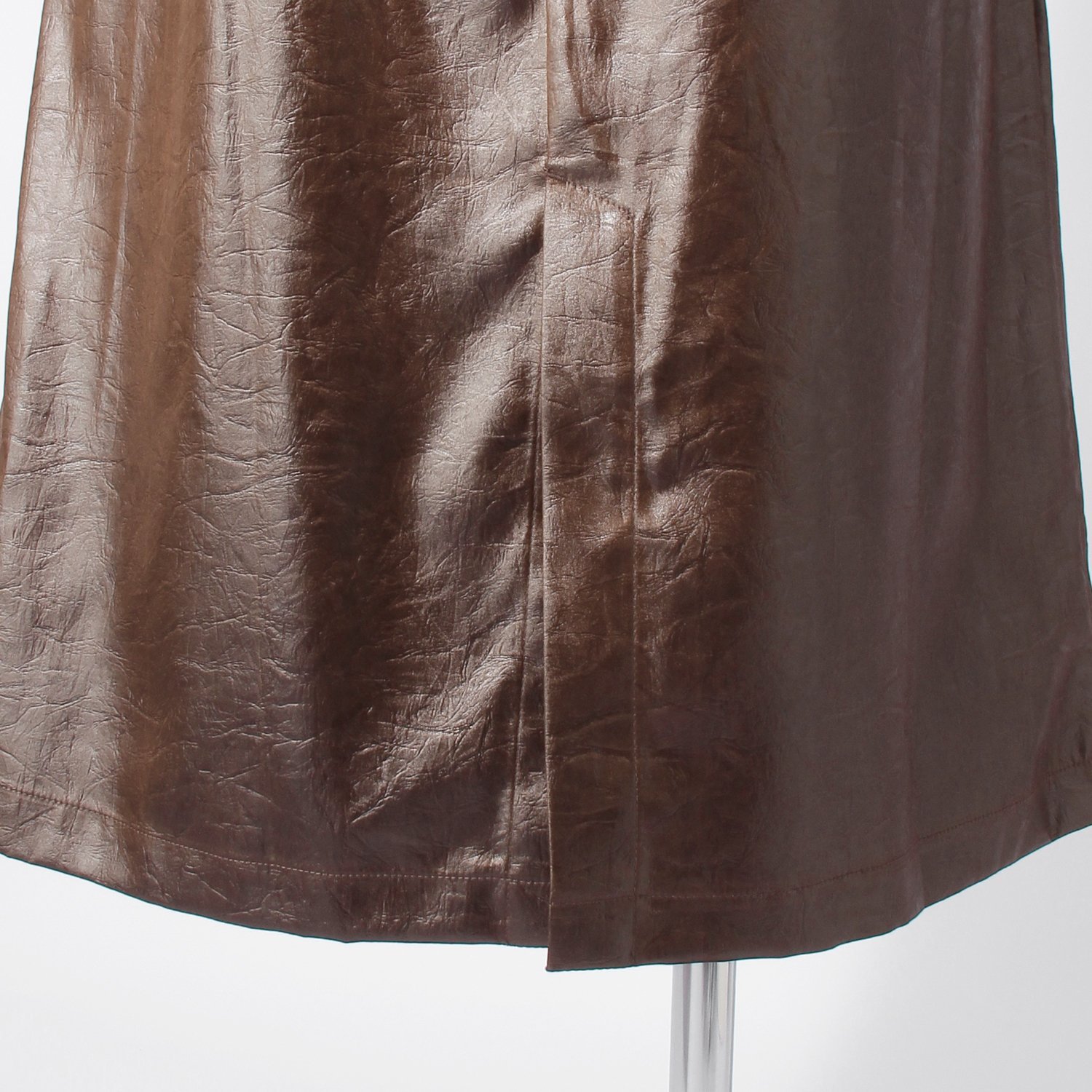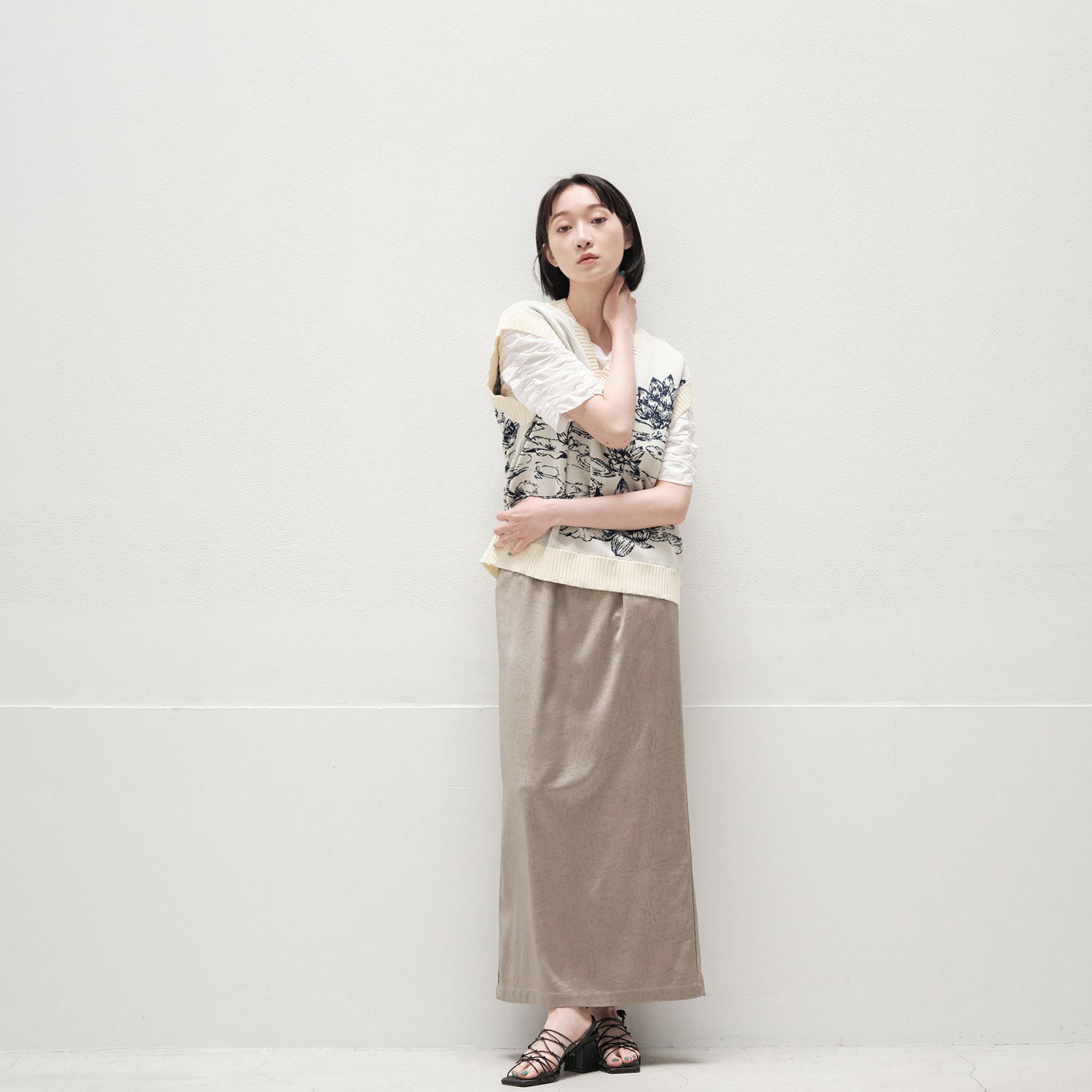 光沢のある美しい表情が特徴のスカート。レザーのような生地の風合いに視線を奪われる1枚です。裾にかけて広がり過ぎないナローシルエットで、上品さも忘れないのが嬉しいところ。清涼感のある素材との相性も良く、異素材ミックスのコーディネートにもおすすめです。