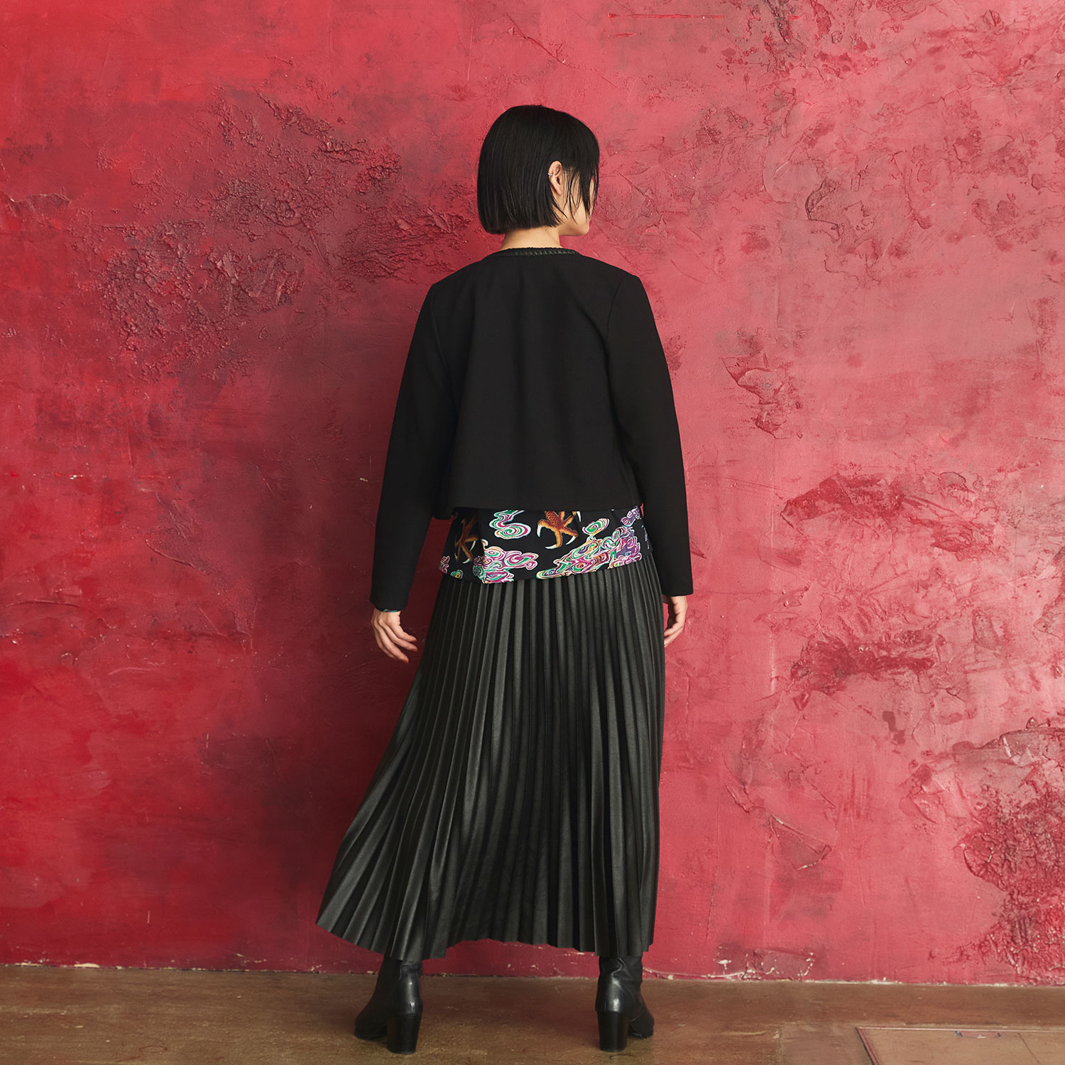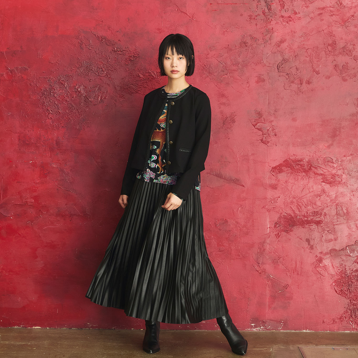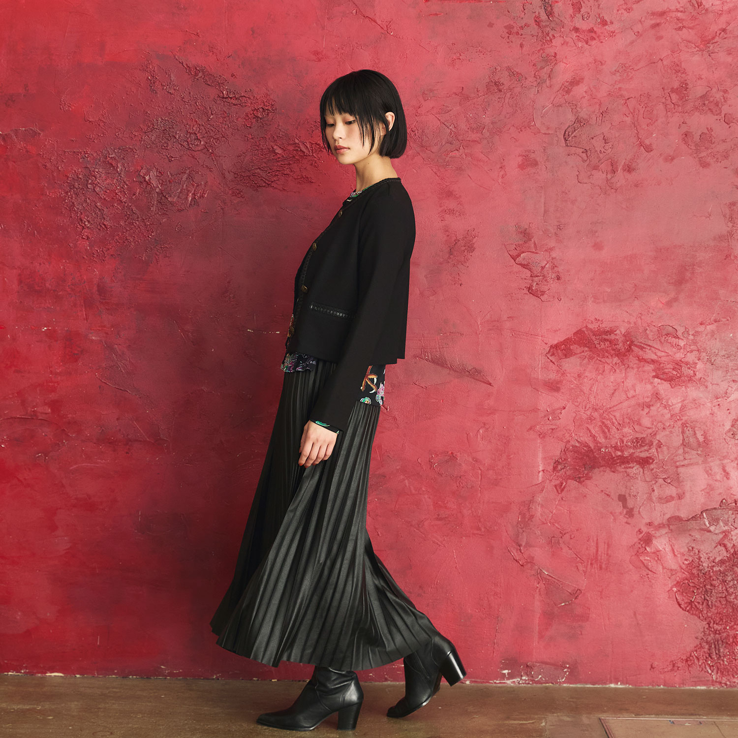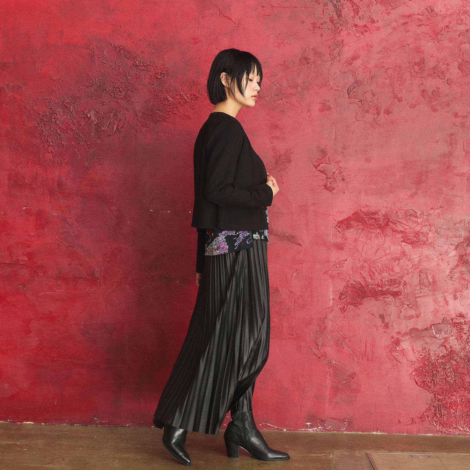 合繊素材を使用し、レザーのような質感を表現したスカート。奥行きのある独特な表情とプリーツ加工が相まって、視線を集めるデザイン性を確立しました。しっかりとした見ためながらも軽い仕様で、幅広いシーズンにはけるのも魅力のひとつです。