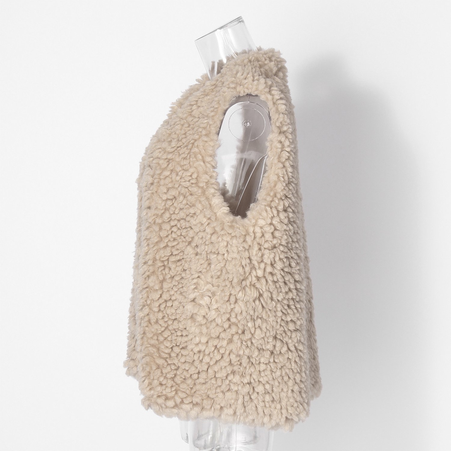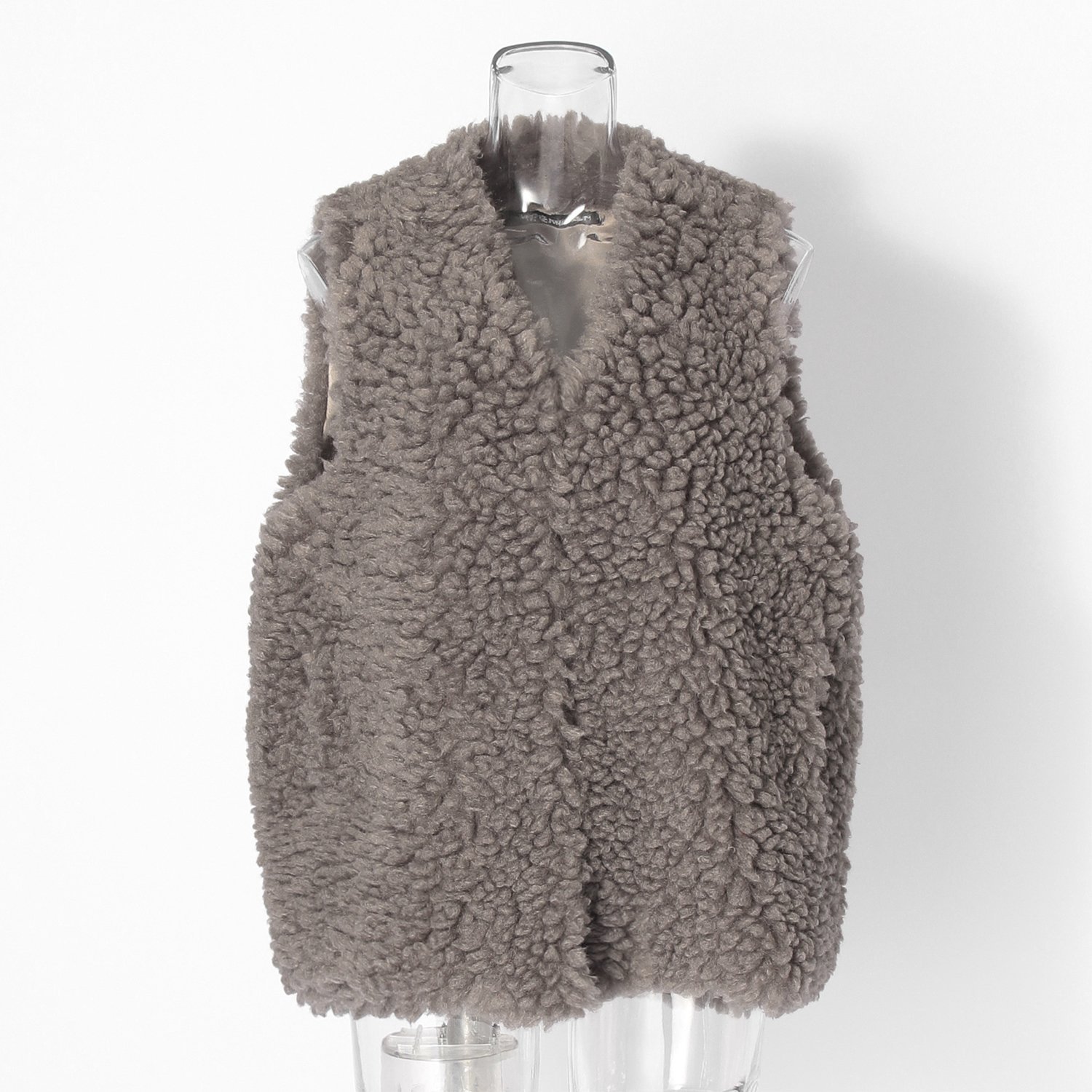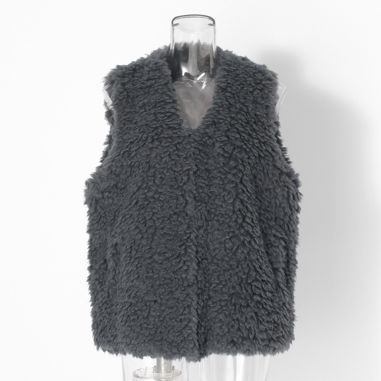 もこもことしたシルエットで、やわらかな表情のベスト。束感のある大きめのカーリーファーを使用し、ぬくもりたっぷりに仕上げました。素材がインパクトを放ち、シンプルに合わせてもしっかりと着映えするのが嬉しいところ。後ろ下がりのラインでサイドショットまで美しく演出してくれます。