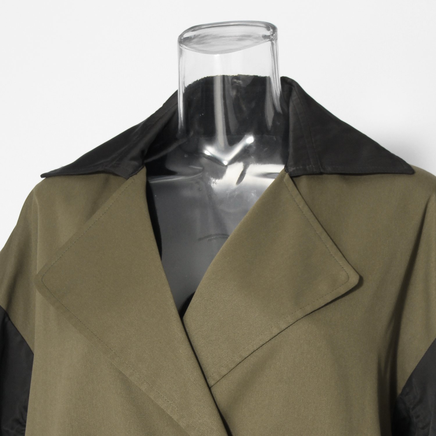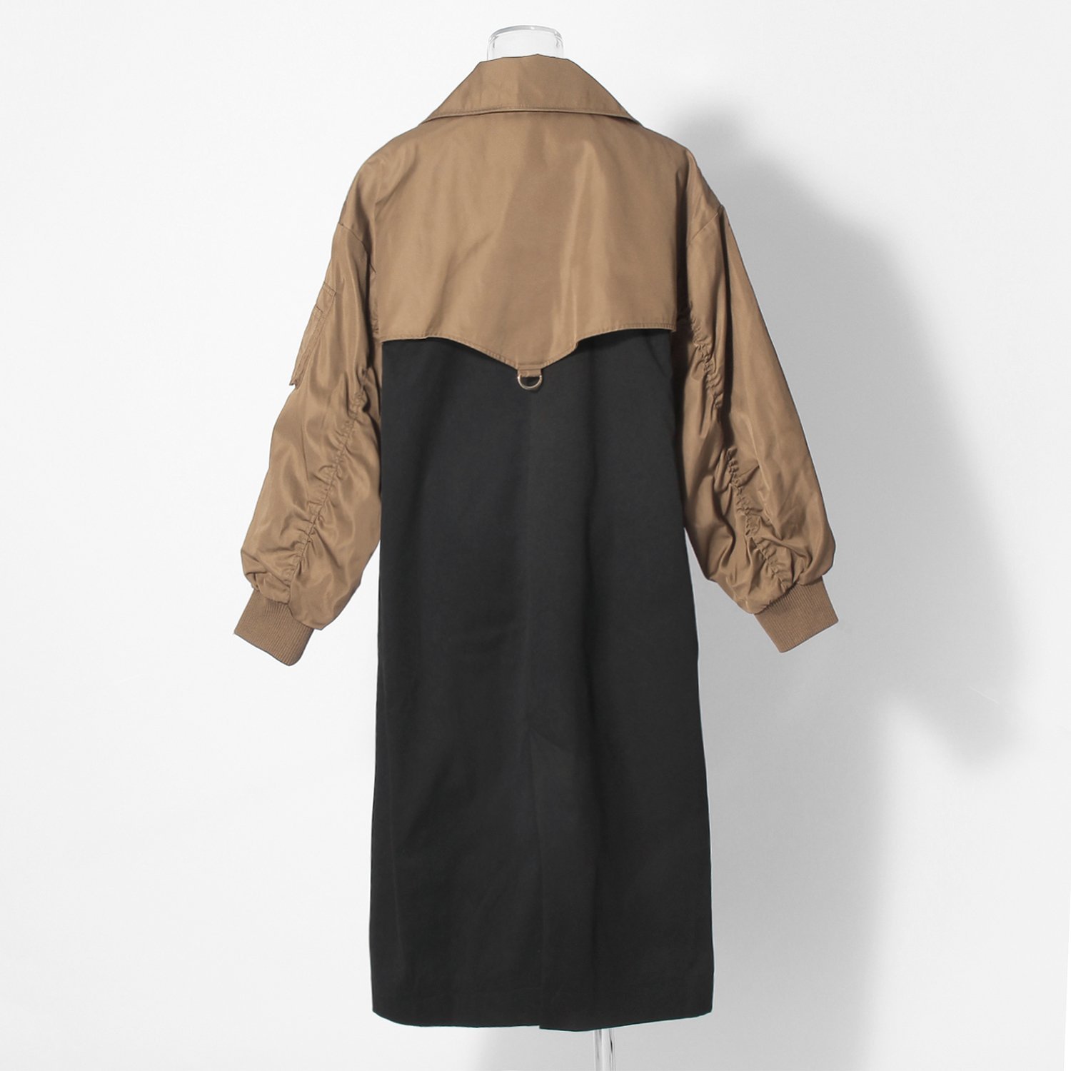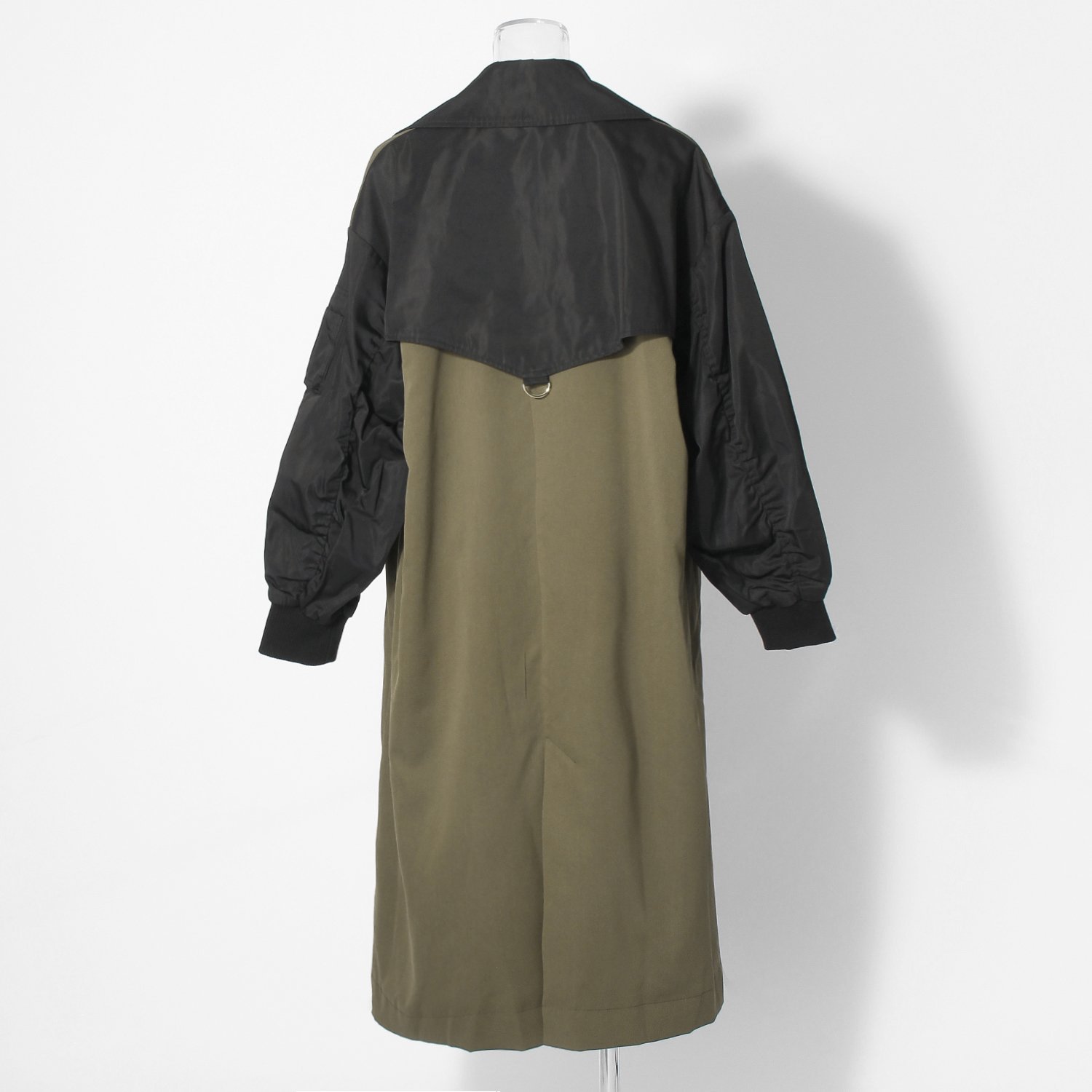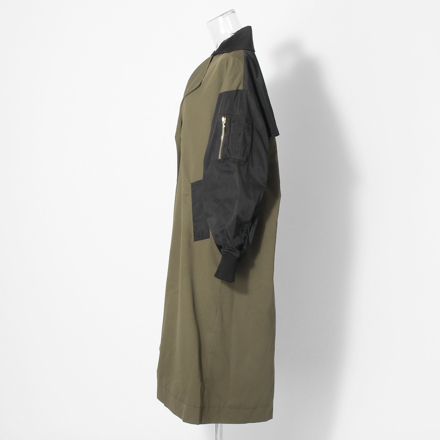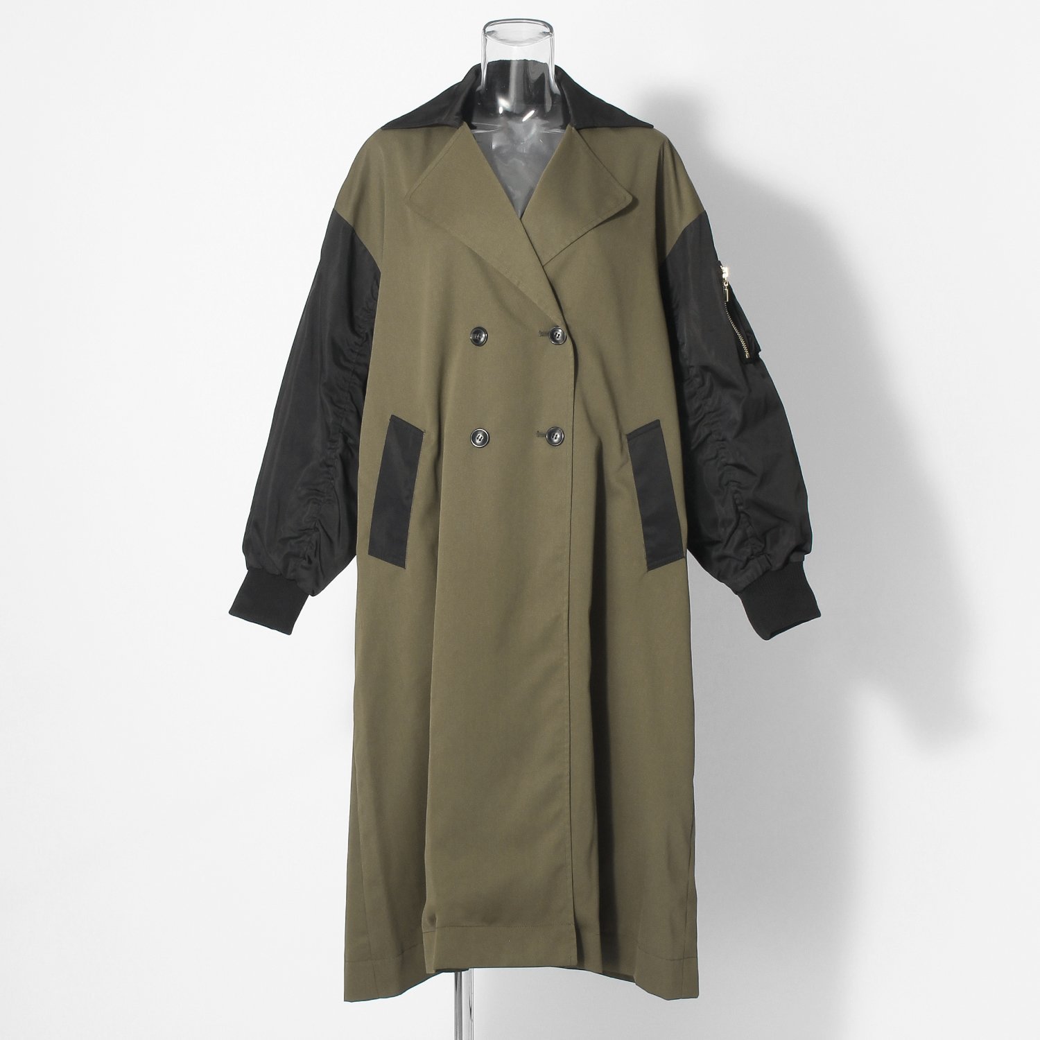 バイカラーが特徴的なロングコート。クラシカルなトレンチ型とミリタリーなスリーブのディテールを組み合わせ、テイストミックスに仕上げました。普段の装いにプラスするだけで、スタイリングをぐっと都会的に見せてくれる1着です。
