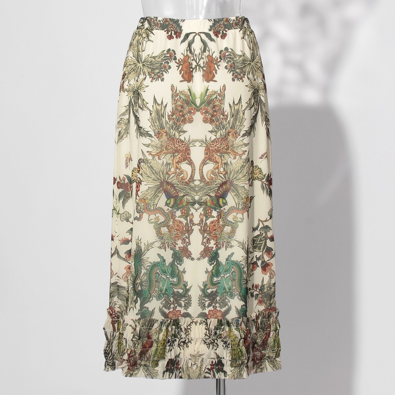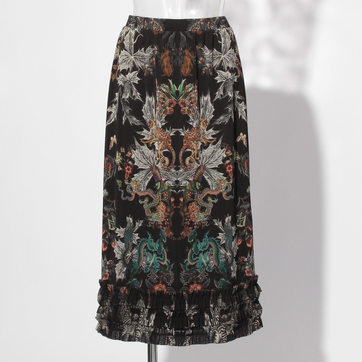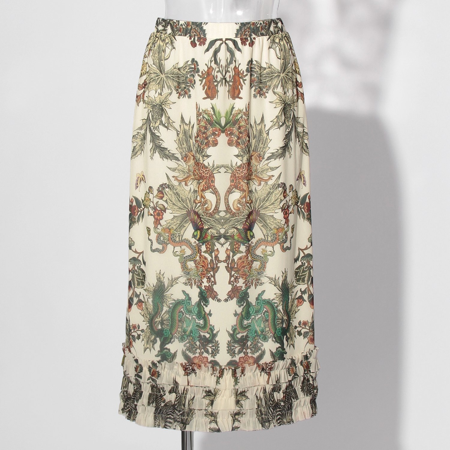 干支を祝うメッセージを込めた、動物たちのモチーフが華やかに彩るスカート。色鮮やかなゾディアックプリントがスタイリングに存在感をプラス。裾には同プリントでフリルを重ね、トレンド感のあるデザインに仕上げました。同シリーズのブラウスと合わせて、セットアップでの着こなしもおすすめです。