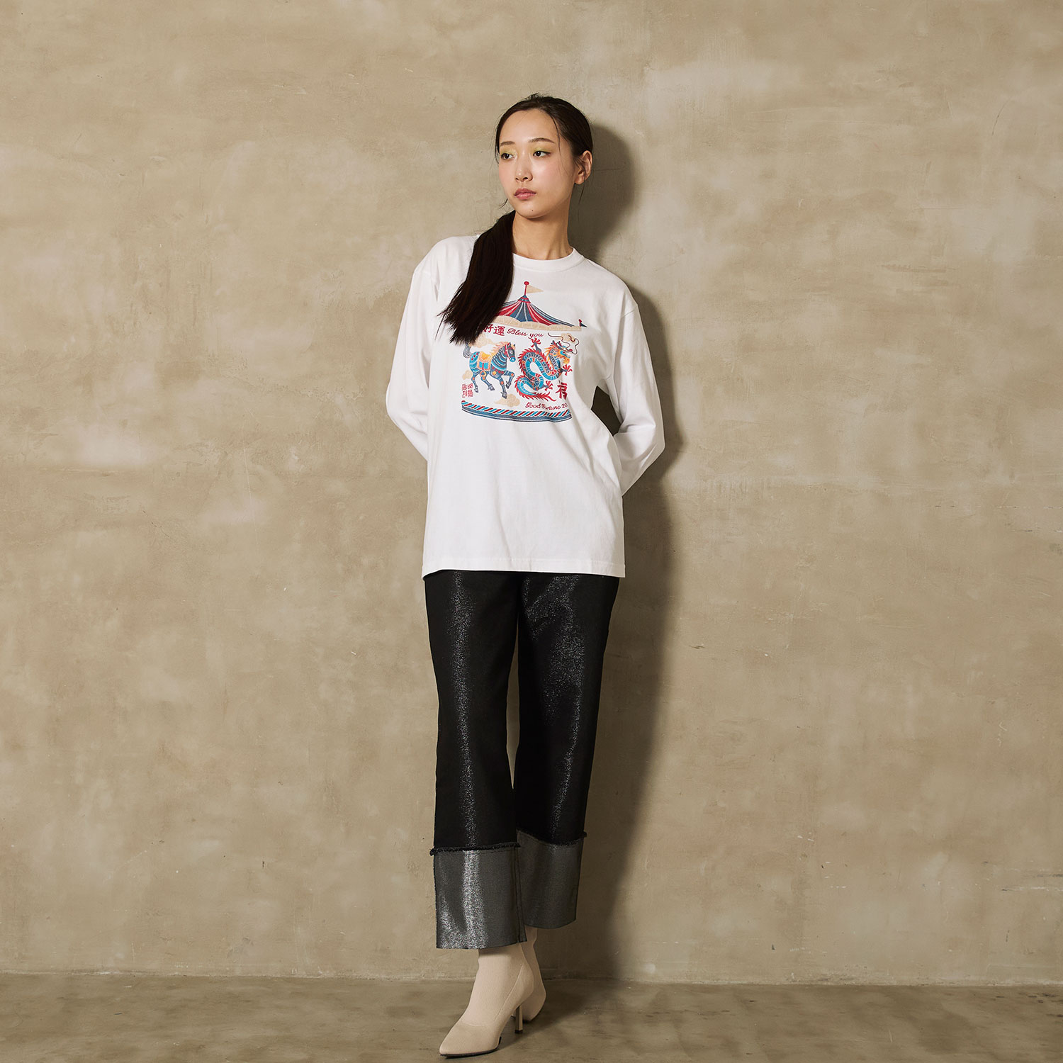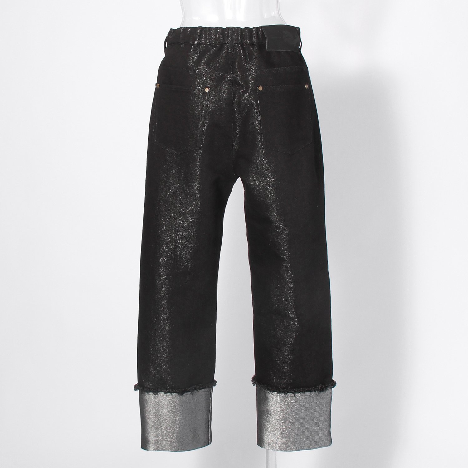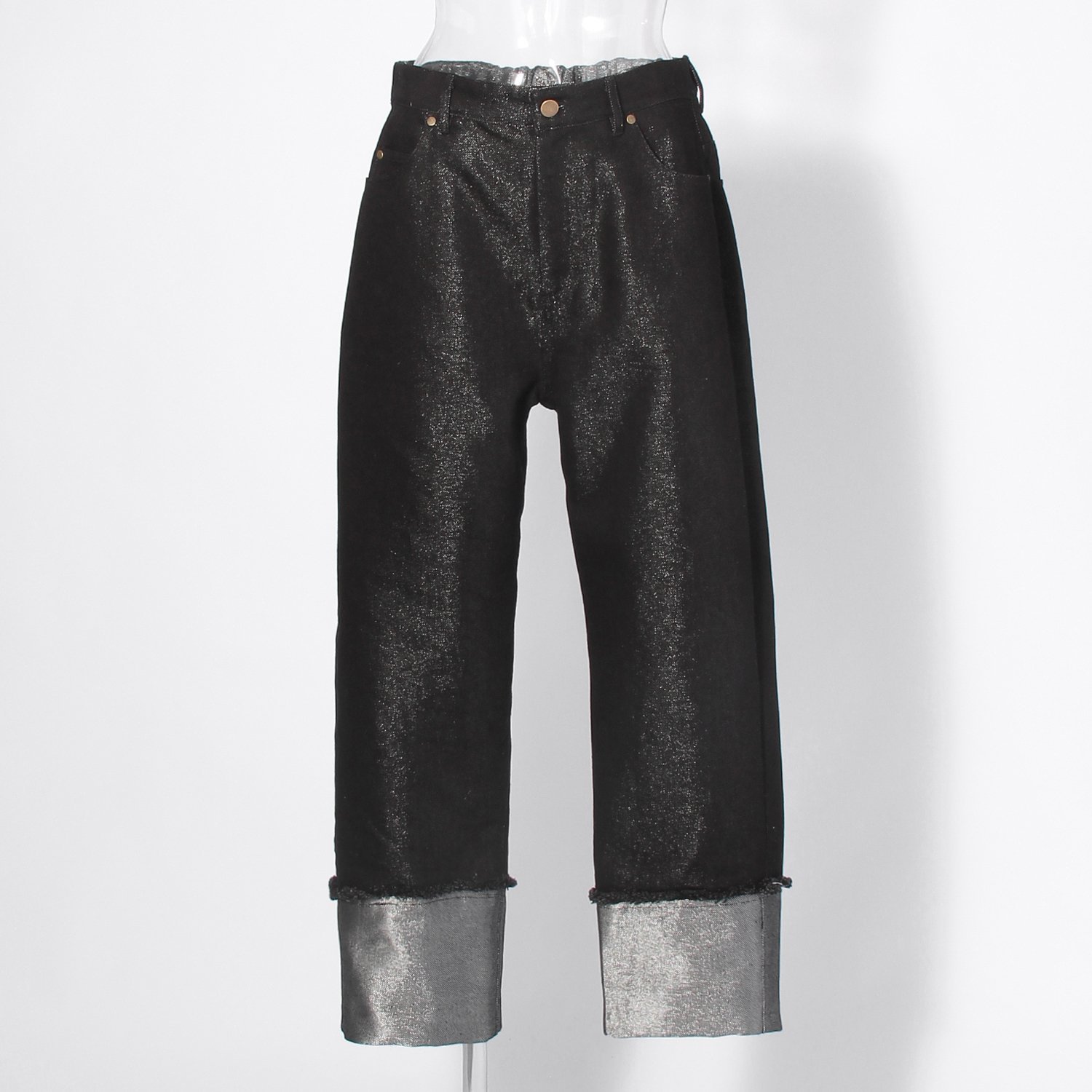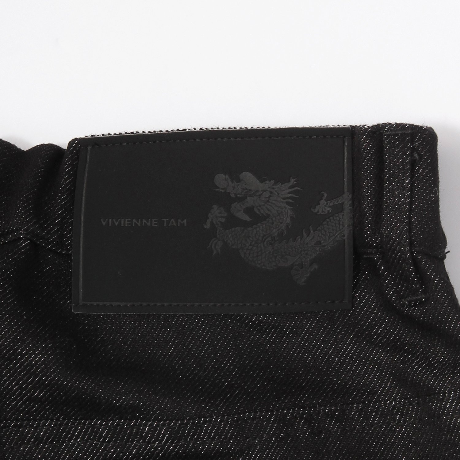 大きく折り返したようなデザインが特徴のデニムパンツ。ブラックとシルバーを組み合わせた、ギラっとした光沢が存在感を放つ1本です。ゆとりを持たせたシルエットで、締め付けが少ないのも嬉しいところ。レイヤードスカートを重ねた、奥行きのあるコーディネートもおすすめです。スウェード調のオリジナルドラゴンパッチ、ダブルハピネスの彫りを施したリベットが上質感とオリジナリティを引き立てます。