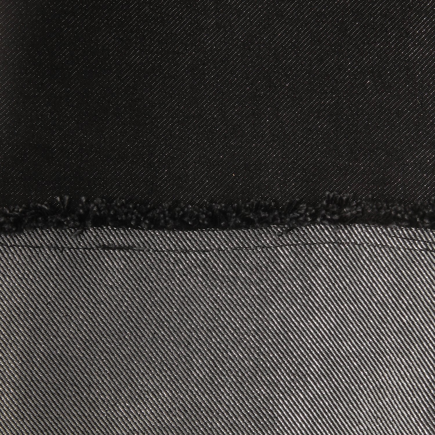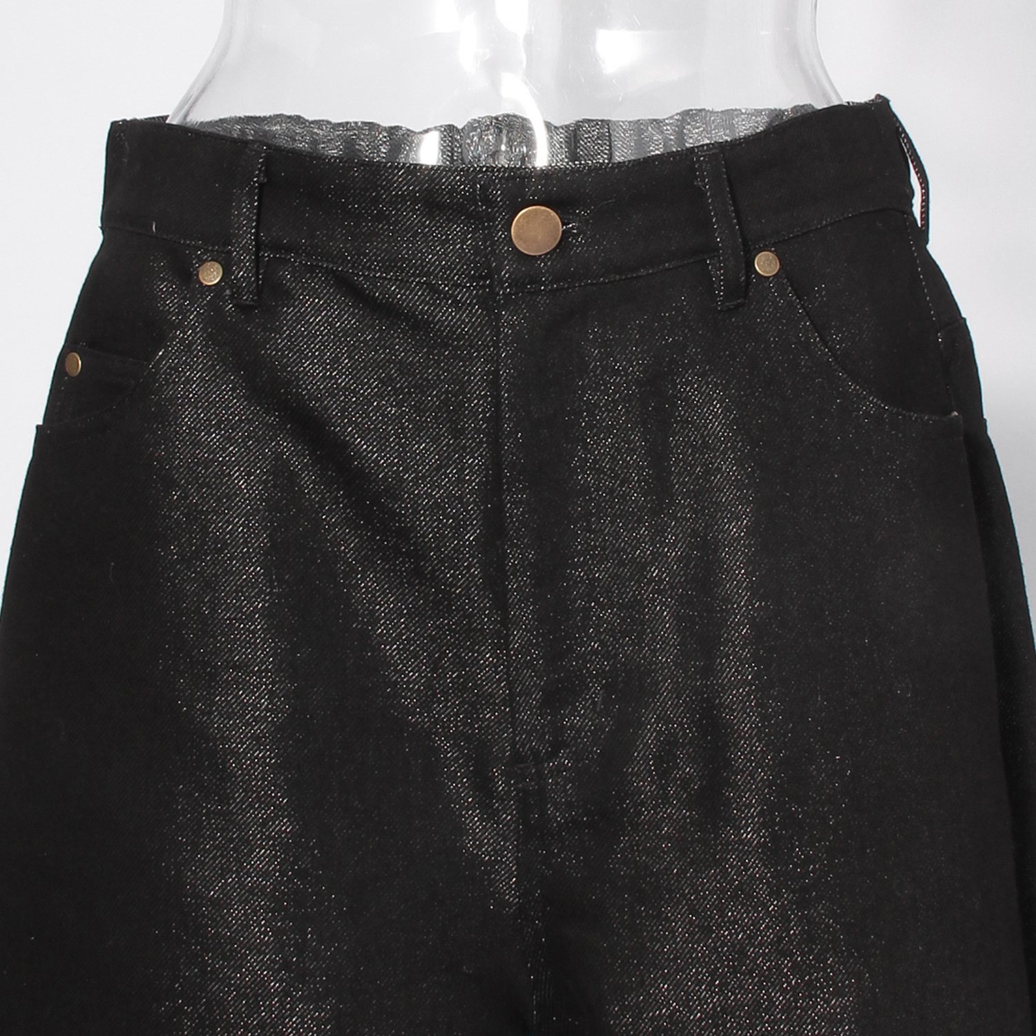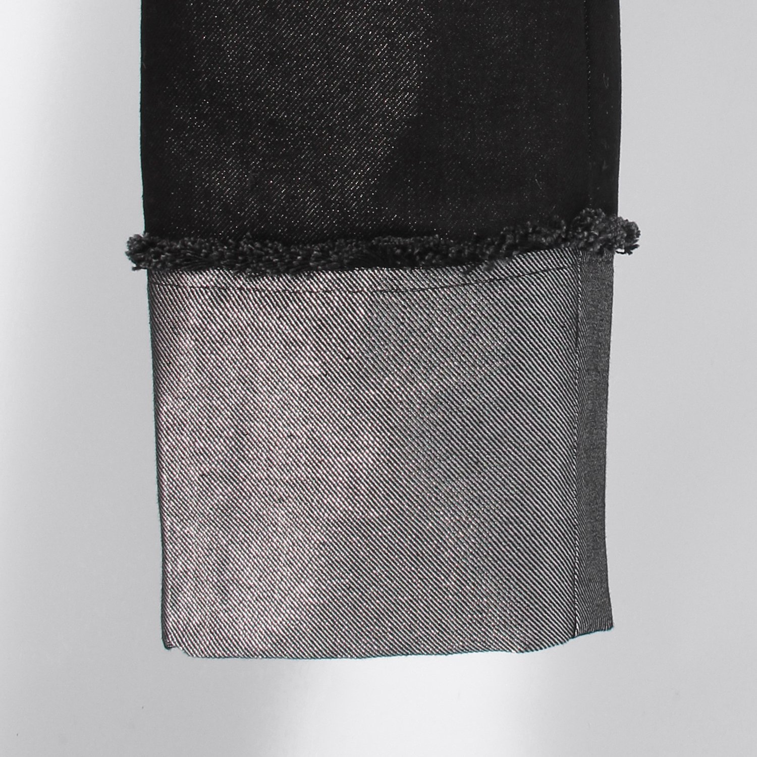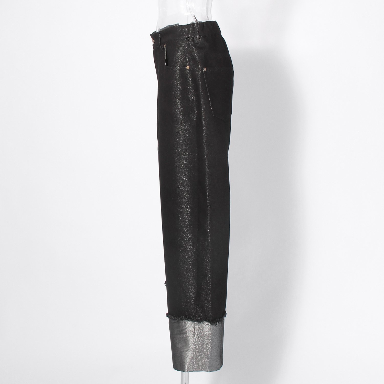 大きく折り返したようなデザインが特徴のデニムパンツ。ブラックとシルバーを組み合わせた、ギラっとした光沢が存在感を放つ1本です。ゆとりを持たせたシルエットで、締め付けが少ないのも嬉しいところ。レイヤードスカートを重ねた、奥行きのあるコーディネートもおすすめです。スウェード調のオリジナルドラゴンパッチ、ダブルハピネスの彫りを施したリベットが上質感とオリジナリティを引き立てます。