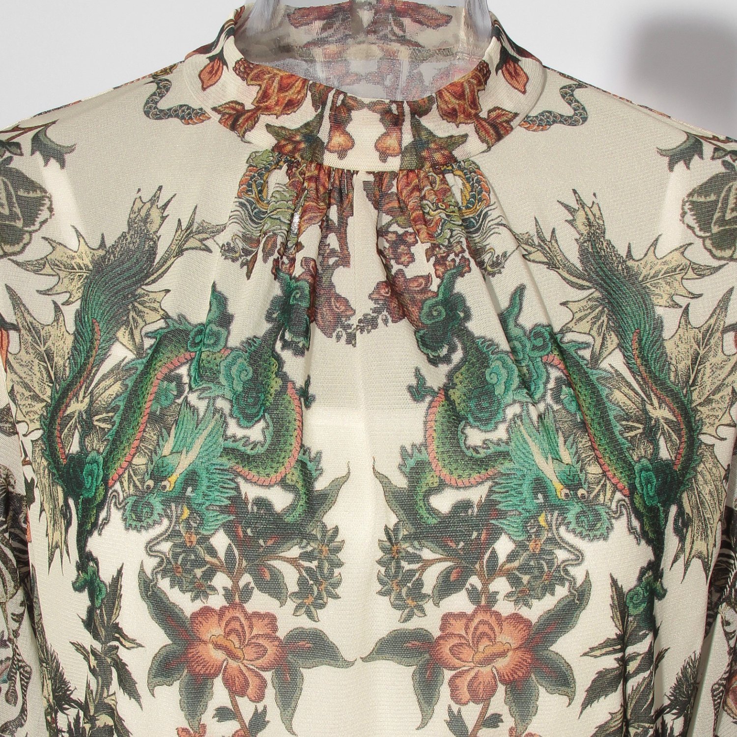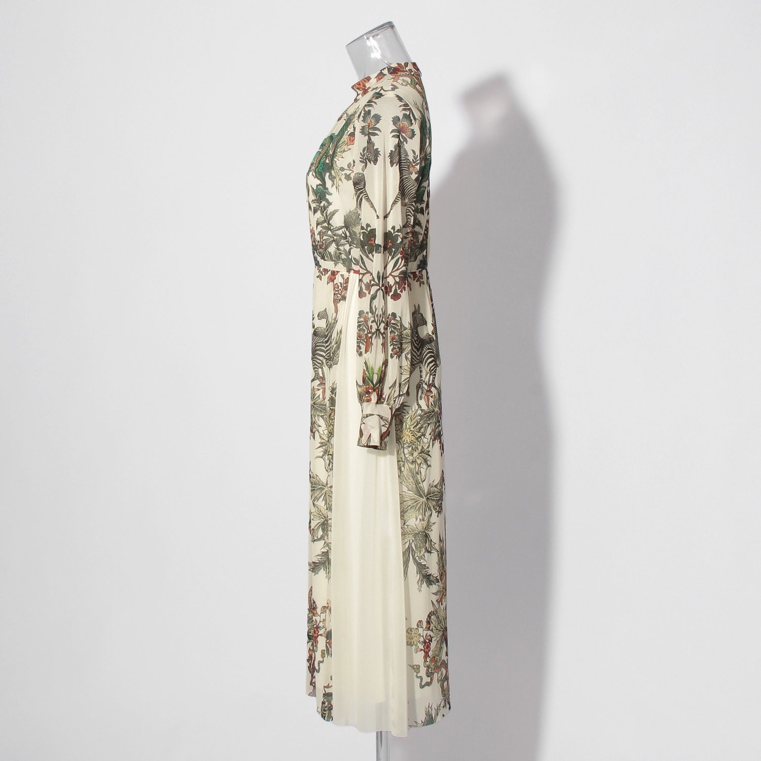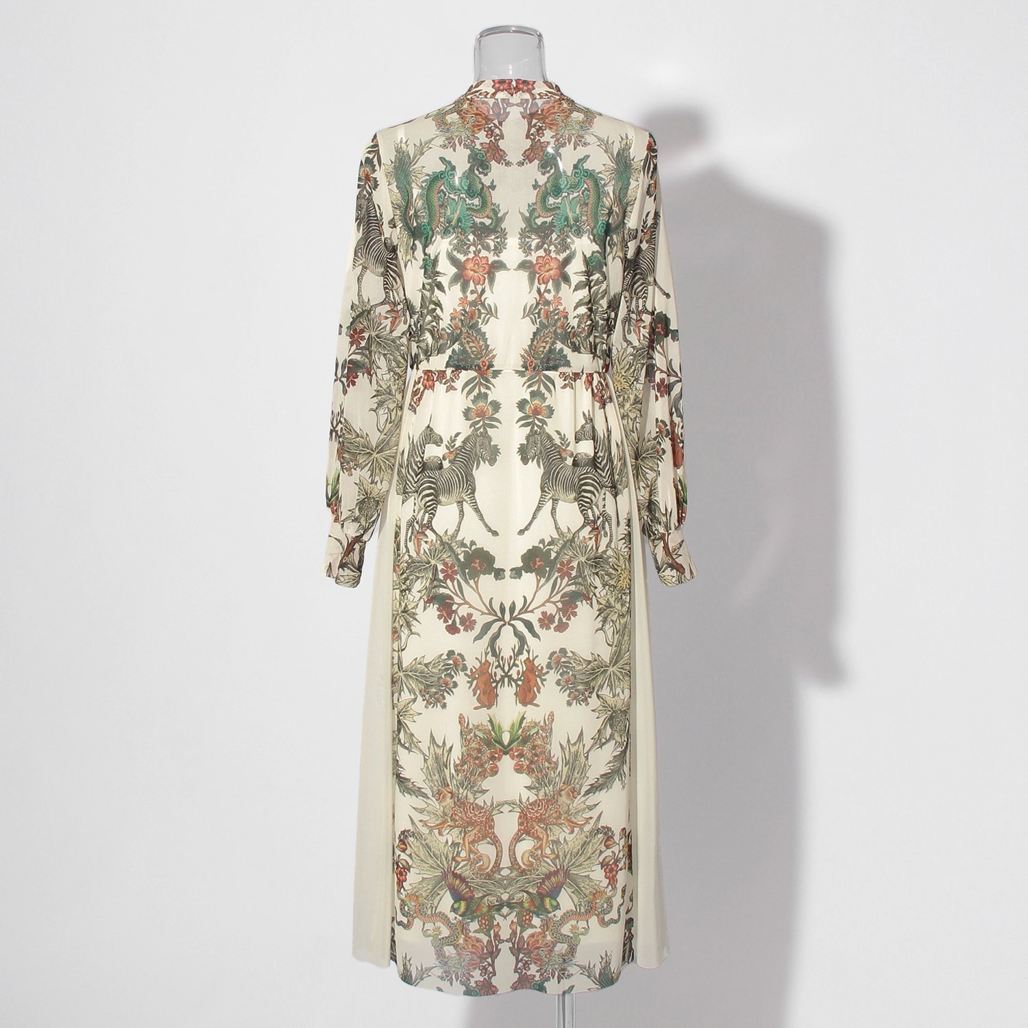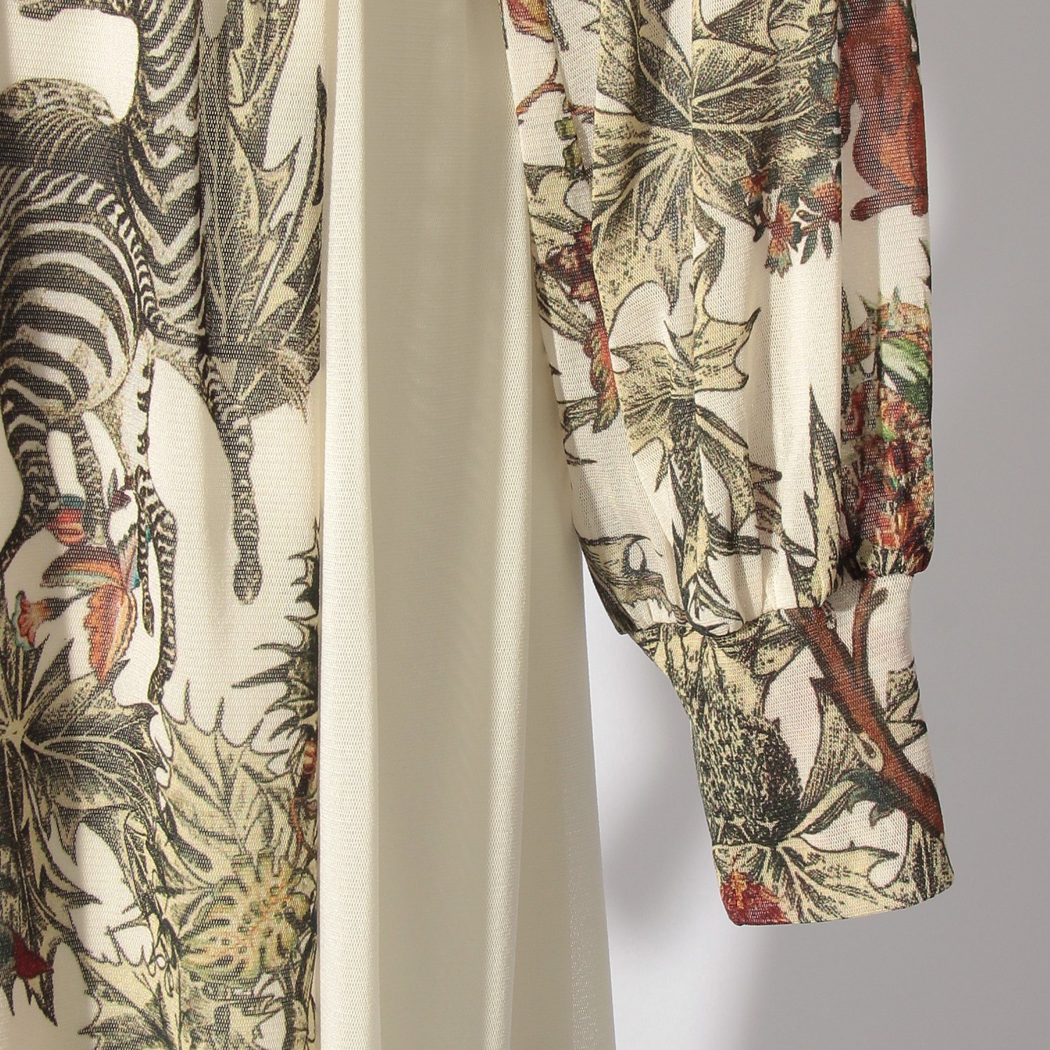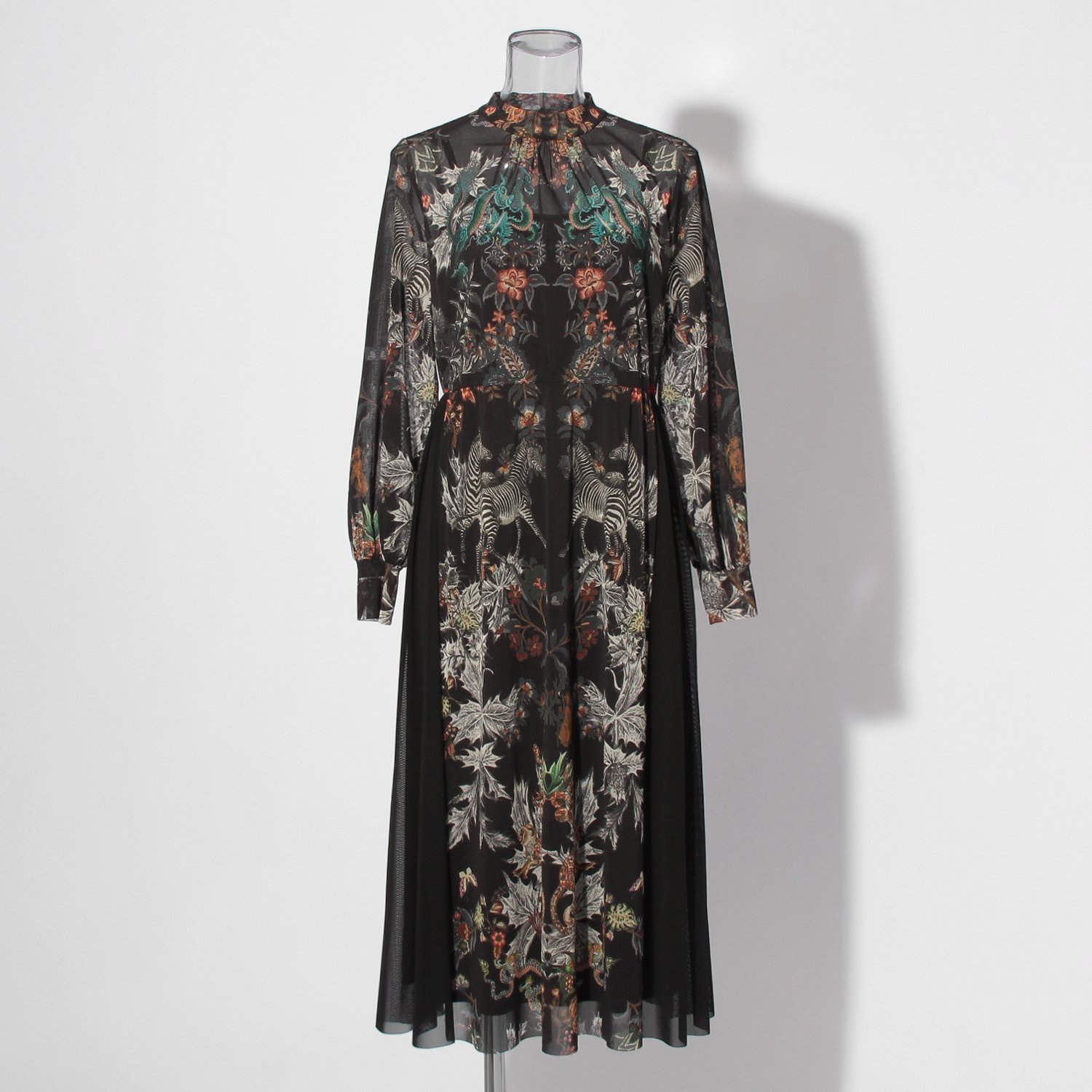 1枚で華やかなシルエットを描き出すフィット&フレアのワンピース。干支を祝うメッセージを込めた「ゾディアックプリント」を総柄で表現し、個性豊かなデザインが印象的。ややハイネックの首元とパフスリーブ、高めのウエストラインでスタイルアップも期待でき、上品な佇まいを演出します。