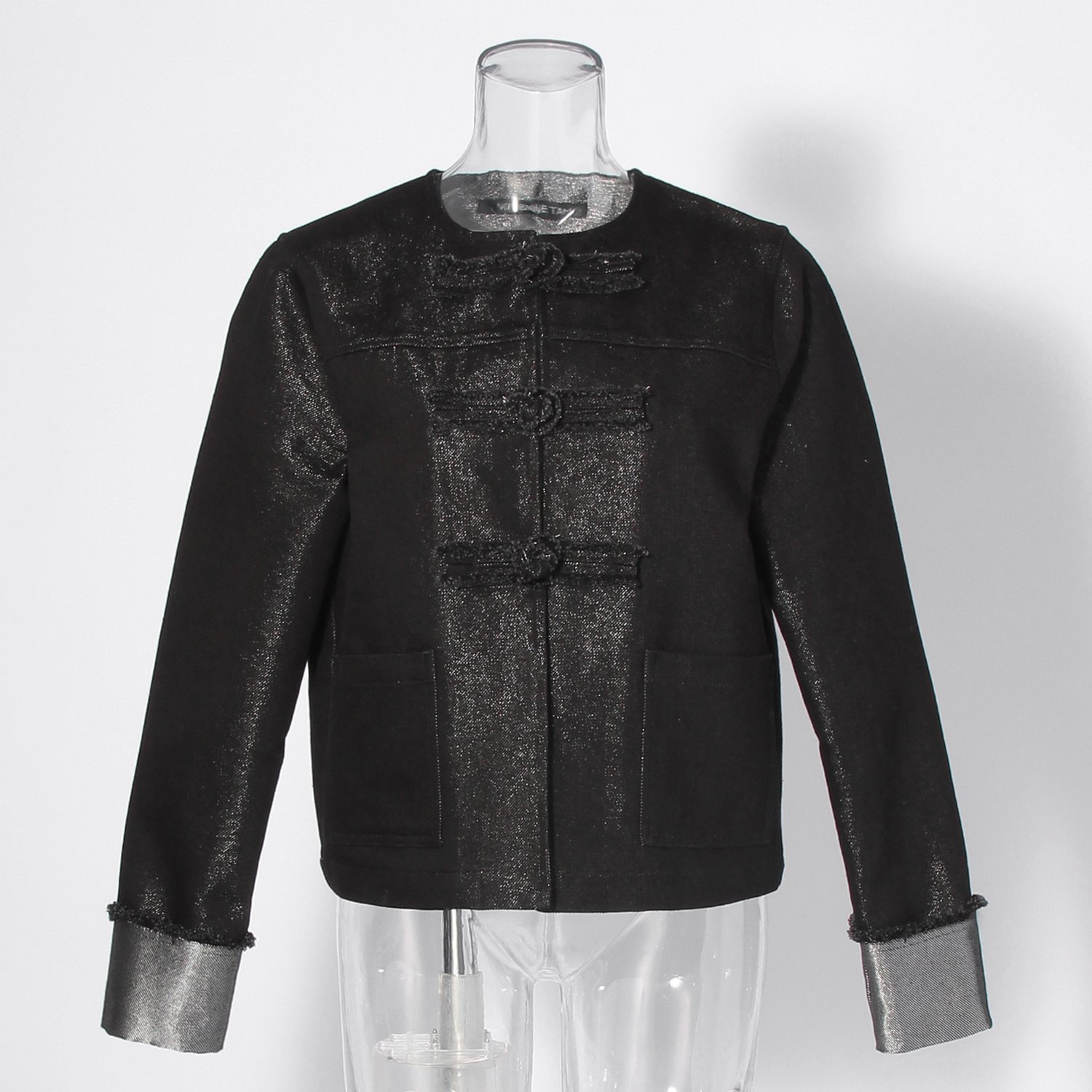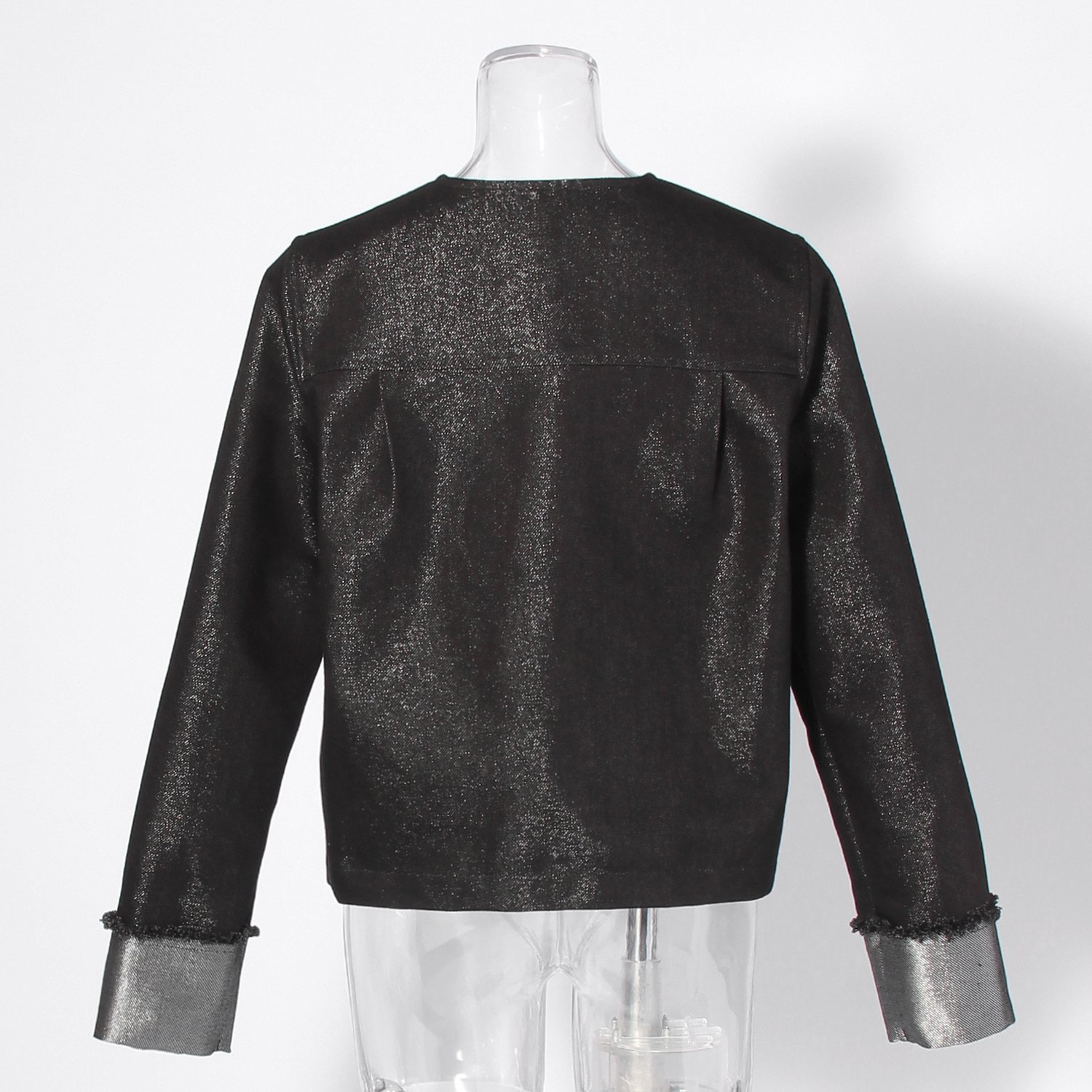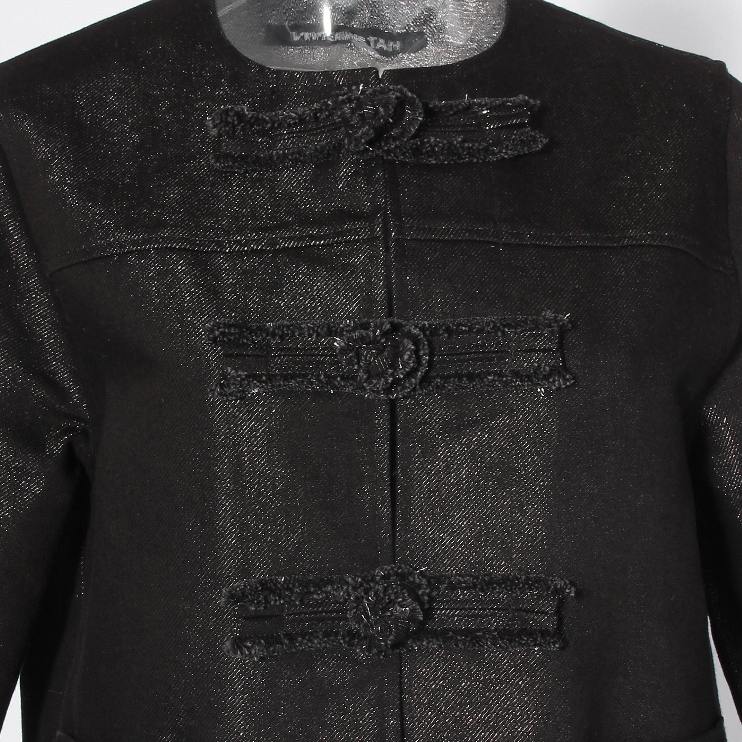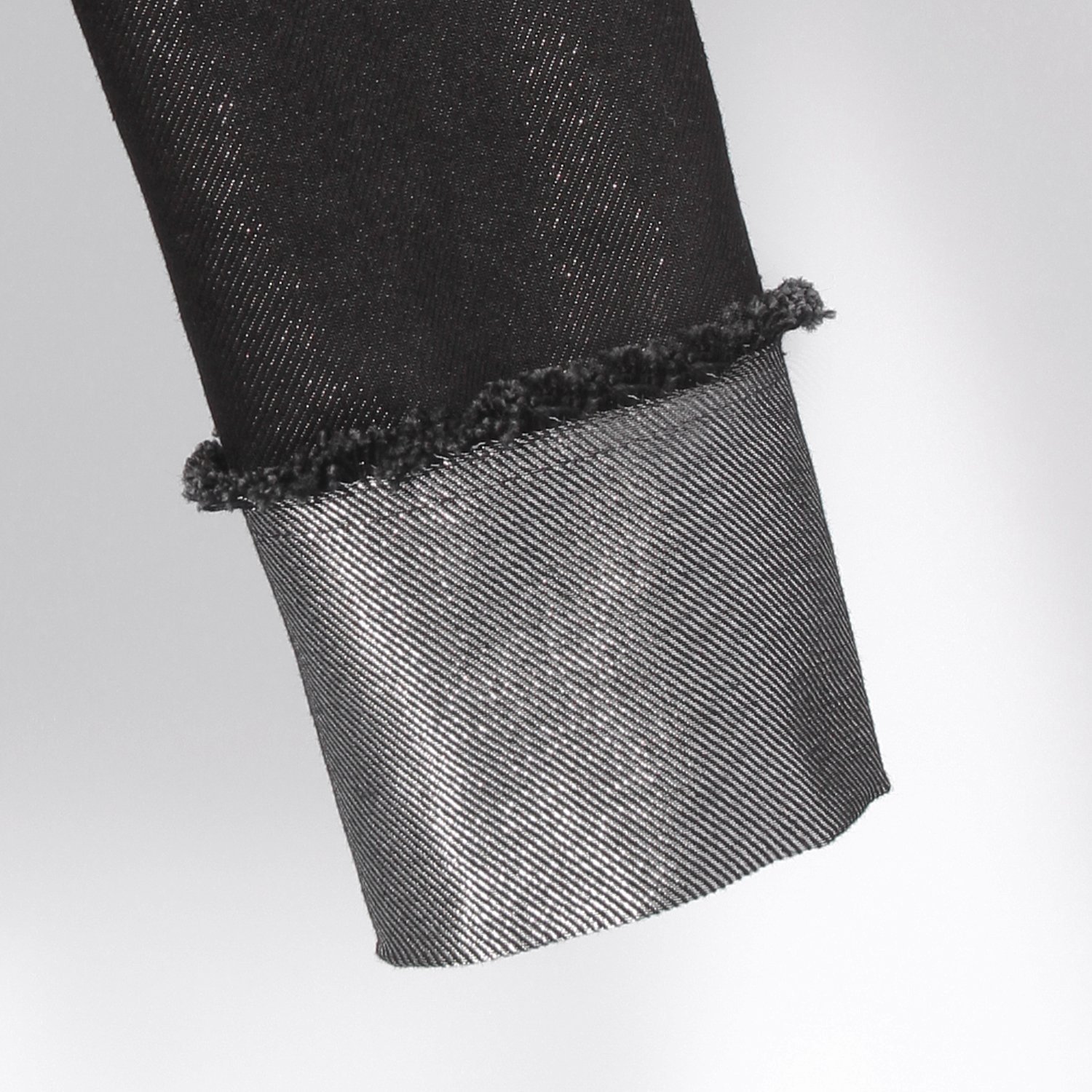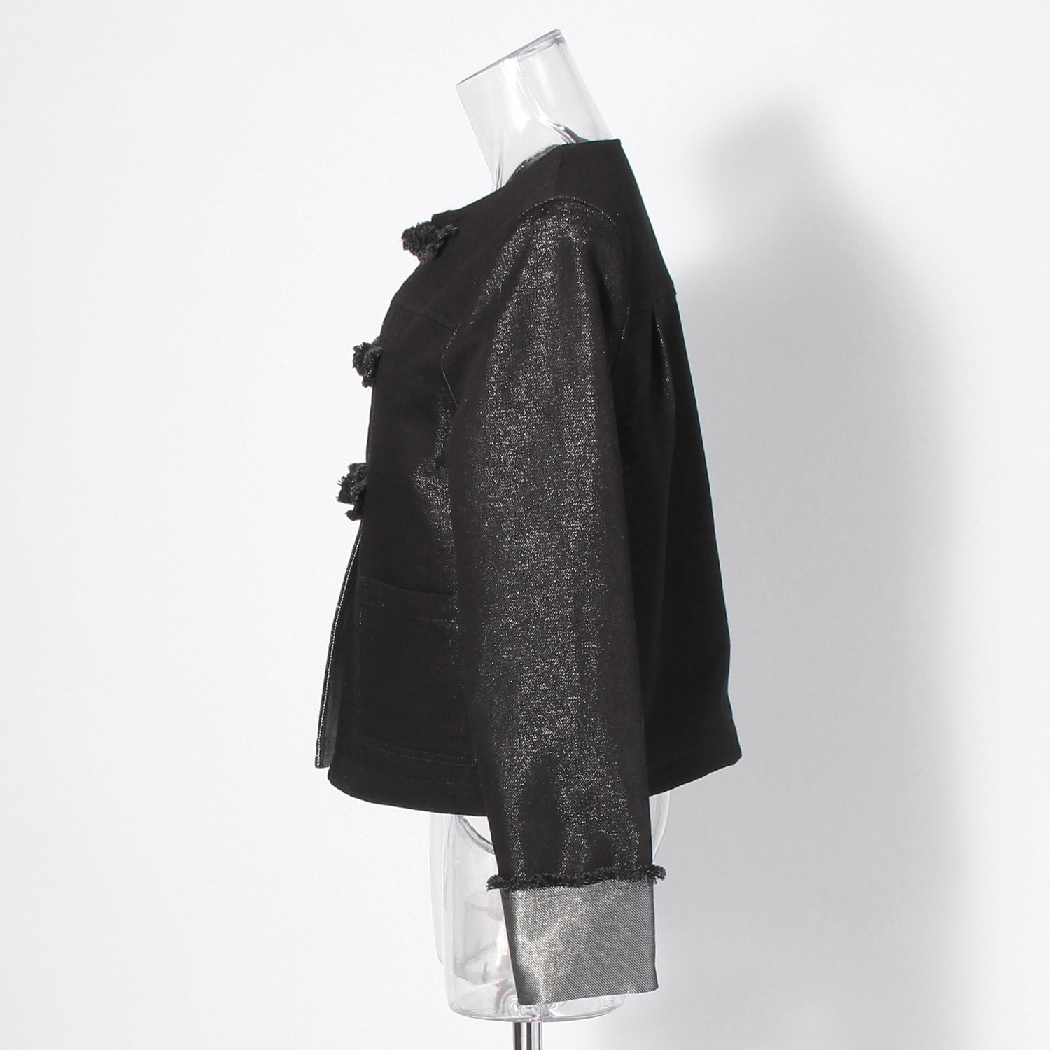 きらめくディテールがエッジを効かせるデニムジャケット。シックなダークカラーに映える、シルバーのラメがインパクトを放ちます。VIVIENNE TAMらしいチャイナボタンをアクセントに、袖口を大きく折り返したようなデザインも見逃せません。