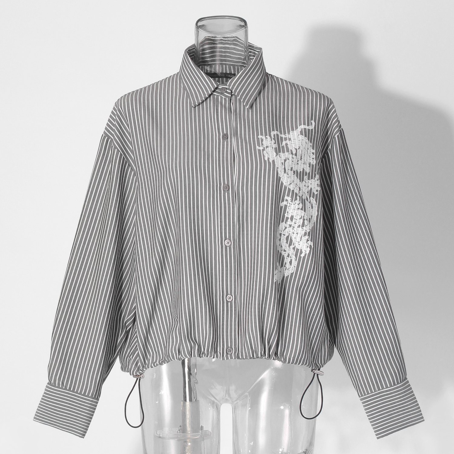 シャツ羽織デザインのトップス。ゆったりと仕立てたオーバーサイズながら、裾に配したドローコードを絞ることでシルエットに変化を付けられます。前身頃には少し擦れたようなドラゴンのプリントを施し、ブランドらしいアクセントをプラスしました。コンパクトな着丈で、さりげないスタイルアップができるのも嬉しいところ。柄はストライプと無地の2種類の展開です。
