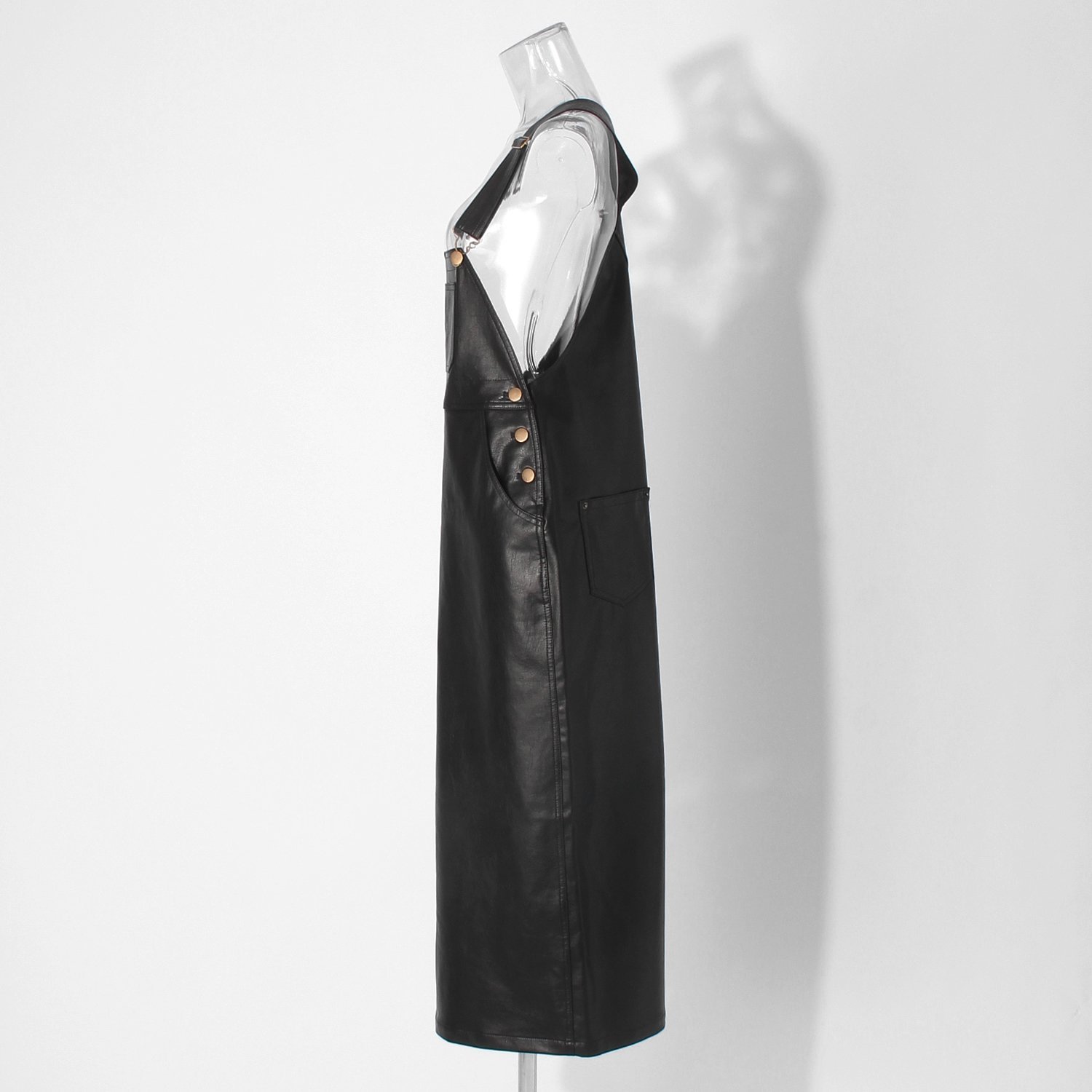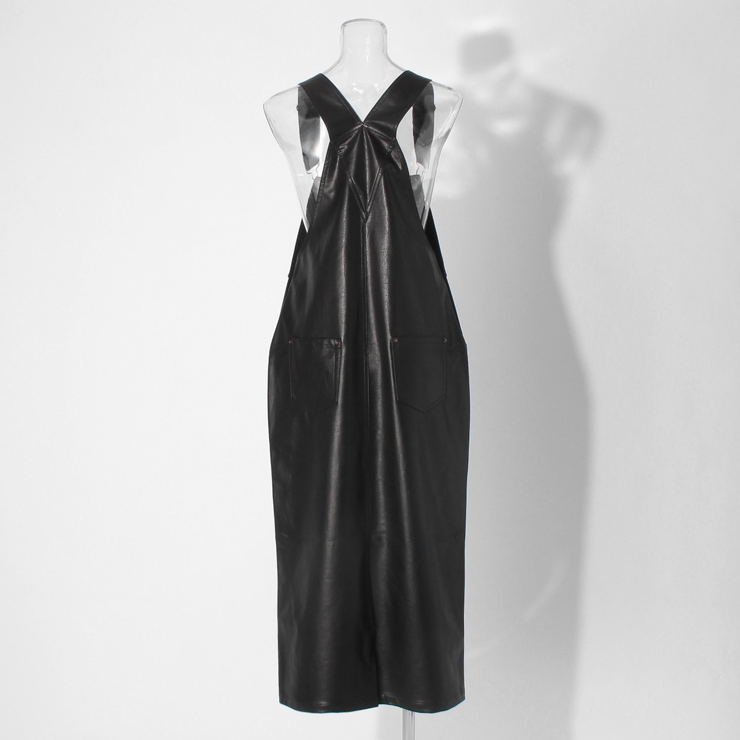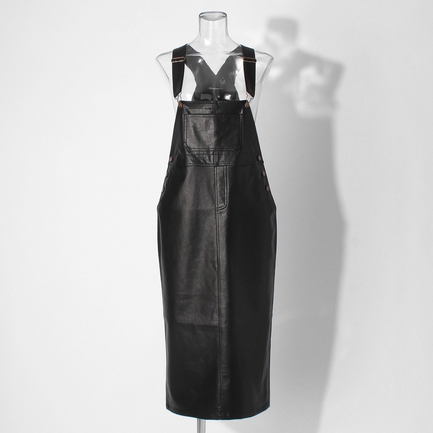 合皮素材を贅沢に使ったジャンパースカート。メンズライクなオーバーオールを、スカートデザインでシャープかつ格好良く仕上げました。カジュアルながらも美しい生地の表情で、上品さも損なわないのが嬉しいポイントです。裾にはスリットを配し、軽快な足元を演出。トレーナーやシャツアイテムとのコーディネートにもマッチします。