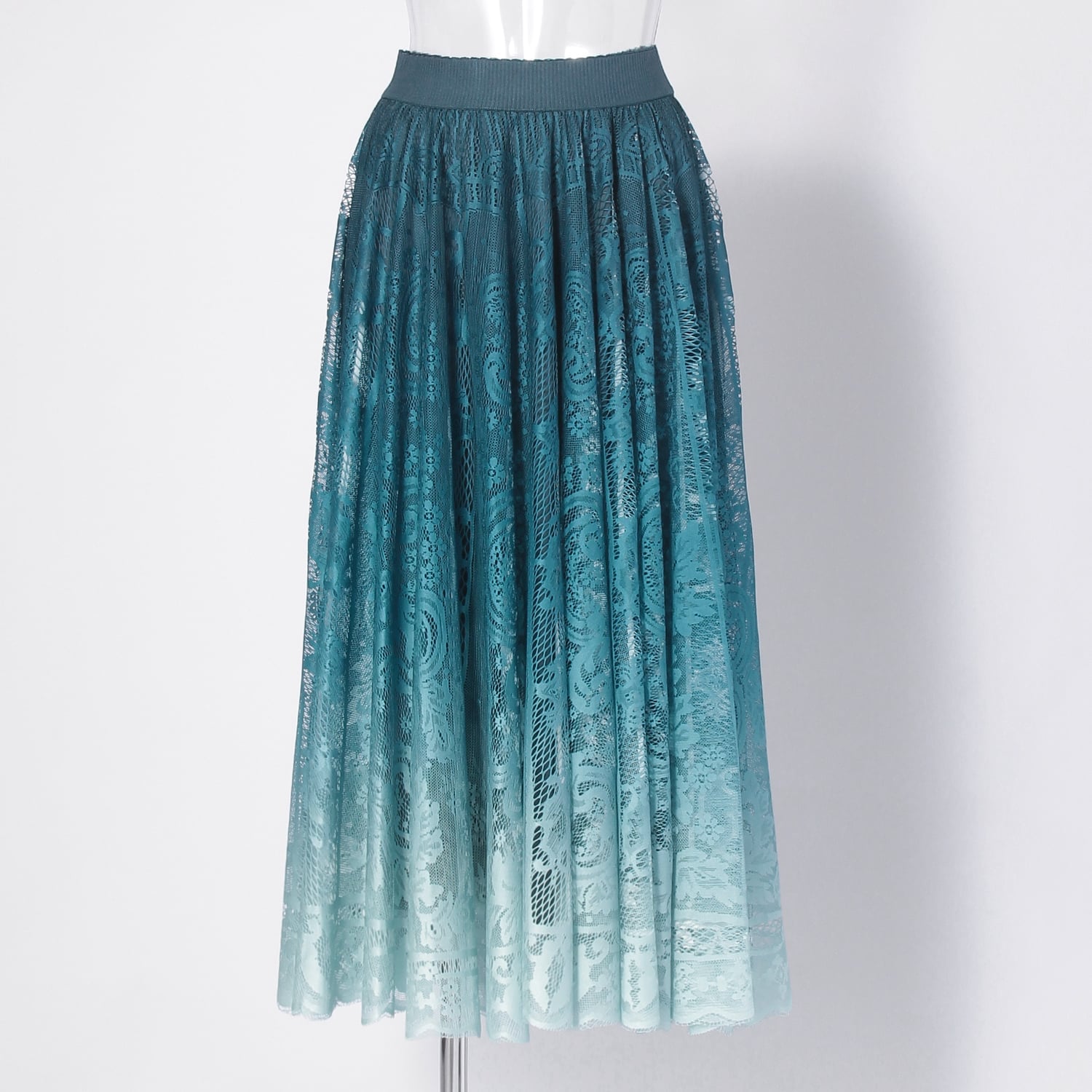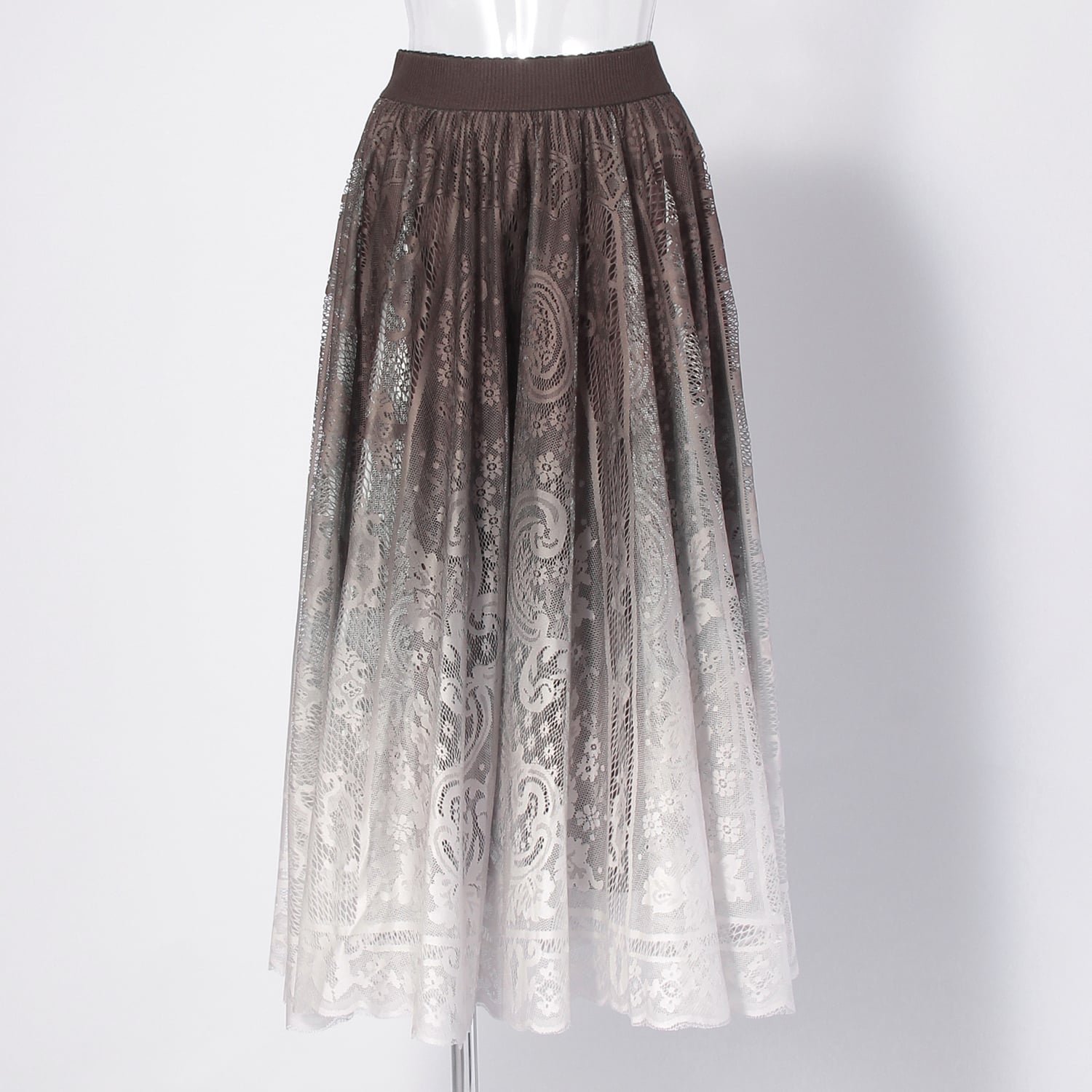グラデーションのレースが目を引くスカート。サークル状に裁断した生地を使用し、豊かなフレア分量で仕上げた贅沢感あふれる一着です。動くたびに美しく広がるシルエットが、エレガントな佇まいを演出してくれます。