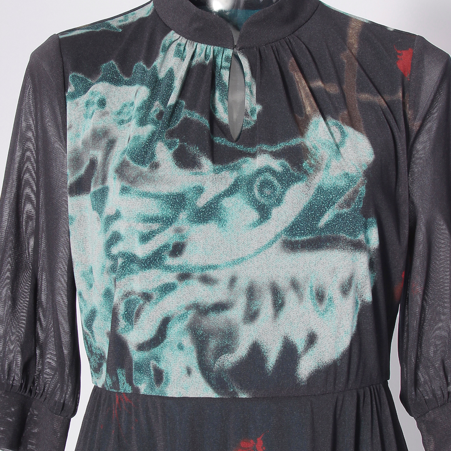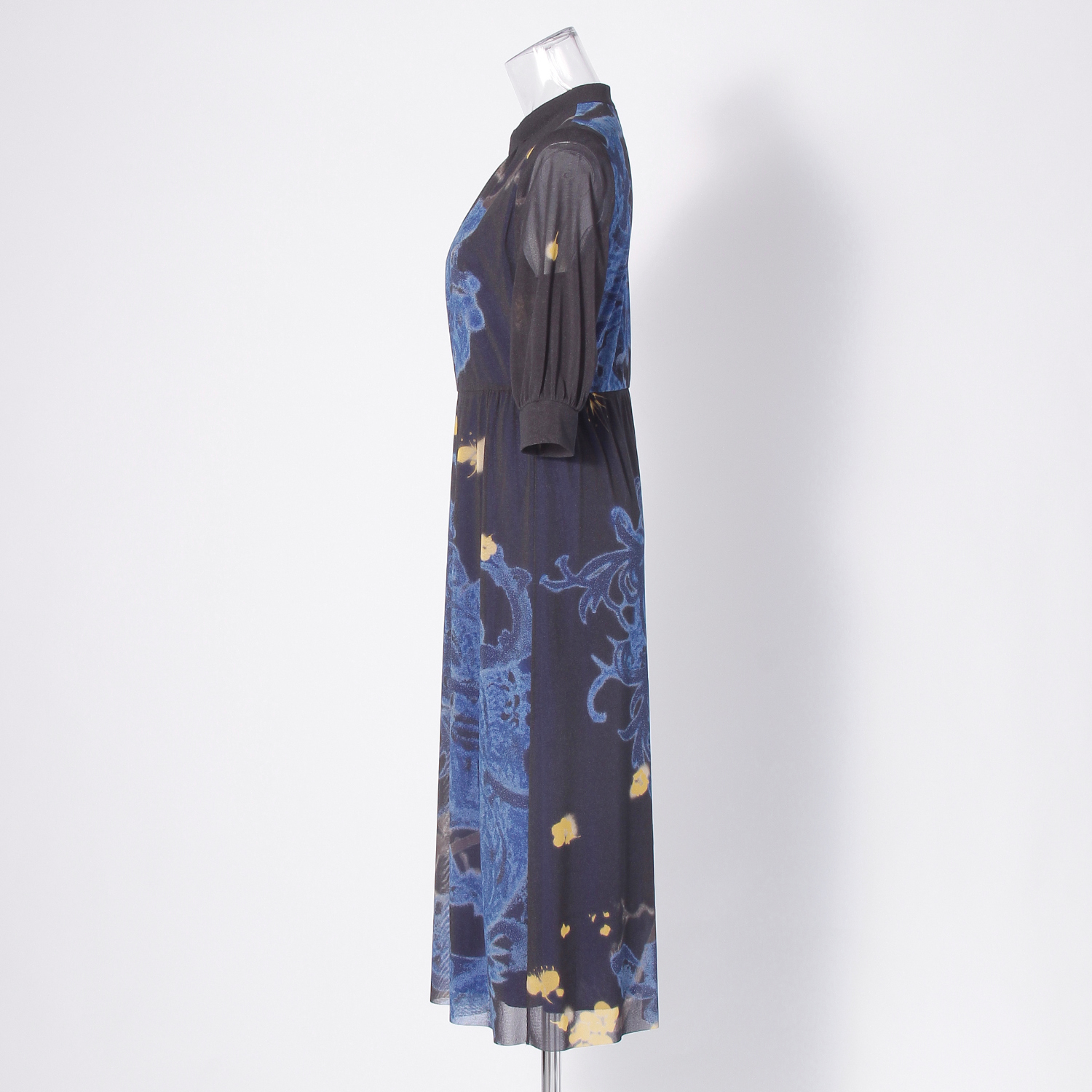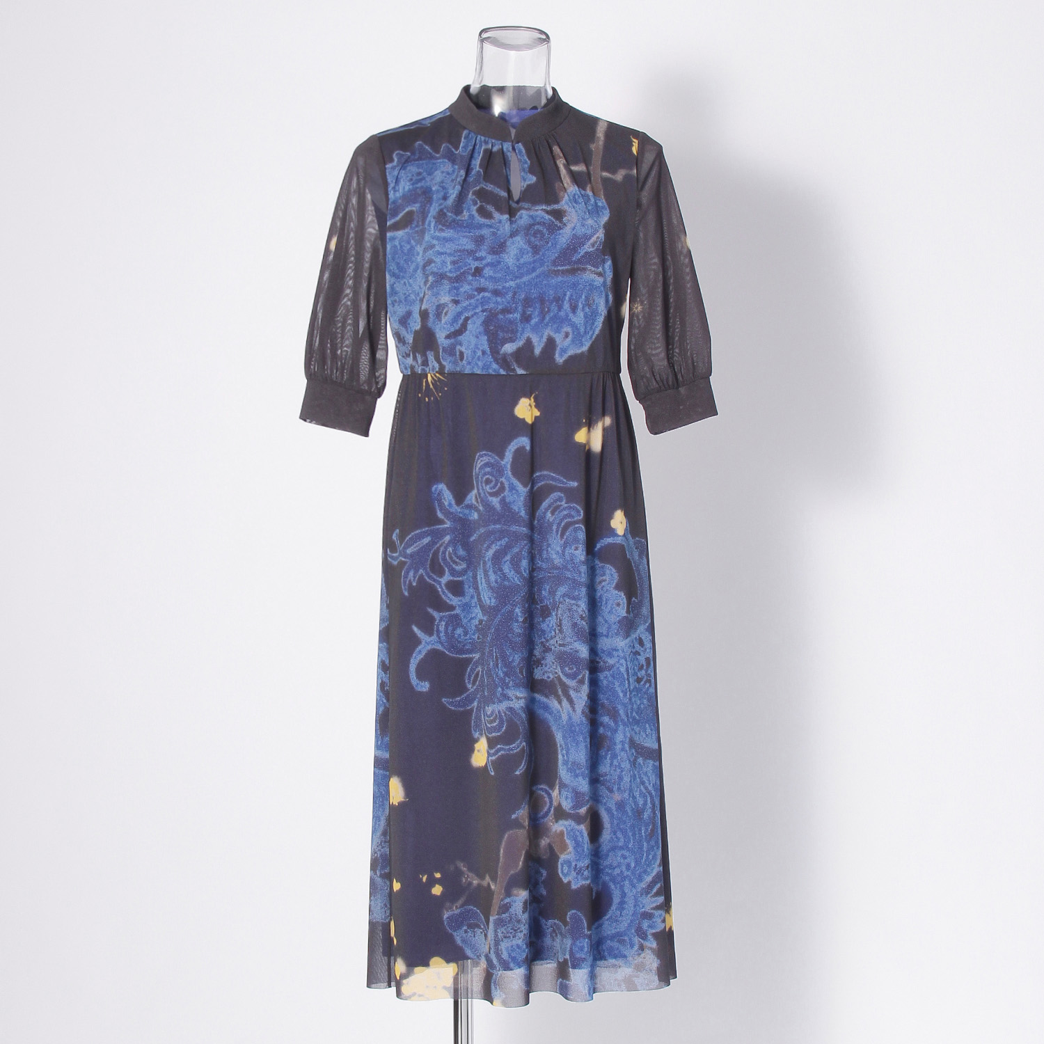 季節を問わずにご着用いただける、スタンドカラーのワンピース。大胆なドラゴンとフェニックスのプリントが映えるよう、あえてシンプルなシルエットに仕上げました。肘がやや隠れる長さのパフスリーブが、上品な印象を演出します。生地にはポリエステル素材を使用し、サラリとした肌触りで着心地も快適。裏地も付いており、1枚で華やかなスタイルが完成するアイテムです。黒を基調としたマルチカラーは、オンラインと一部店舗限定のカラーとなっております。