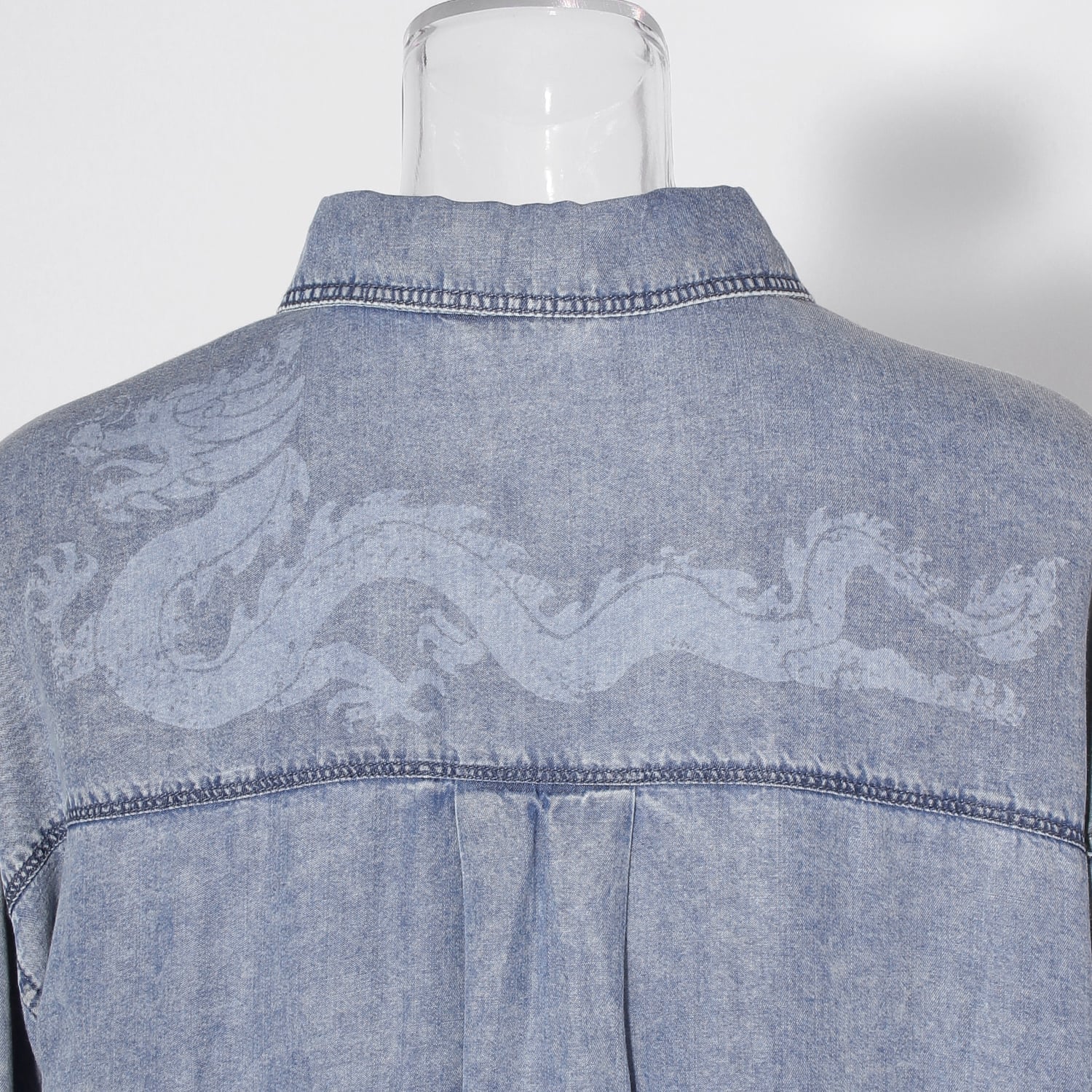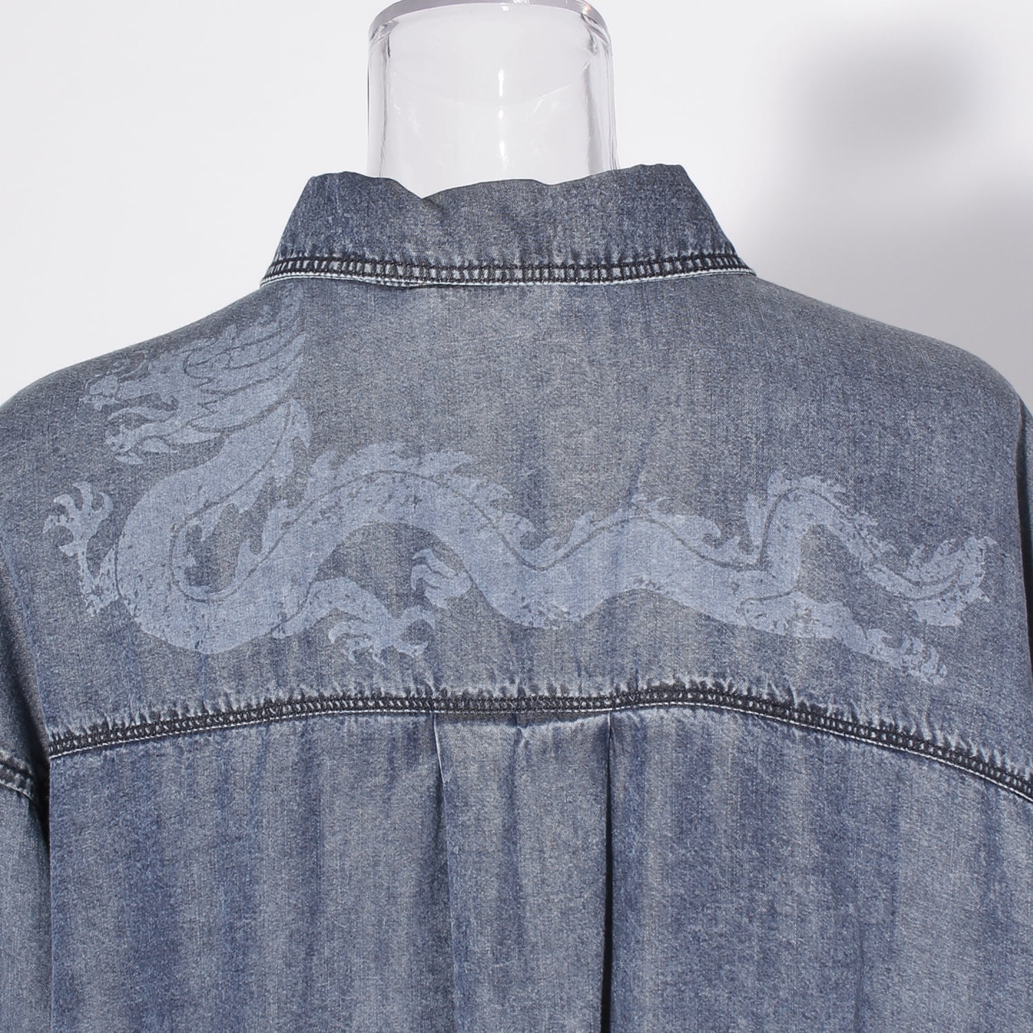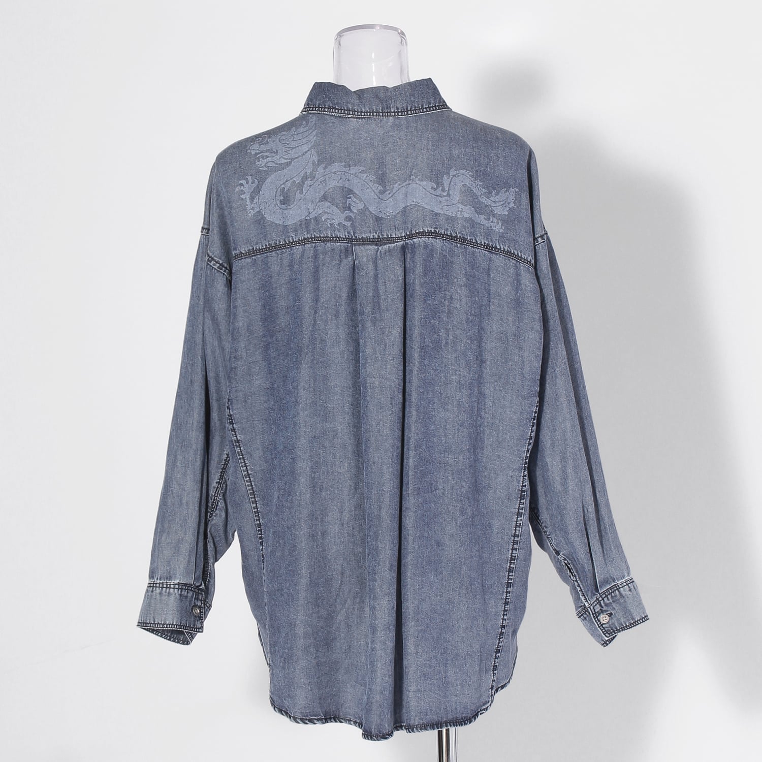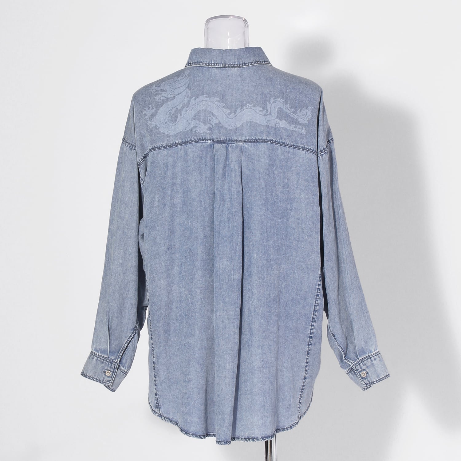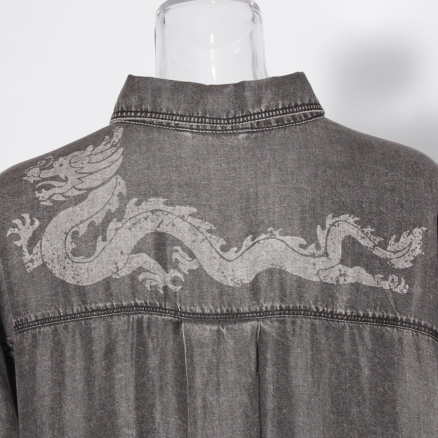 コーディネートにアクセントを添えるブラウス。背中には存在感のあるドラゴンを抜染プリントにて施しました。レーヨン100%素材を使用し、シルクのような自然な光沢と柔らかくしなやかな肌当たりが特徴。吸湿速乾性を備え、汗ばむ季節にも快適です。サッと羽織れる抜き襟型のため、シーズンレスで活躍してくれます。