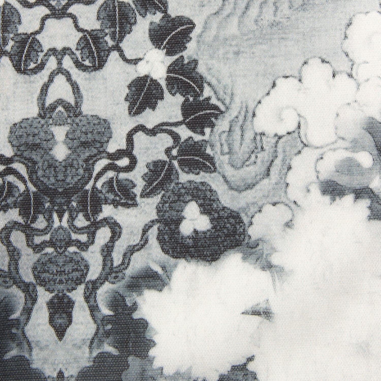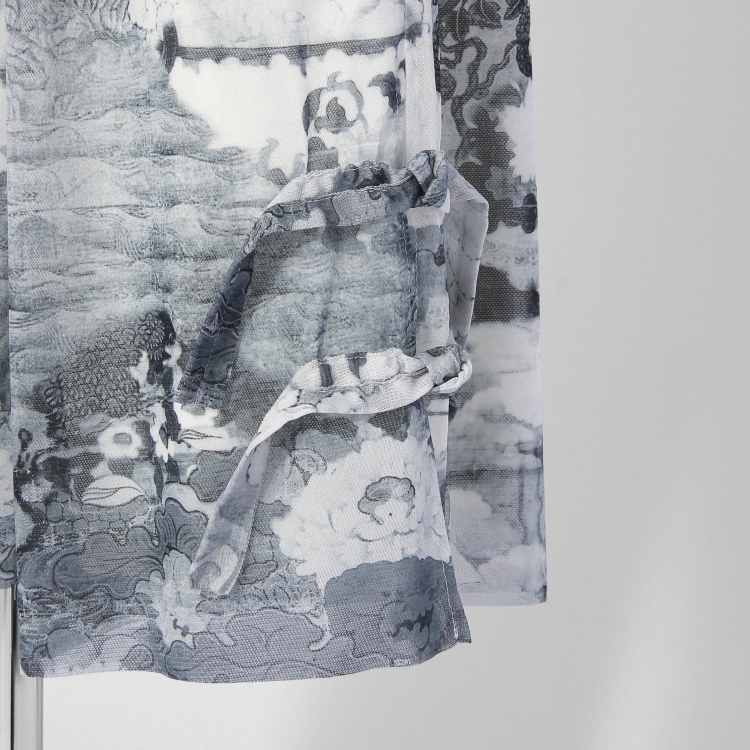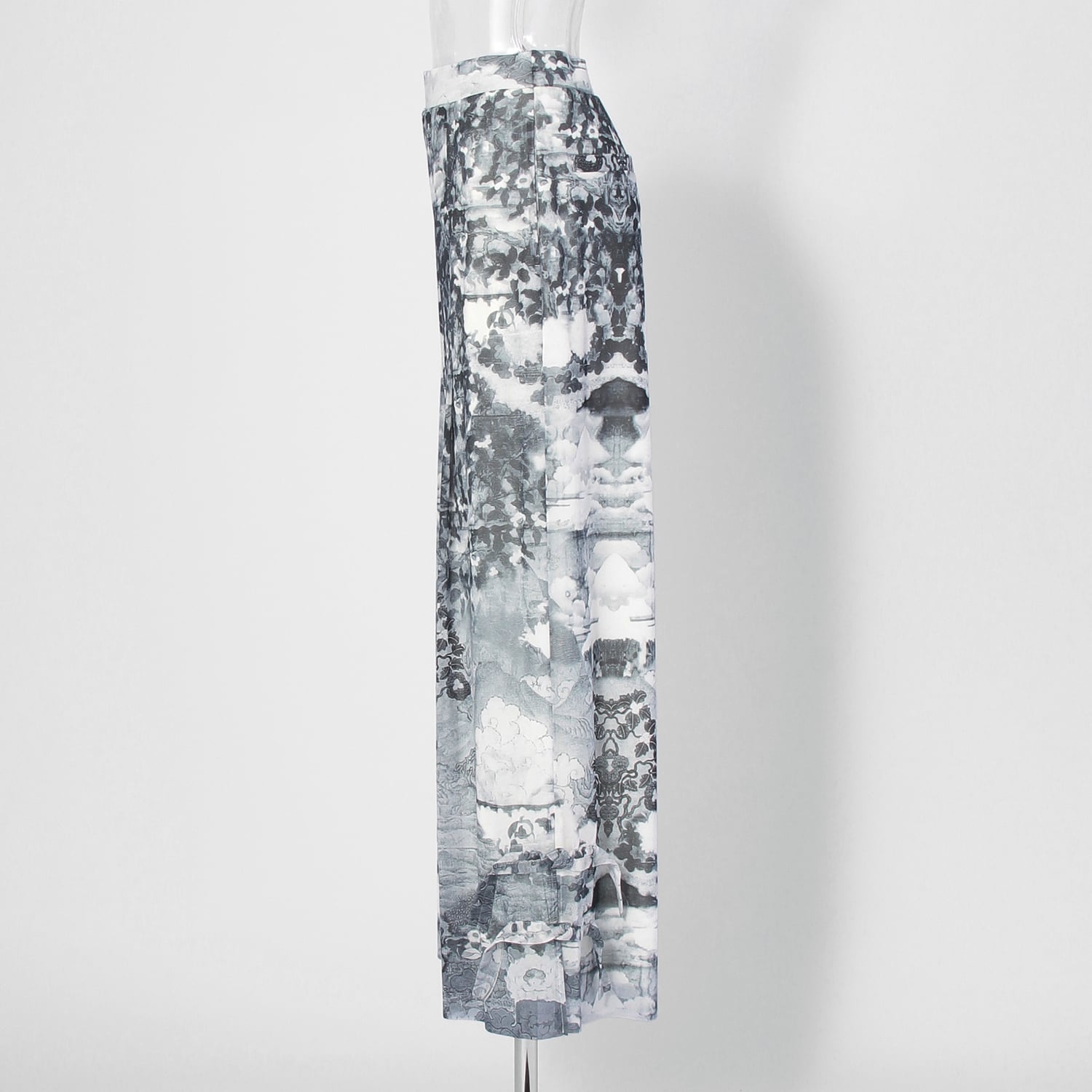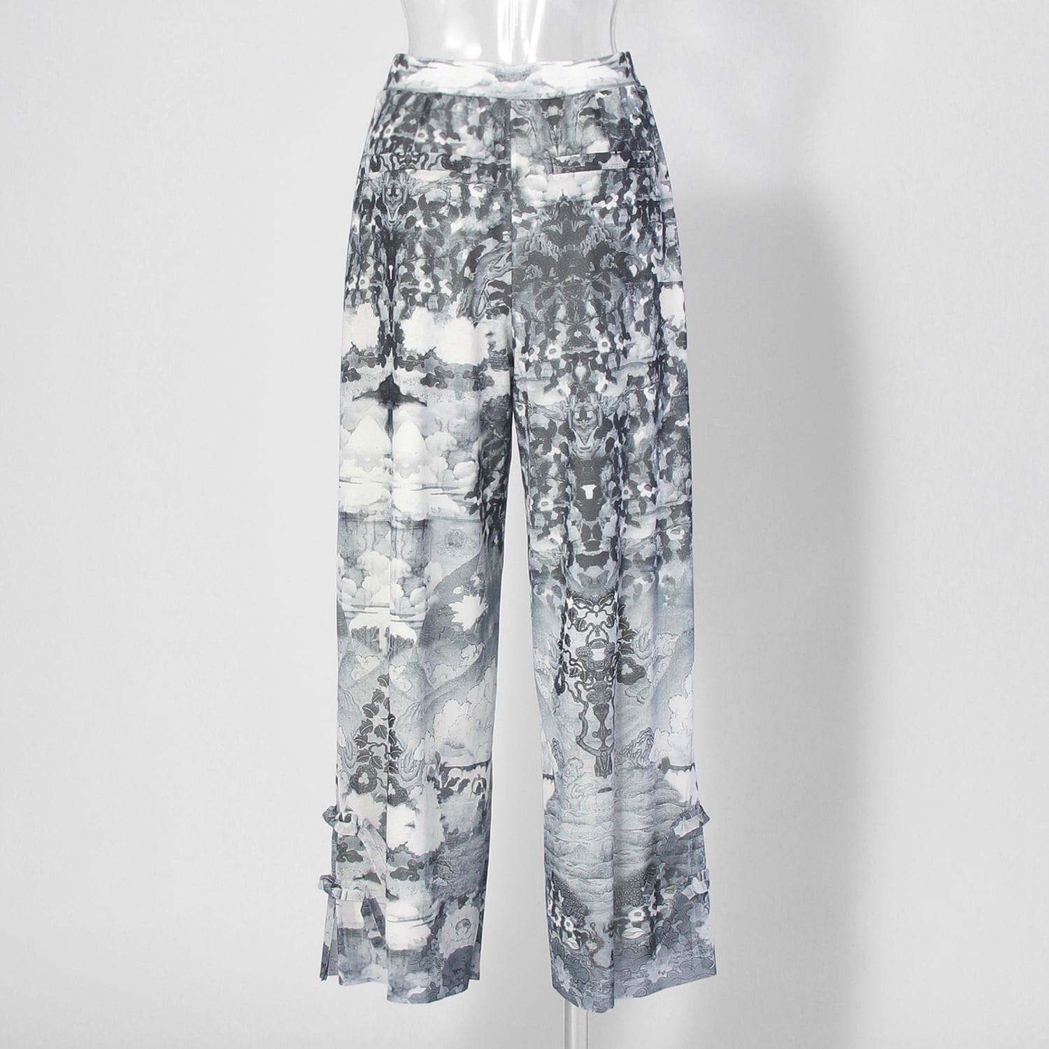 裾にチャイナボタン風のフリンジをあしらったワイドパンツ。モノトーン調で表現された、アーティスティックなプリントデザインが目を引くアイテムです。シンプルなトップスと合わせるだけで、洗練されたスタイリングが完成します。素材にはさらりとした肌触りのポリエステル100%を使用しており、はき心地も快適です。