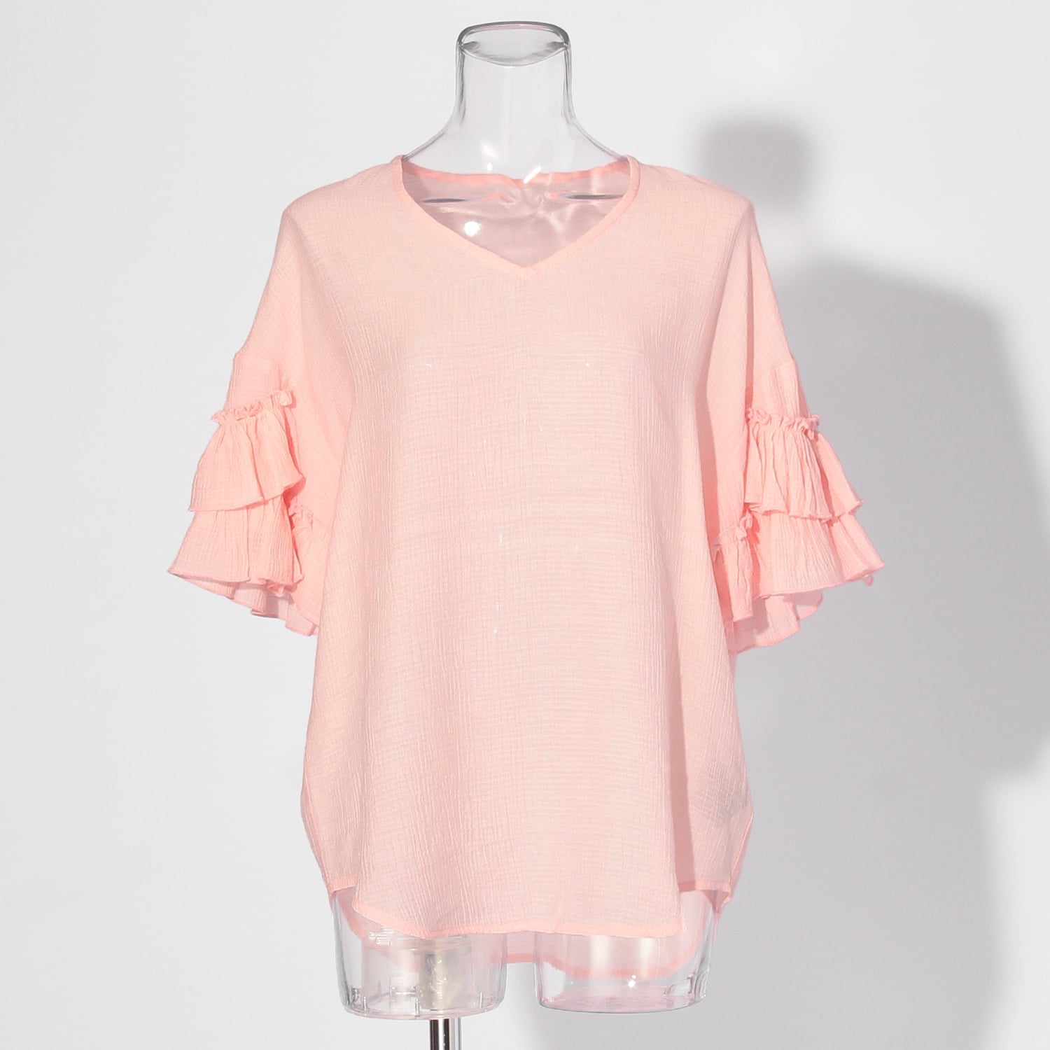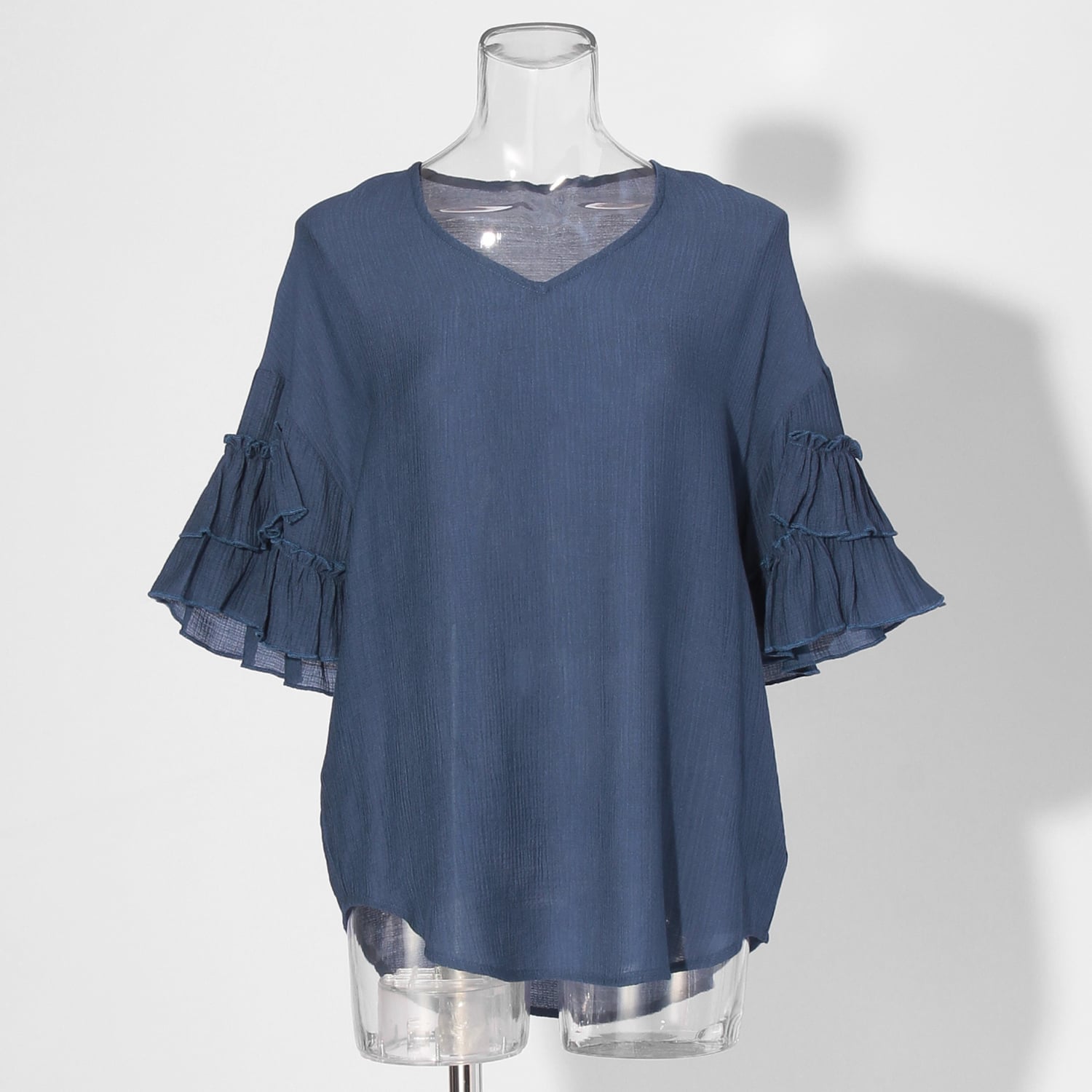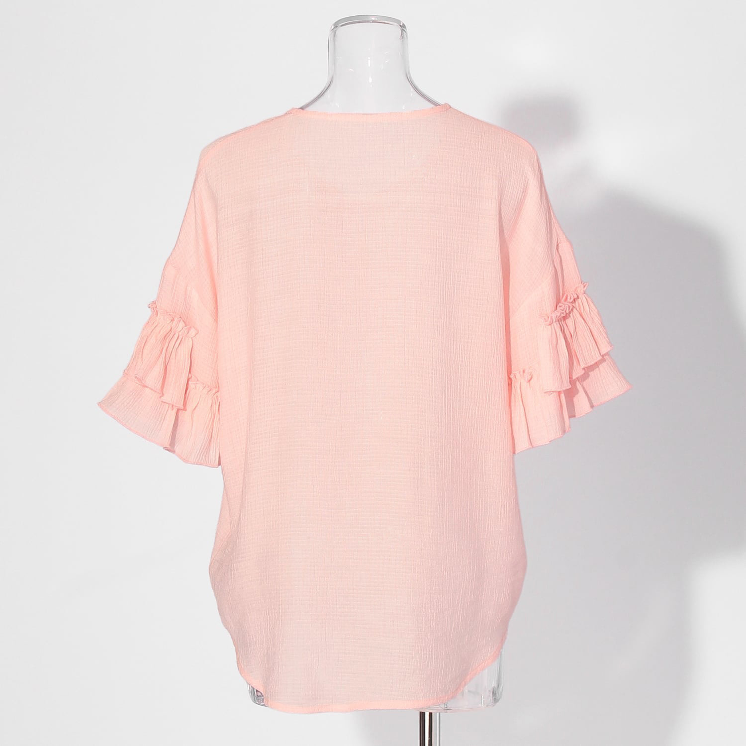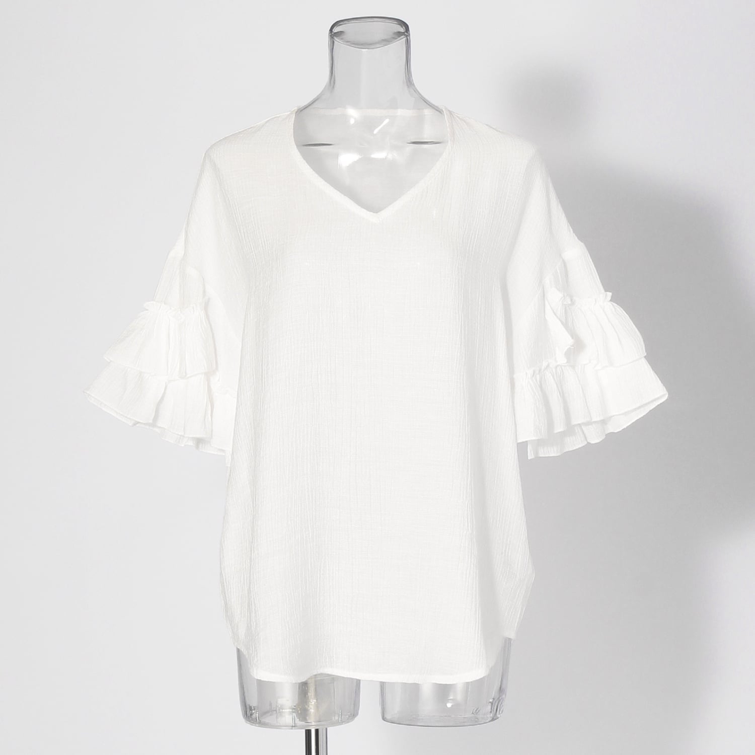 さまざまなボトムスと相性良く合わせられるブラウス。シャープなVネックと華やかなスリーブのフリルデザインが、装いに洗練された印象を与えます。表面に細かいストライプ状の凹凸を持つ、楊柳生地を使用しました。肌離れが良いため、汗ばむ時期でも快適にご着用いただけます。