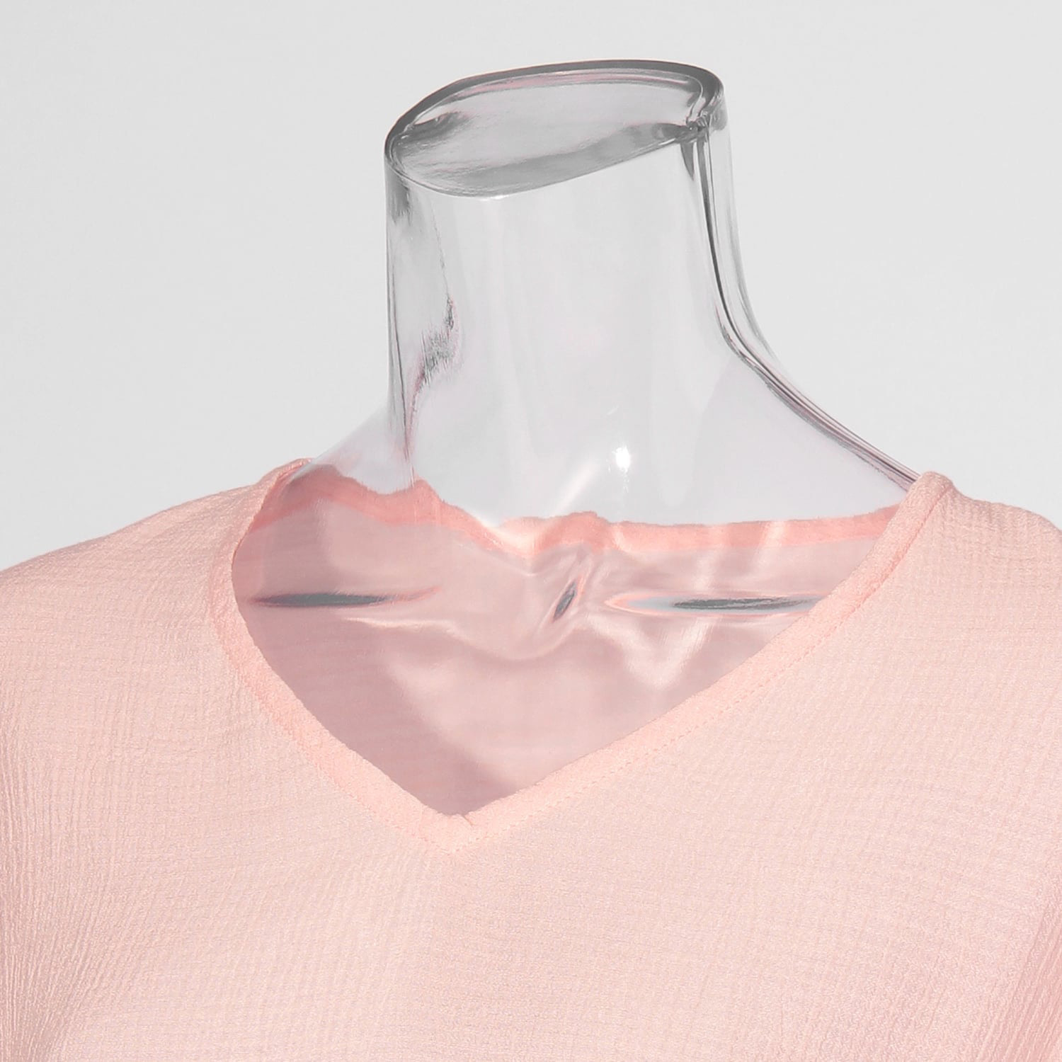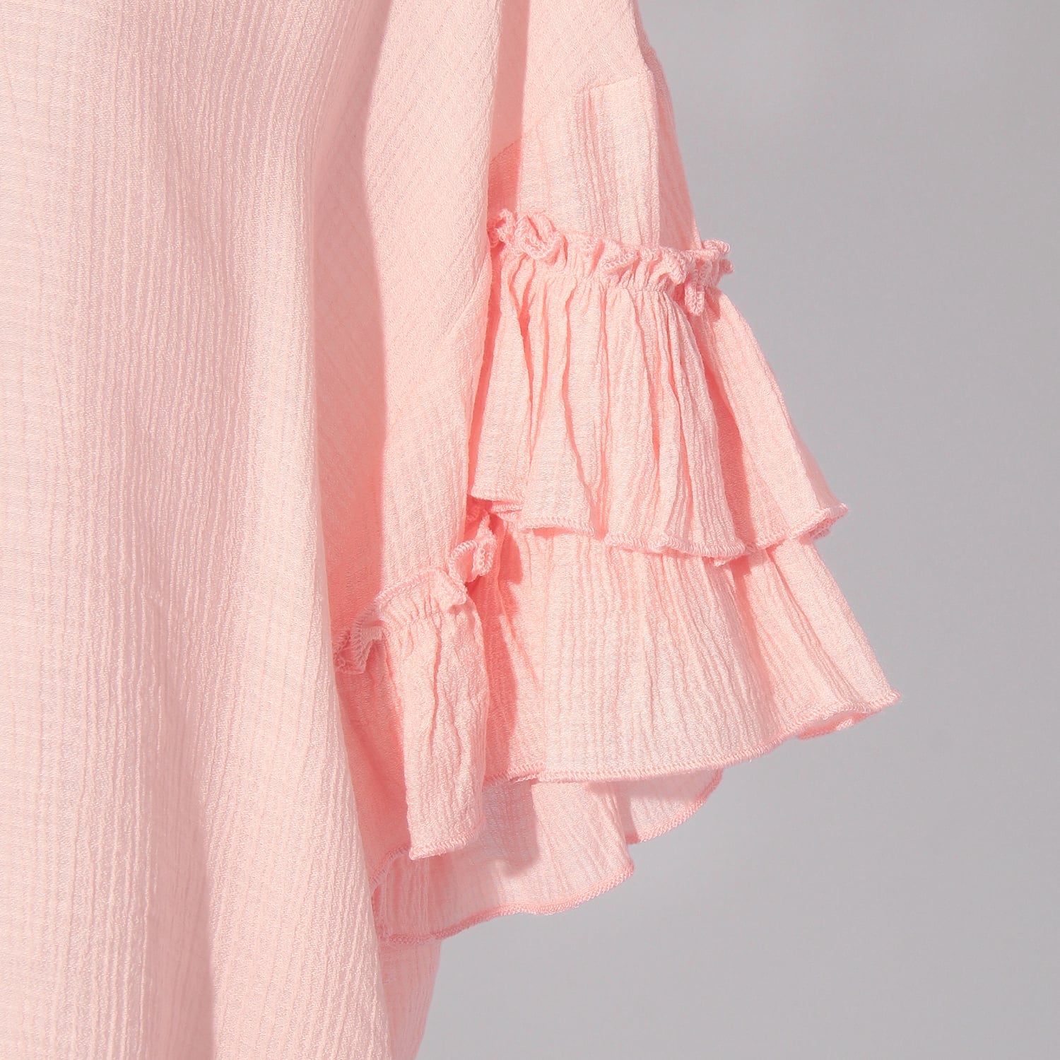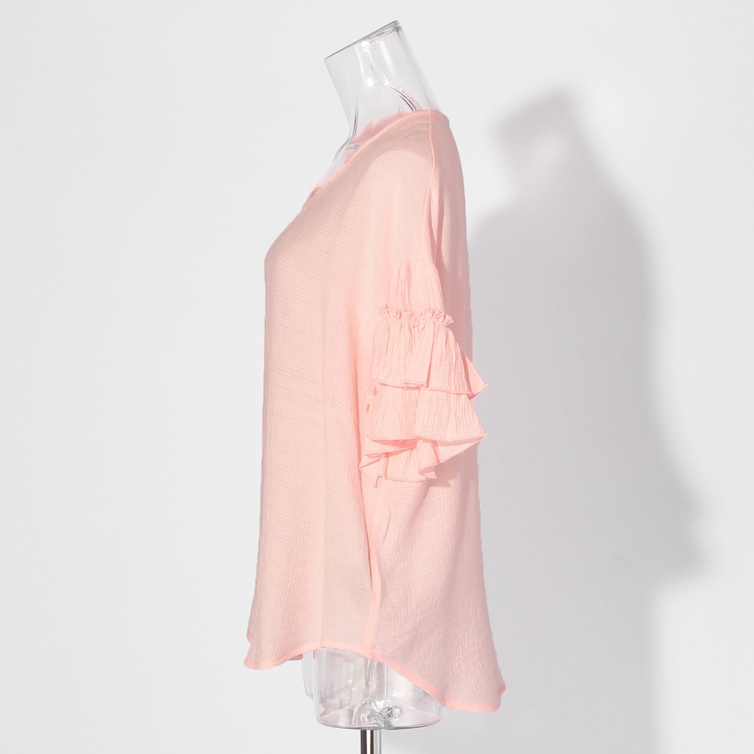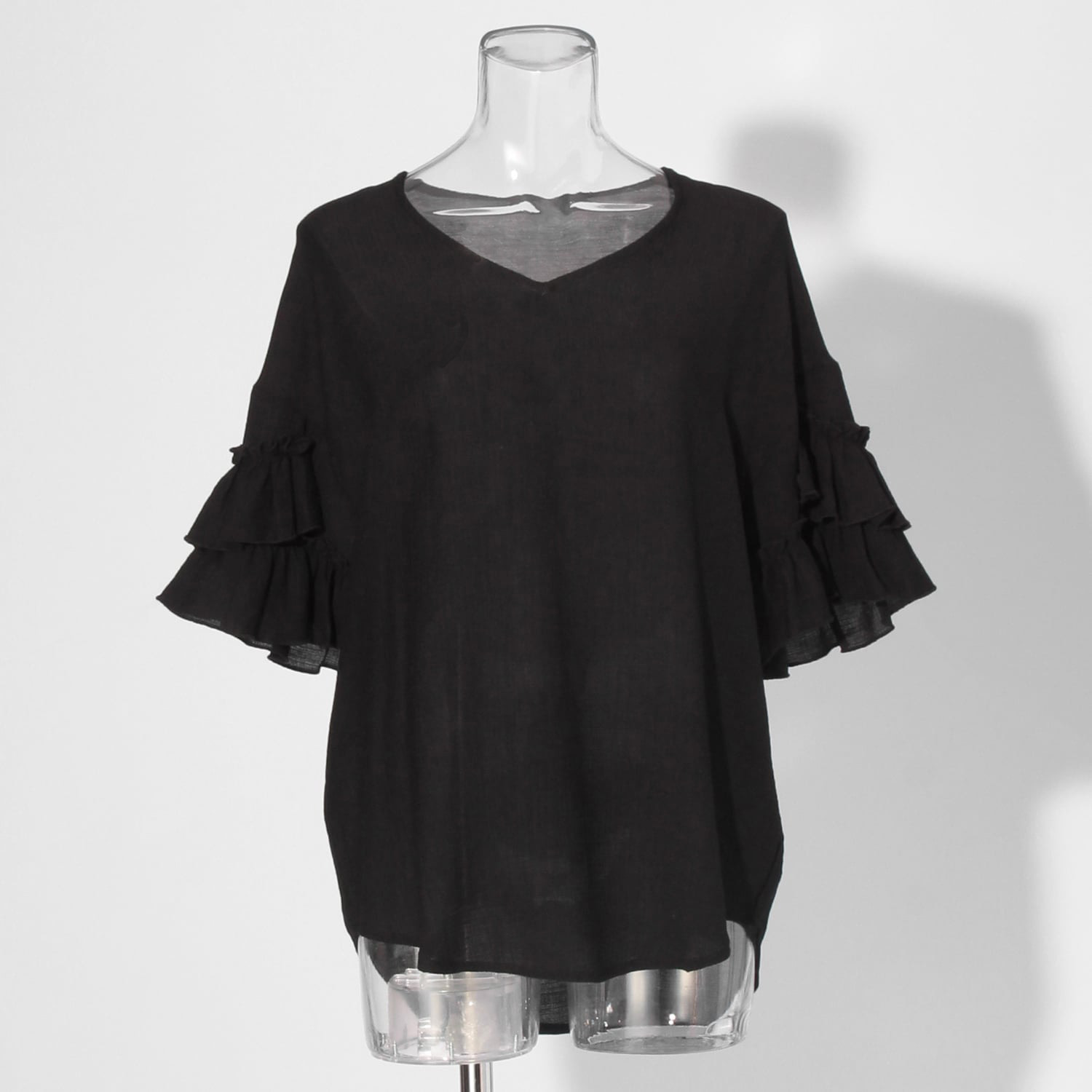 さまざまなボトムスと相性良く合わせられるブラウス。シャープなVネックと華やかなスリーブのフリルデザインが、装いに洗練された印象を与えます。表面に細かいストライプ状の凹凸を持つ、楊柳生地を使用しました。肌離れが良いため、汗ばむ時期でも快適にご着用いただけます。