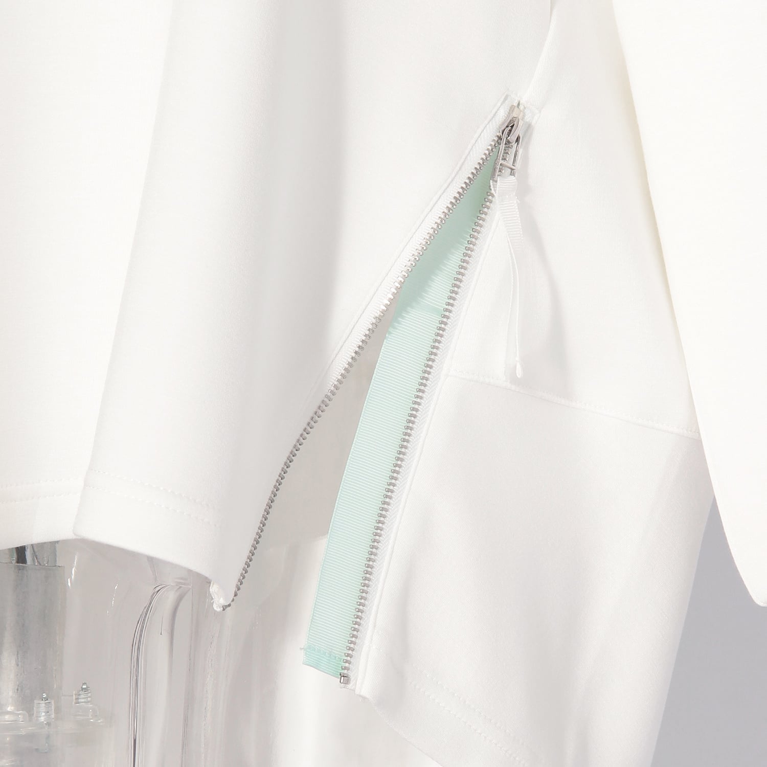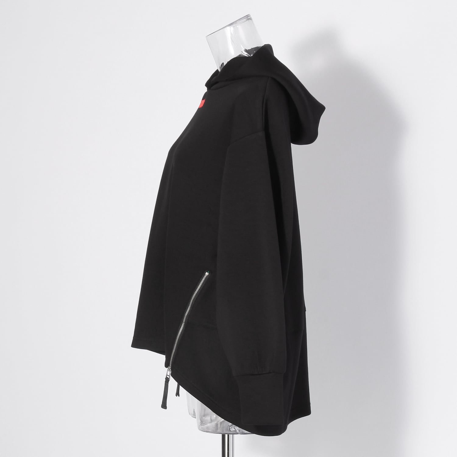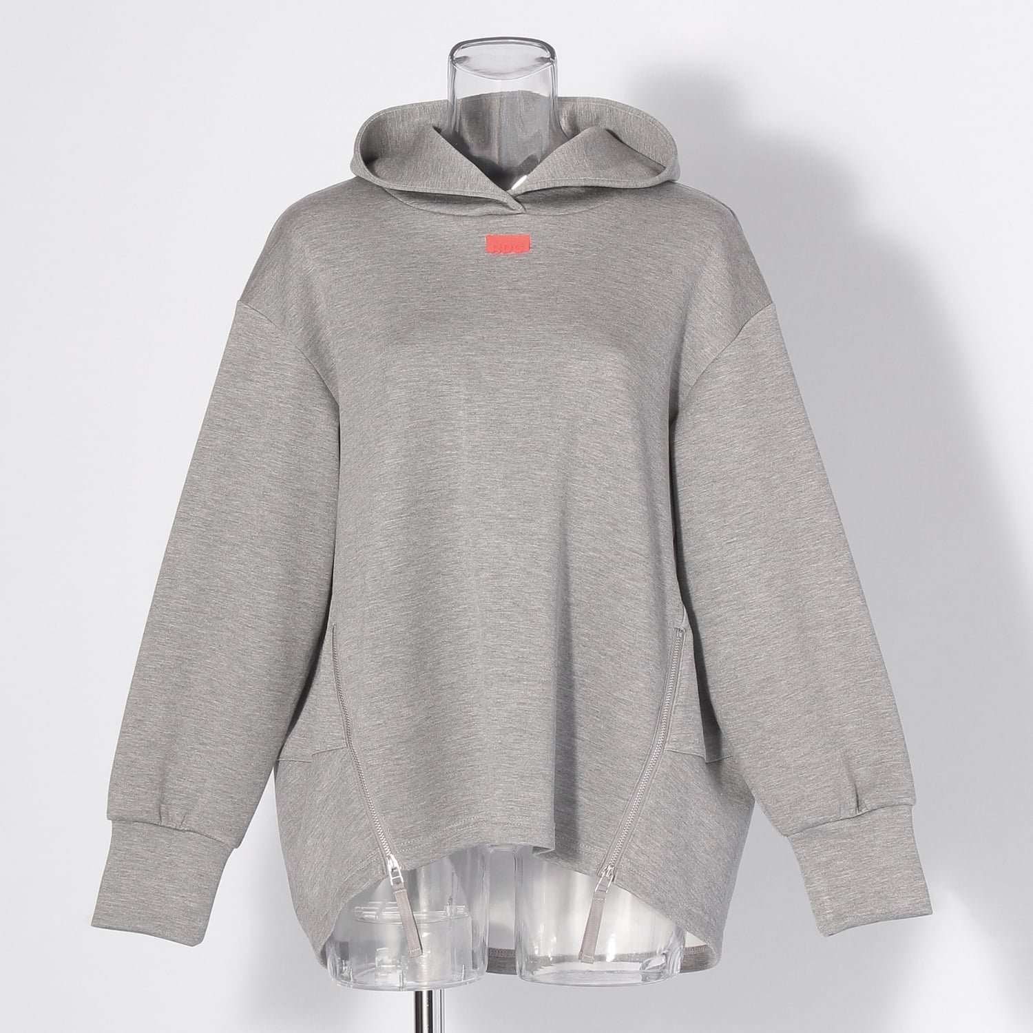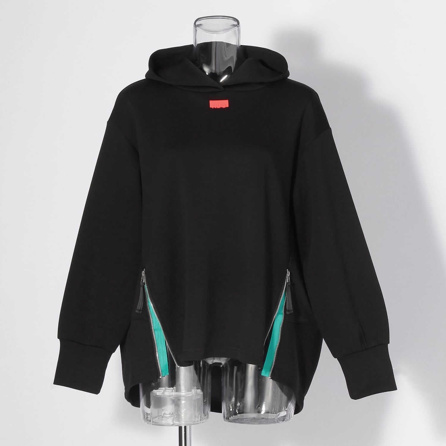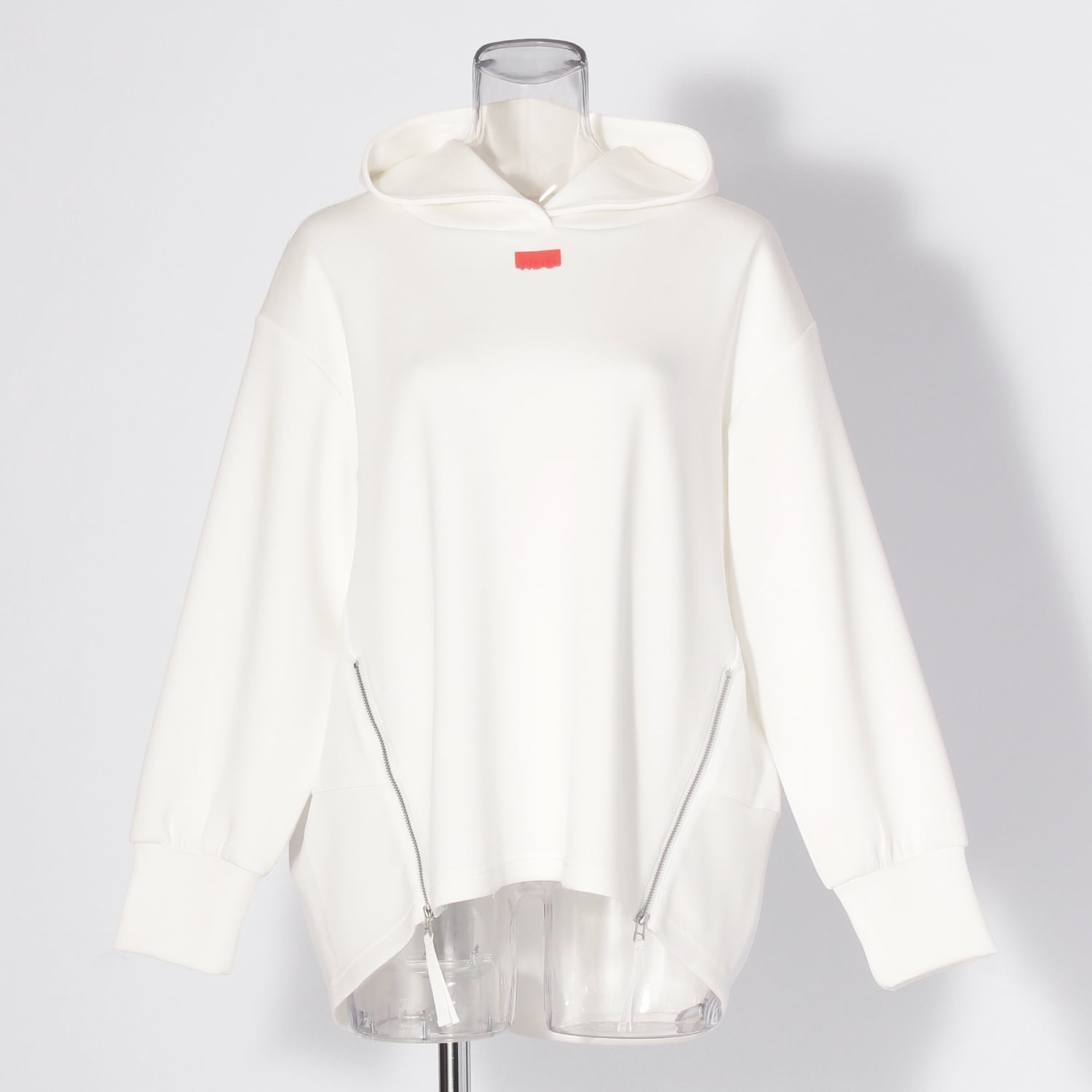 柔らかいダンボール素材で仕立てたコクーンパーカー。肌触りの良い素材で普段使いしやすく仕上げました。フロントにあしらわれたピスネームと、裾や脇に施された配色のファスナーがアクセント。脇のファスナーを開ければ配色が覗き、さりげなく差し色を加えることもできます。