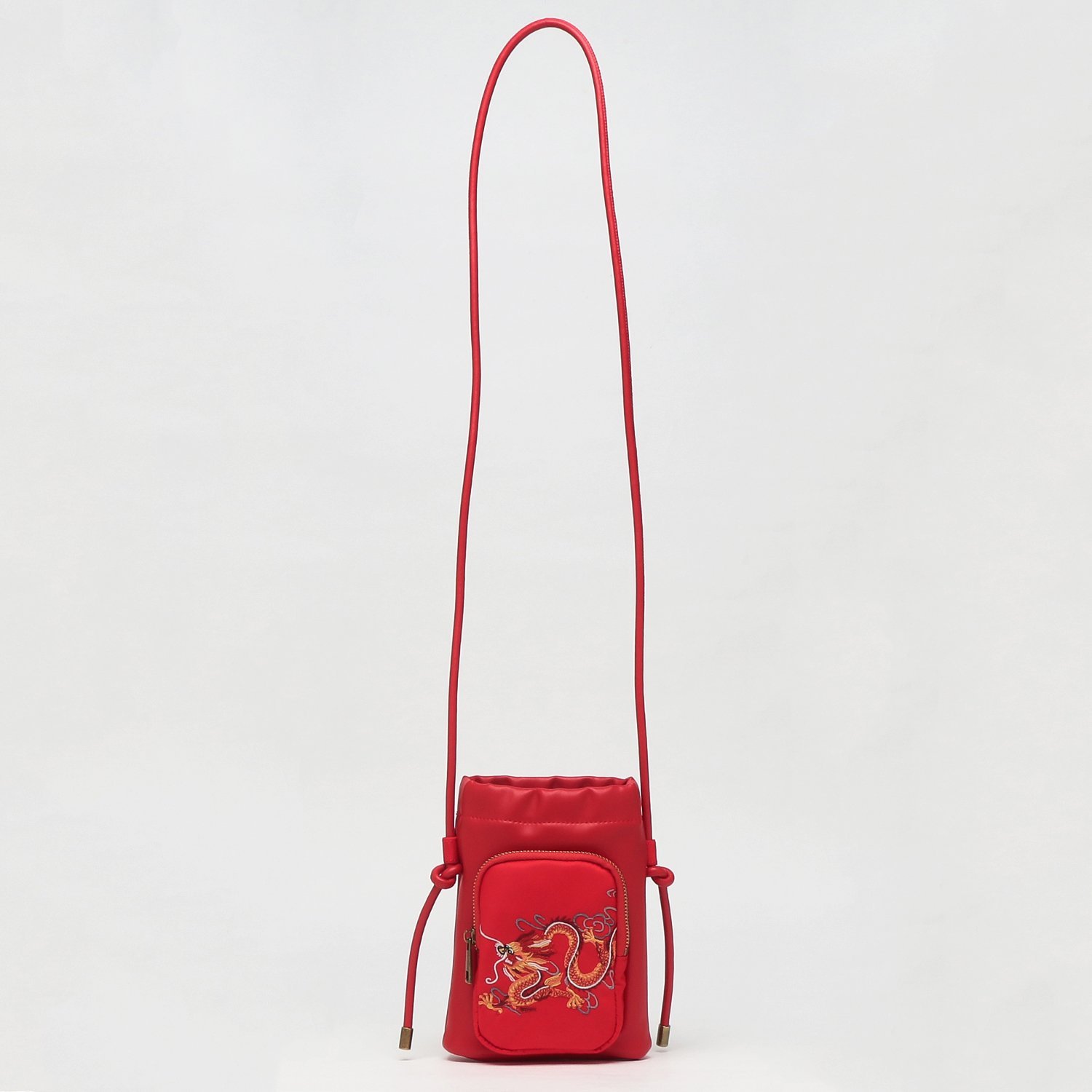 躍動感のあるドラゴンの刺繍が目を引くミニショルダーバッグ。軽い持ち心地が魅力の合皮とポリエステル素材を組み合わせた仕立てで、実用性にもしっかりと配慮しました。スマートフォンやお財布といった必需品がすっきりと入るサイズのため、ワンマイルのお出掛けからショッピングまで幅広く活躍する1品です。
