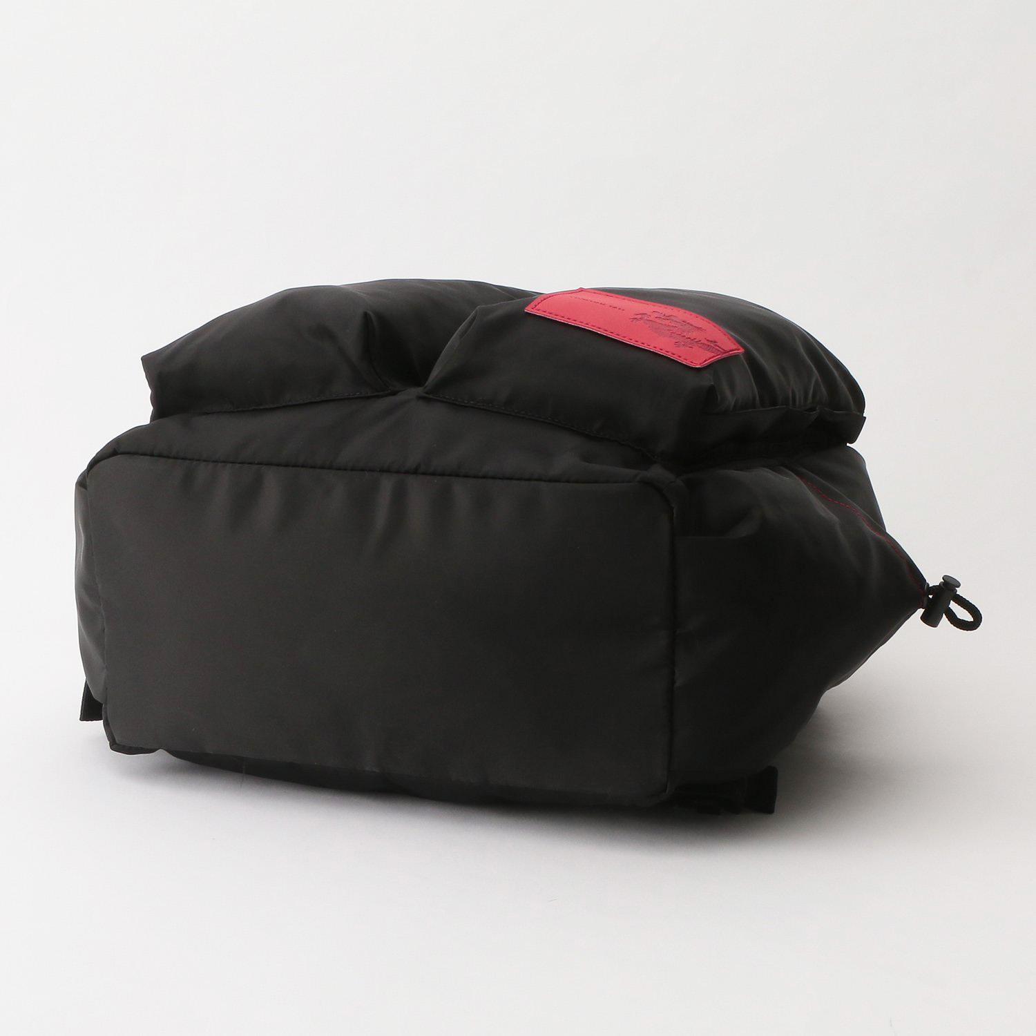 シーンを選ばず活躍する、リュックタイプのバッグ。リュックとしてはもちろん、手提げとしても使えるデザインで、カジュアルになりすぎず落ち着いた印象を演出します。A4サイズがしっかり収まる収納力で、通勤やお出かけなど幅広い場面に対応。開口部はコードで絞れる巾着スタイルを採用し、さりげない個性と使いやすさを兼ね備えています。ステッチ、ピスネームに合わせたレッドカラーのパッチはオンライン先行発売。スウェード調のため大人っぽい雰囲気です。