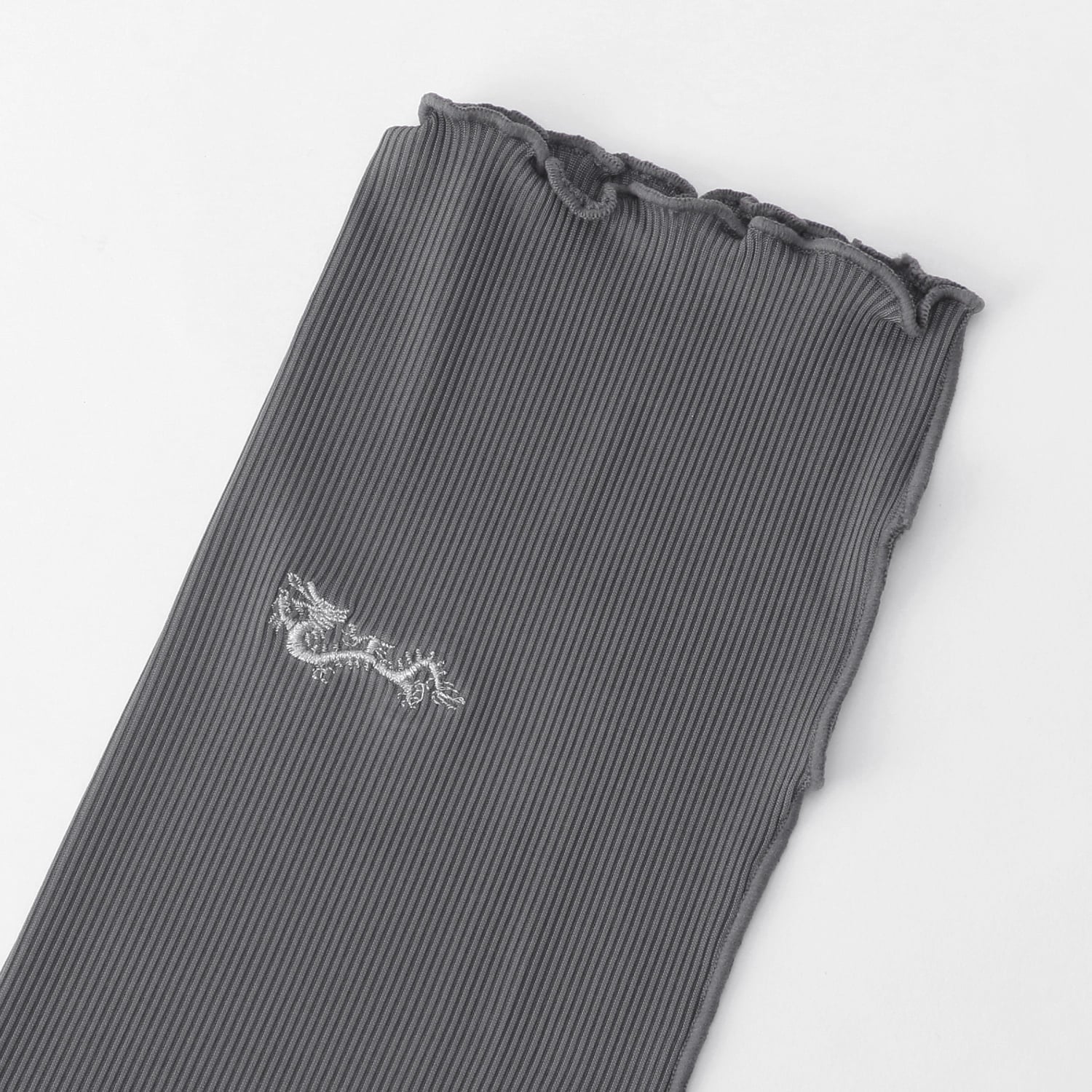 機能性とデザイン性を両立したアームカバー。袖口には、VIVIENNE TAMを象徴するドラゴン刺繍をワンポイントであしらいました。UVカット機能と接触冷感を備えており、毎日の外出時に重宝するアイテムです。生地にはレーヨンとポリウレタンのブレンド素材を使用。さらりとした涼やかな肌触りで、つけ心地も快適です。