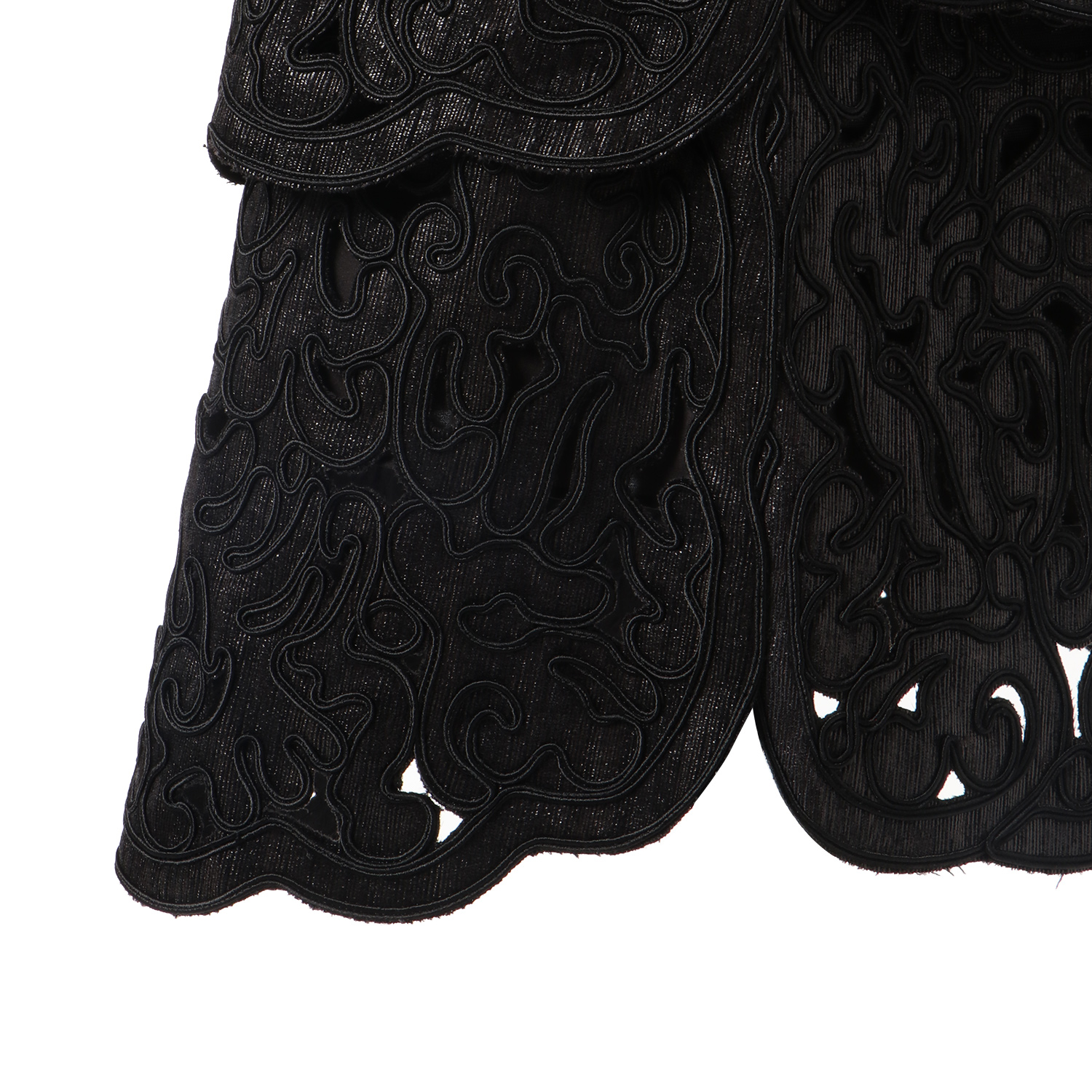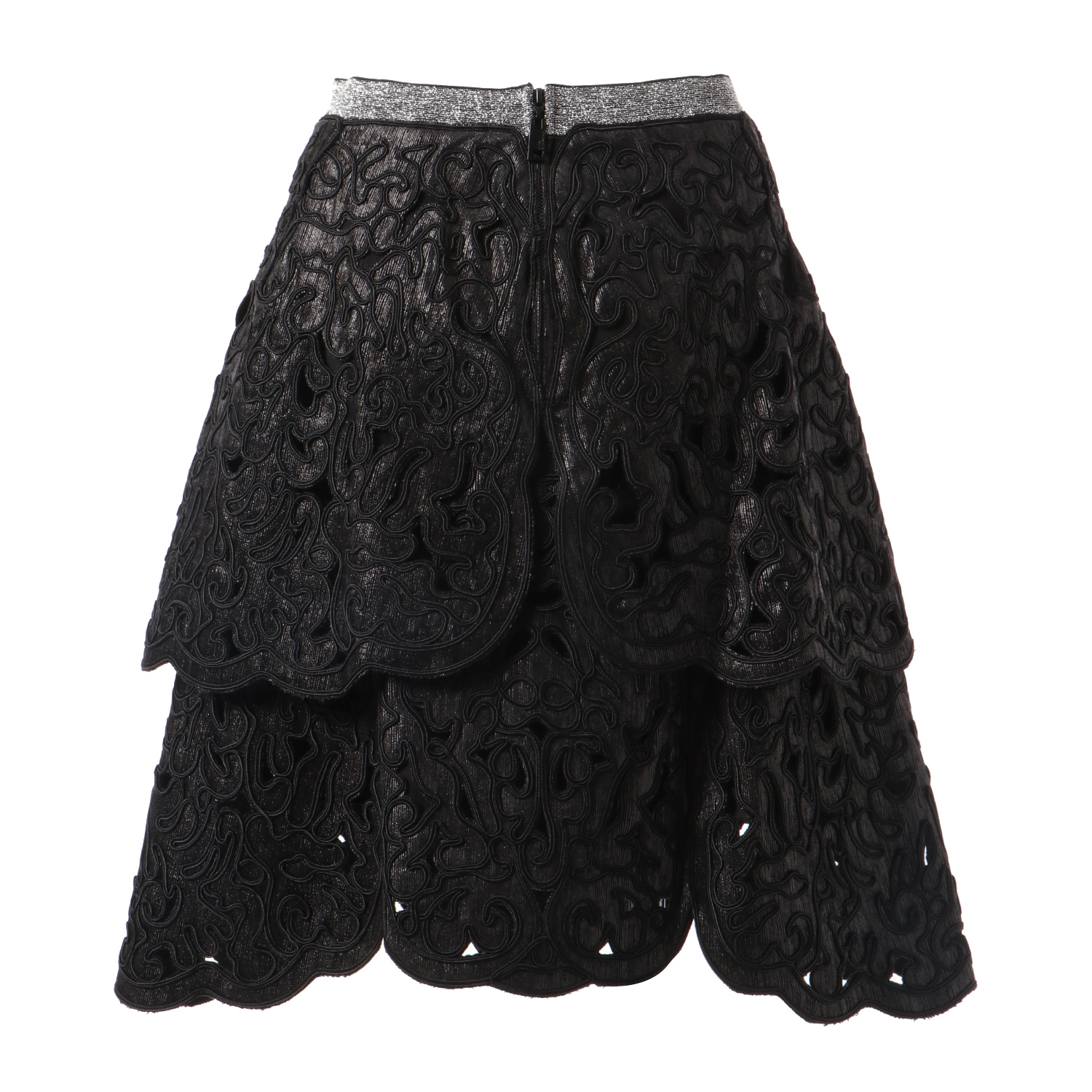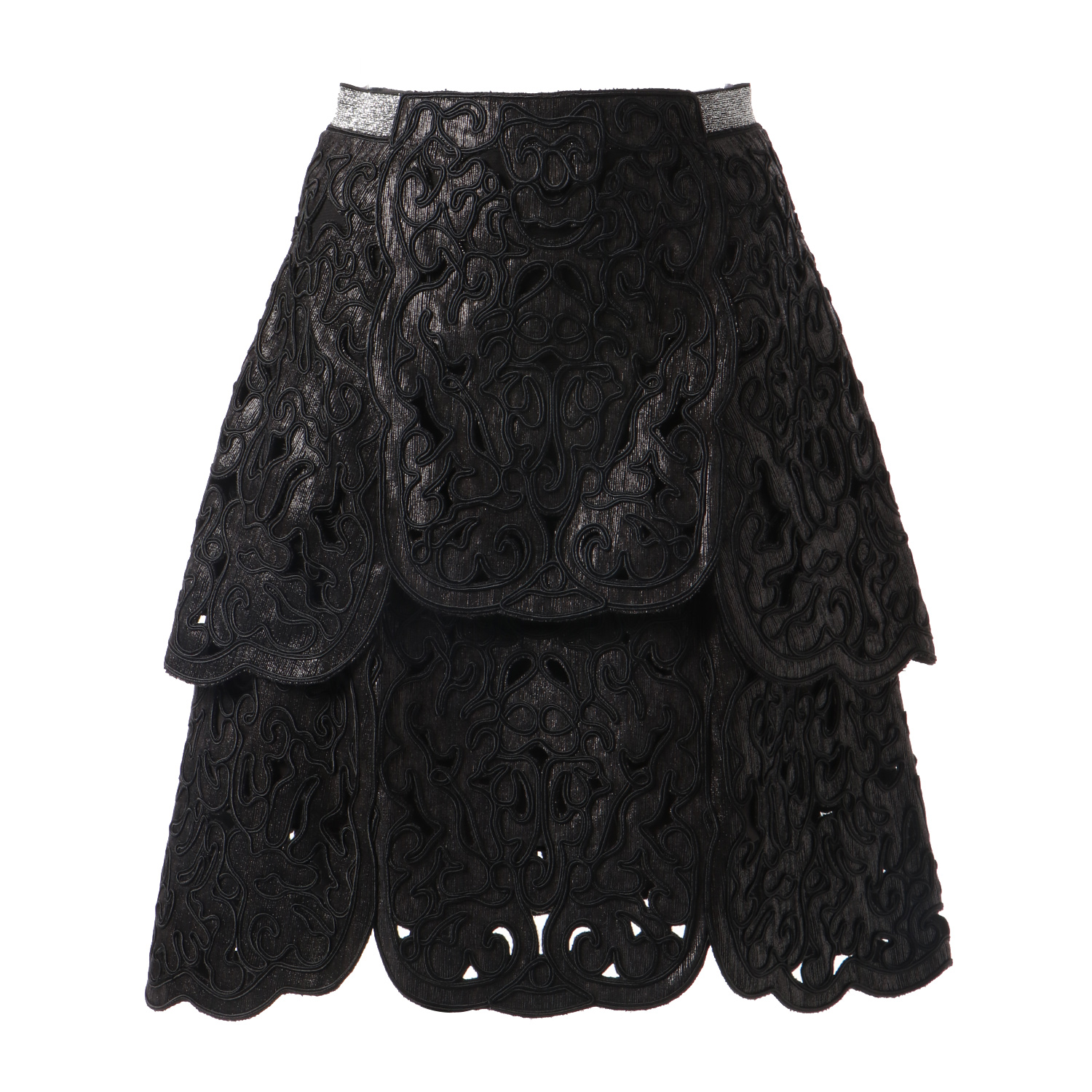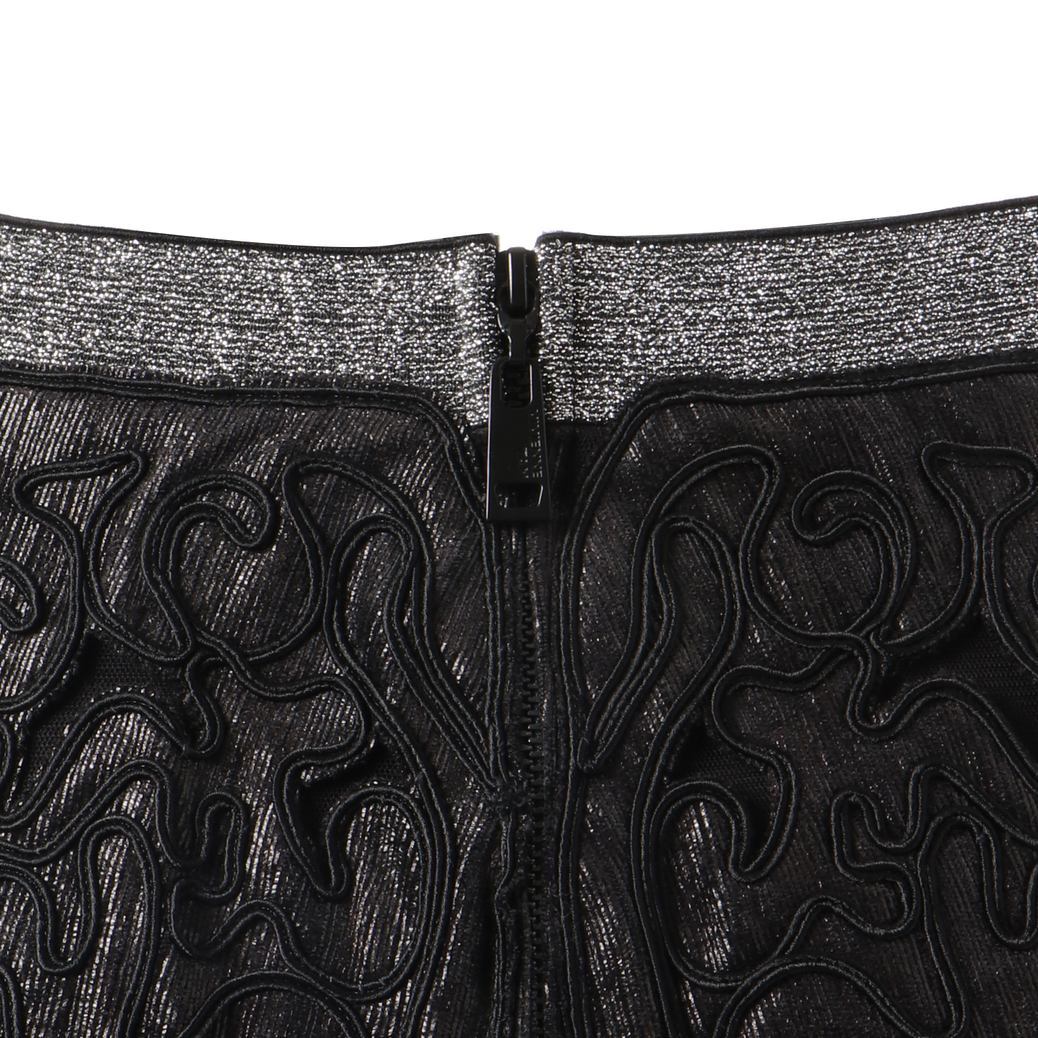 鎧を彷彿とさせる、武骨な存在感を放つスカートです。落ち着いたワントーンの色合いながら、立体的な装飾が独特の雰囲気を放ちます。ウエストゴムに加え、バックにファスナーが付いているため着心地も快適。ギャザーやフリルなどを備えた、女性らしいトップスを合わせて甘辛なスタイルを楽しむのもおすすめです。