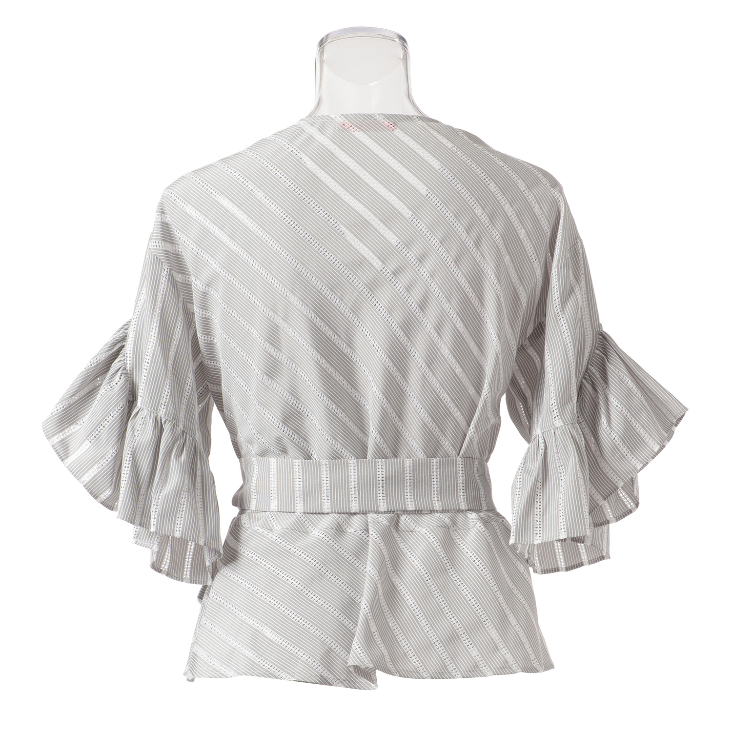 女性らしさ引き立つカシュクールデザインのブラウス。ゆったりとしたフレアスリーブや、メリハリのあるボディラインを演出するリボンベルトがポイントです。端正なストライプ柄を用いてデザイン性を持たせた、ブランドならではのこだわりを感じる1枚。美しい色彩のアップリケは取り外し可能です。