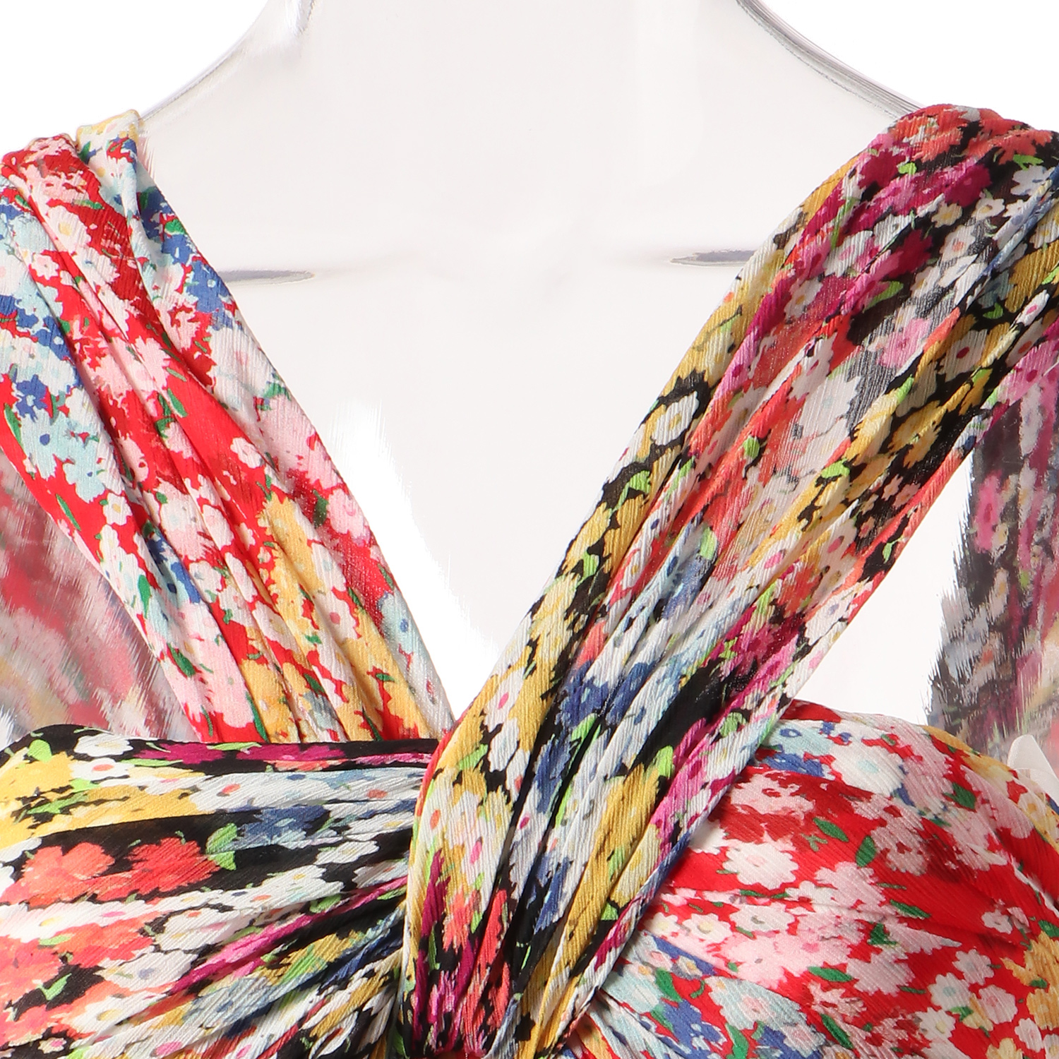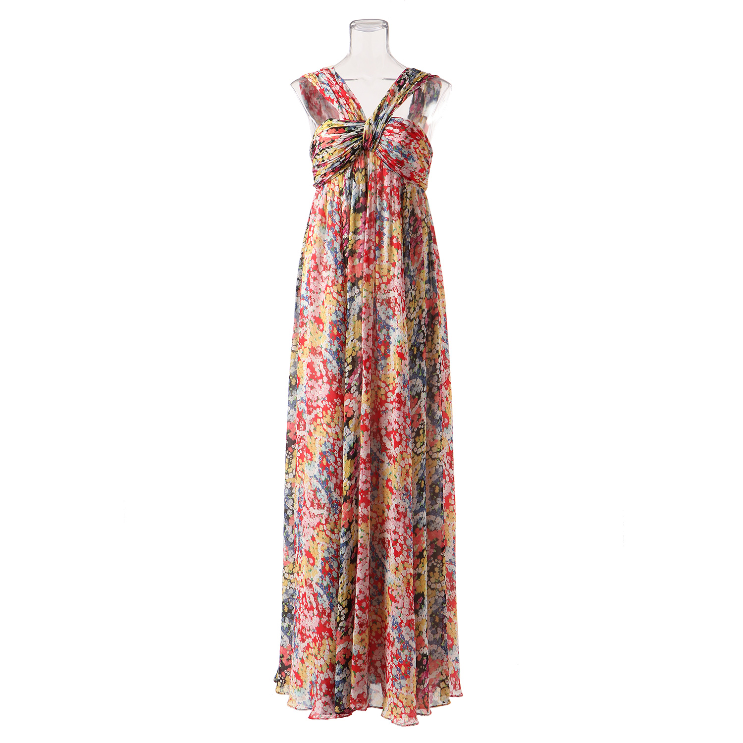 サークル型にあしらったリズミカルなフラワー柄がポイントのドレス。トップにボリュームを持たせることで美しい胸のラインを演出すると共に、スタイルアップ効果が期待できます。たっぷりと生地を用いたフレアシルエットで優雅な雰囲気を演出。リゾートシーンに映える色彩豊かな1枚です。